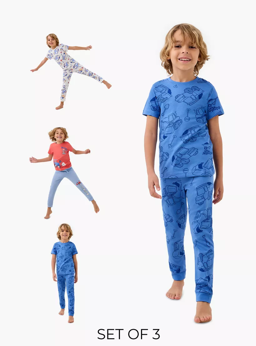 Complete Set – Includes 3 matching T-shirts and pyjama bottoms in fun, eye-catching prints.