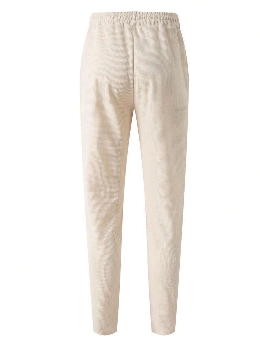 1 Set Men Solid Color Waffle Fabric Short Sleeve Zip Collar Polo Shirt + Long Pants 2-Piece Suit
