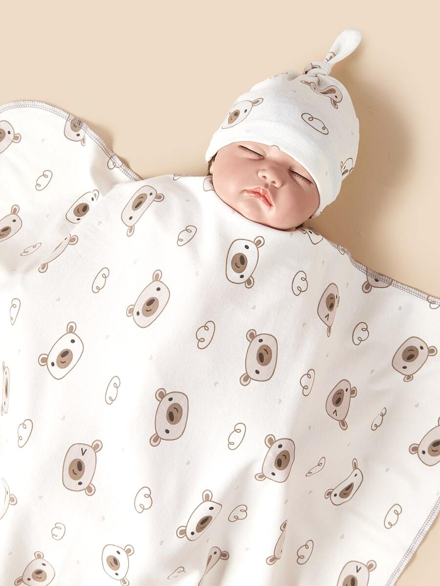 / 1pc Baby Bear Pattern Swaddling Blanket & 1pc Hat Love Valentine
