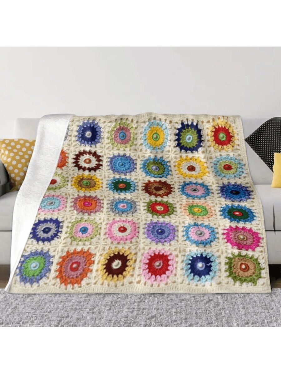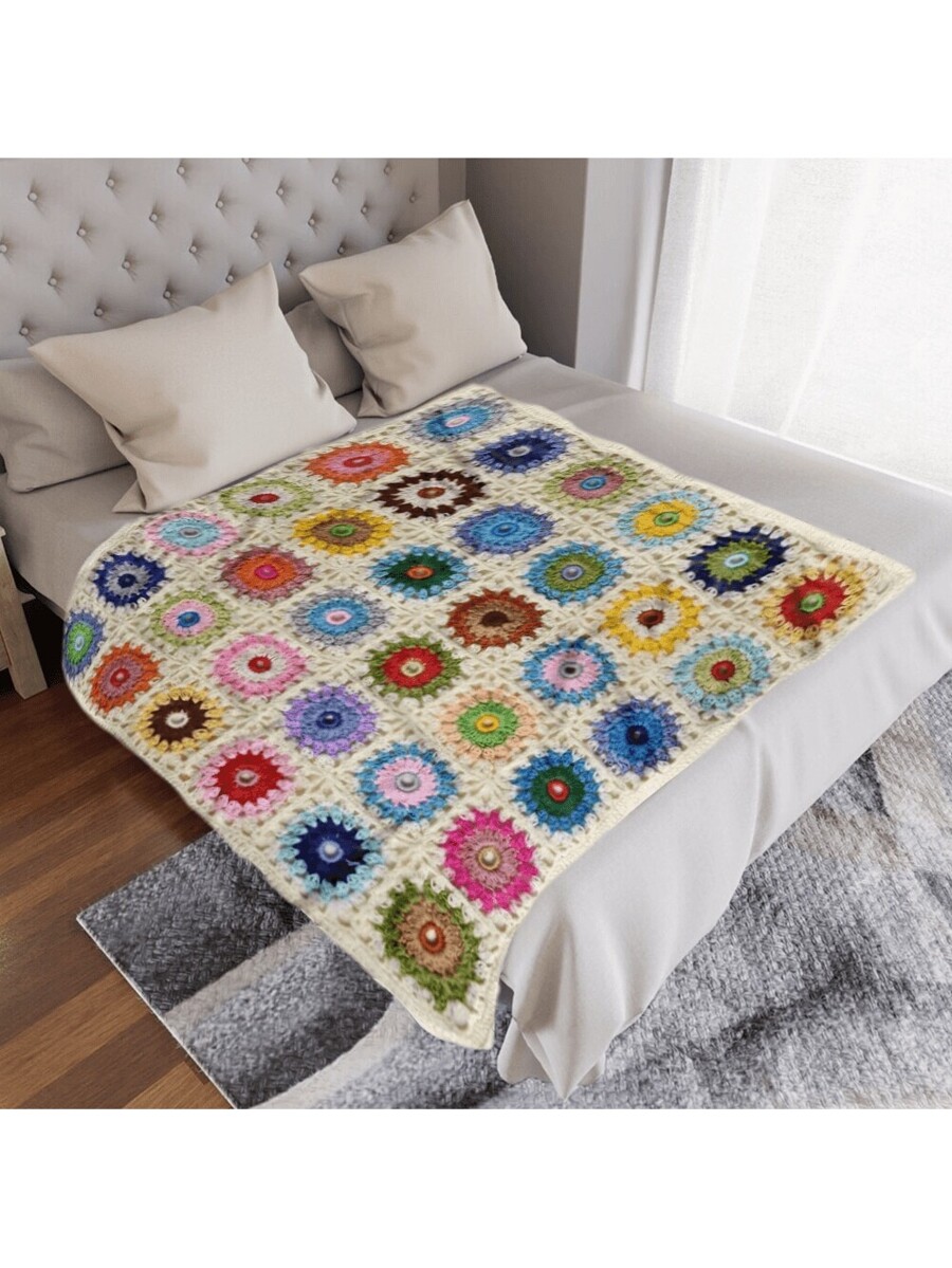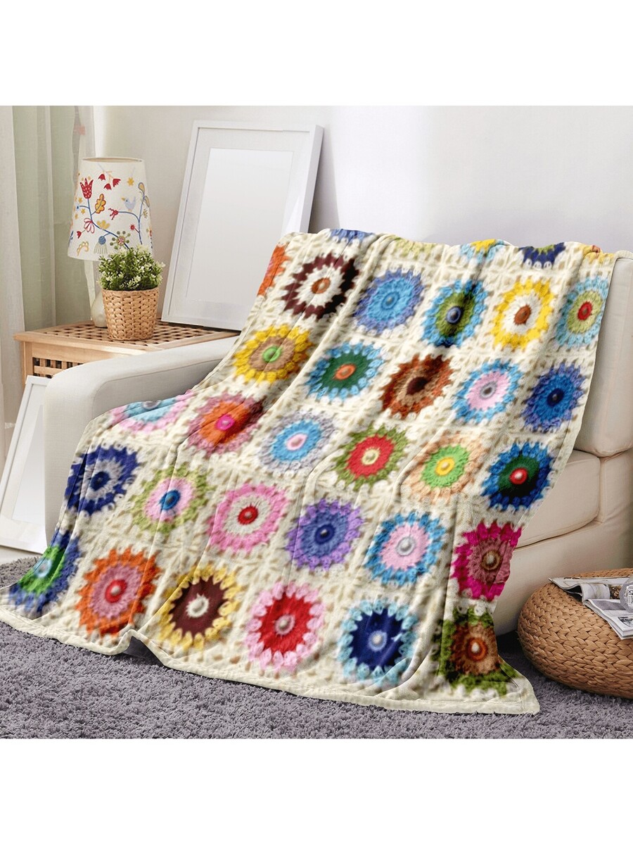 / 1pc Of Boho Crochet Flower Blanket, Soft And Comfortable Travel Blanket Made Of 100% Polyester