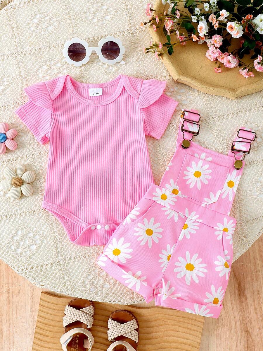 • Adorable Design: This two-piece set includes a charming short-sleeve romper paired with stylish suspender pants, perfect for a cute summer look.