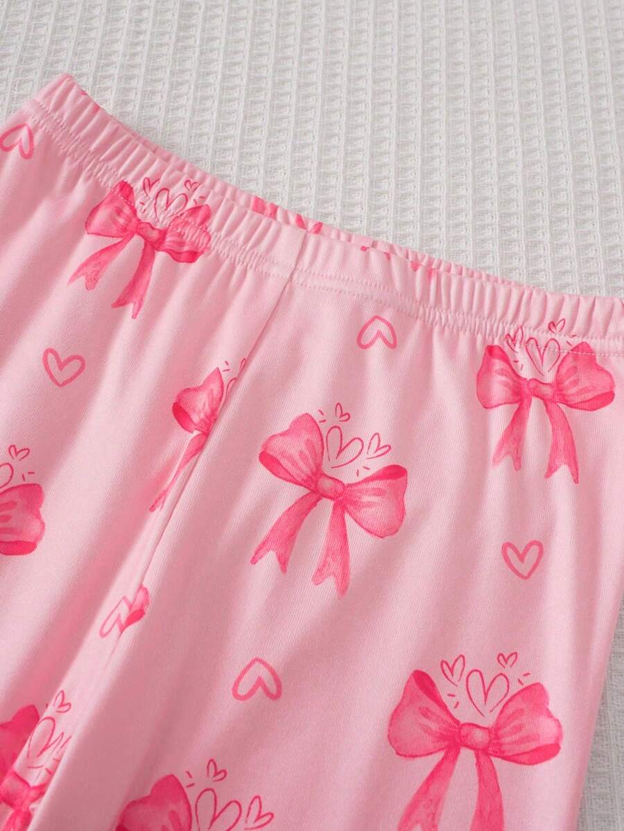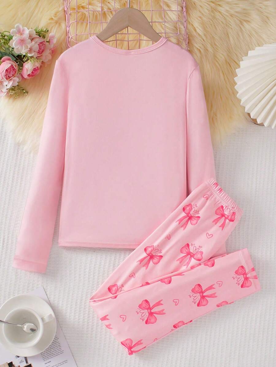 2pcs/Set Girl’s Casual Long Sleeve Top And Pants Set, Featuring Bowknot Print, Comfortable And Stylish