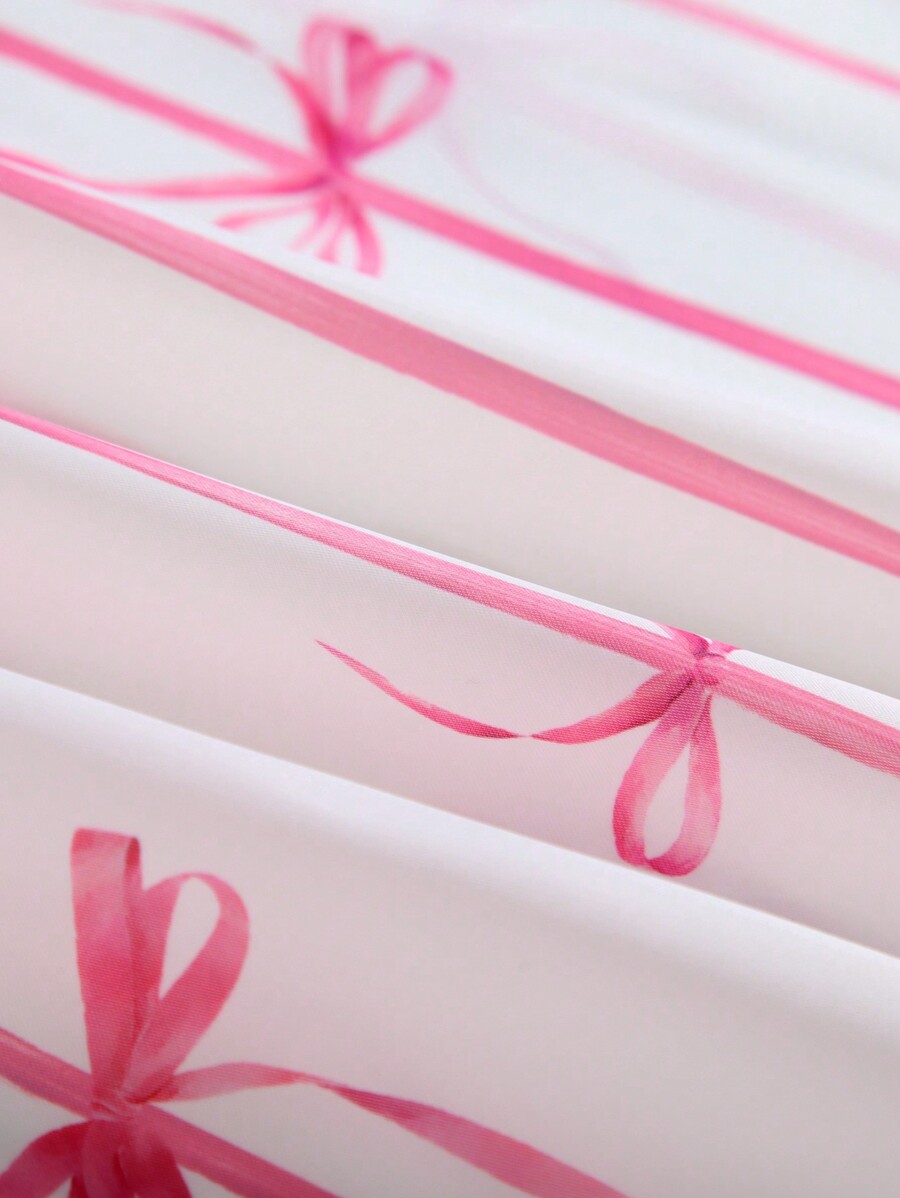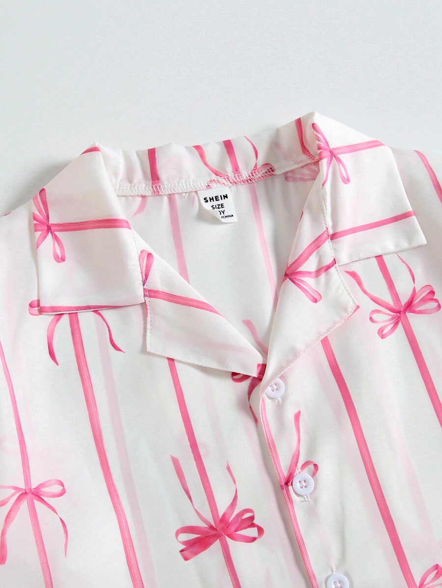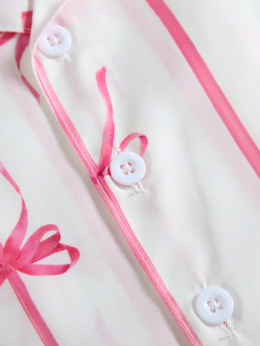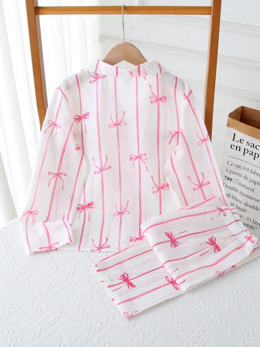 2pcs Tween Girl Casual Outfit – Pink Bow Ribbon Print Lapel Cardigan And Loose Pants, Comfortable Home Wear Set