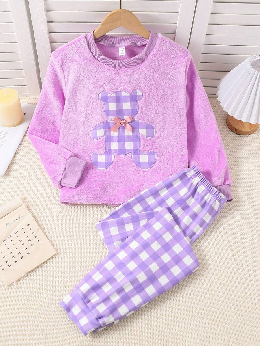 / 2pcs Tween Girls Casual Comfy Outfit Set, Pink Plaid Sweatshirt With Bear Embroidery & Matching Plaid Pants, Suitable For Autumn/Winter