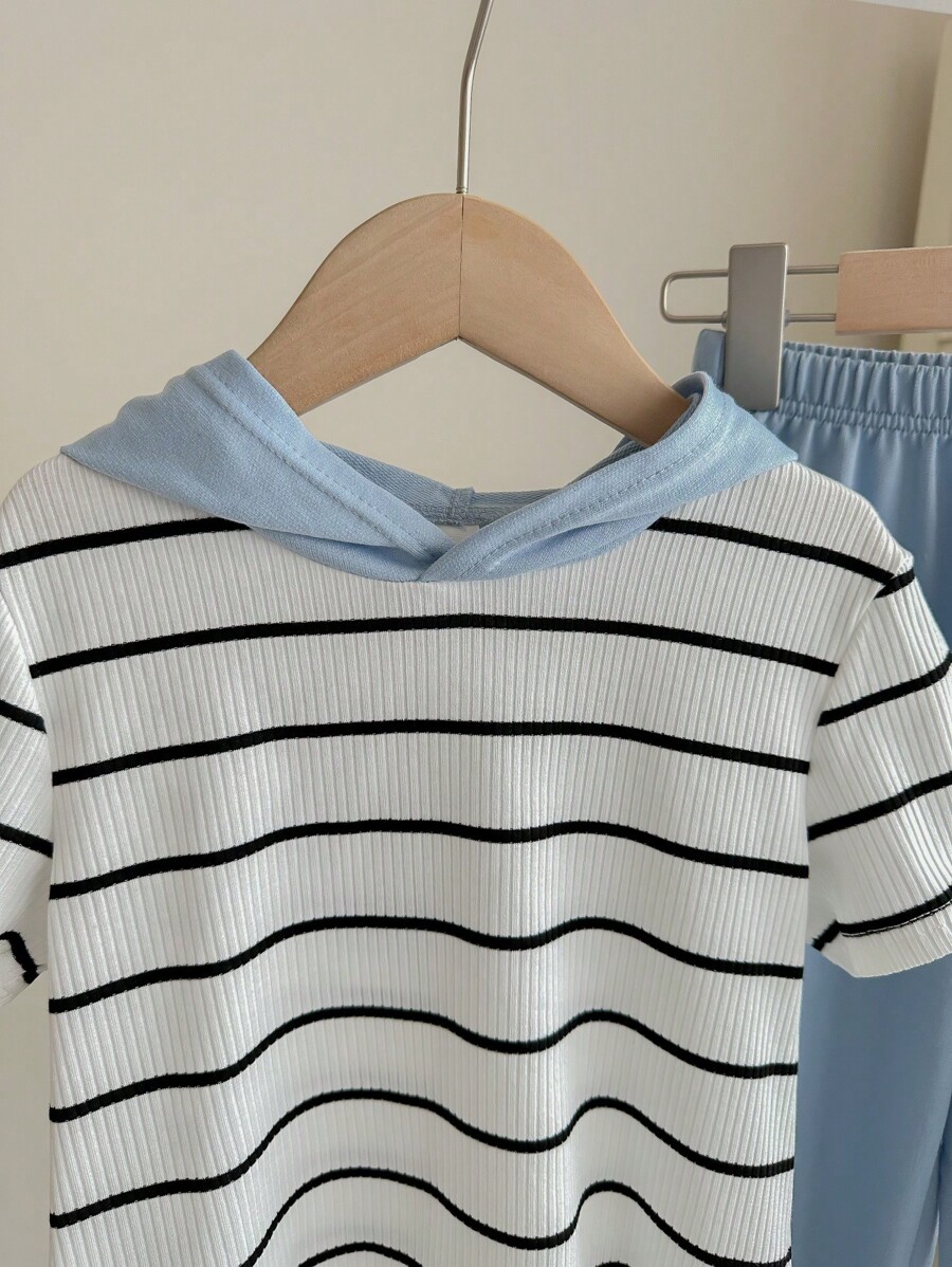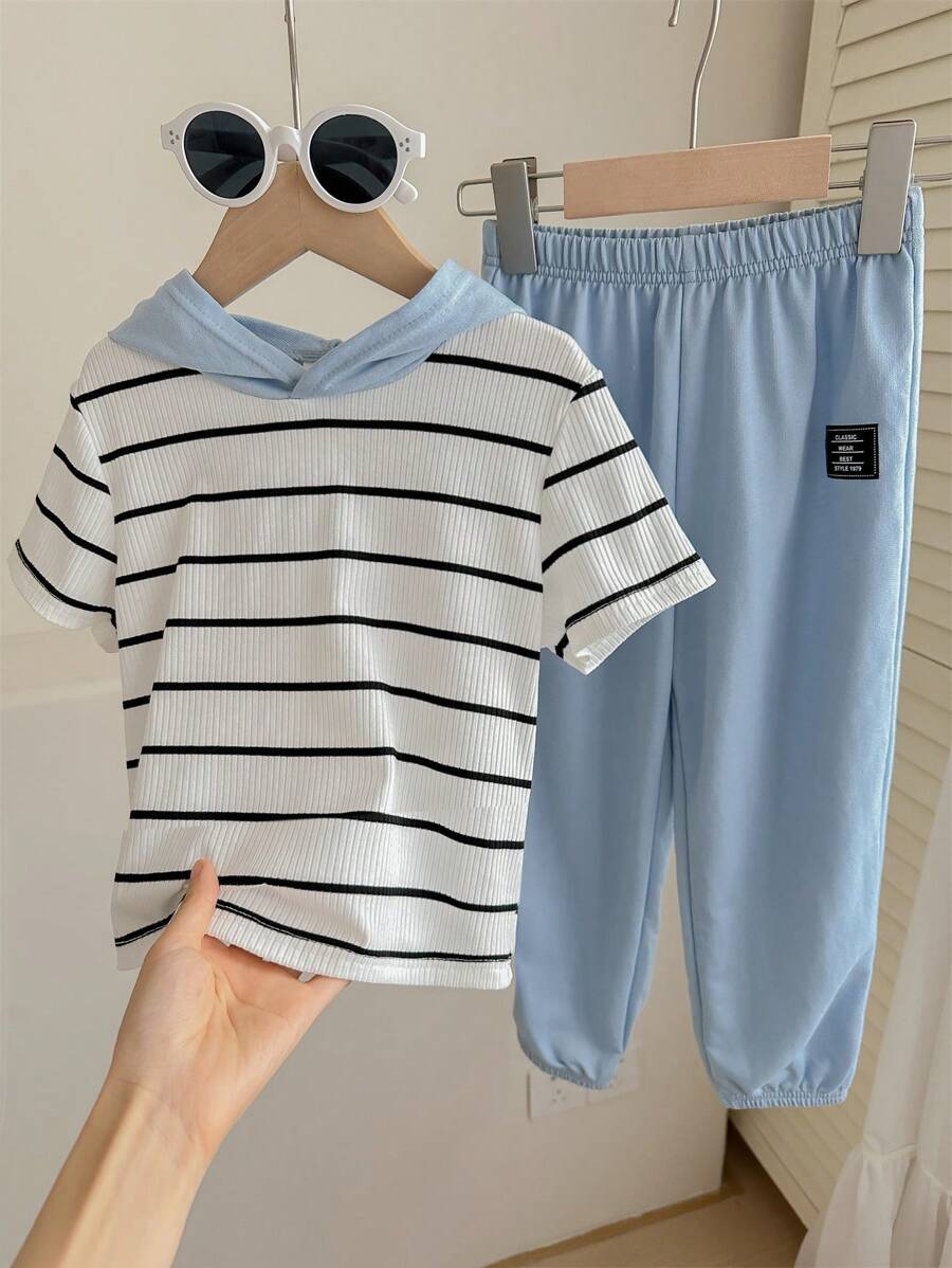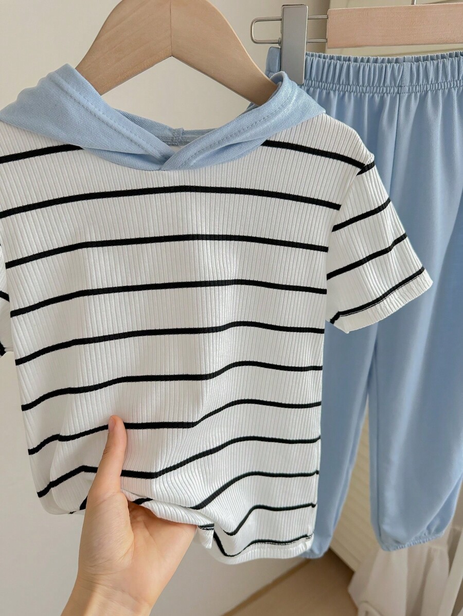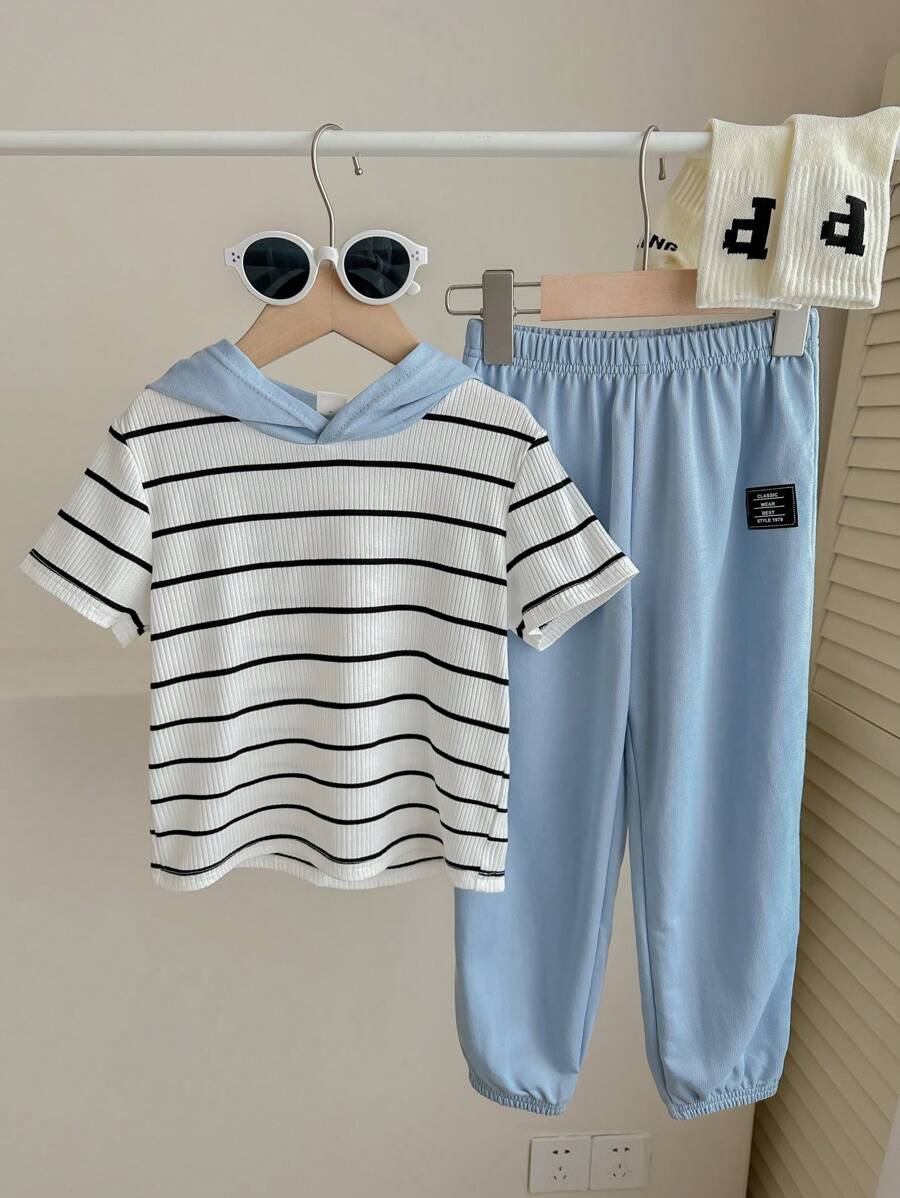 / 2pcs Young Boy Loose-Fit Casual Hooded Striped Short Sleeve T-Shirt And Pants Set