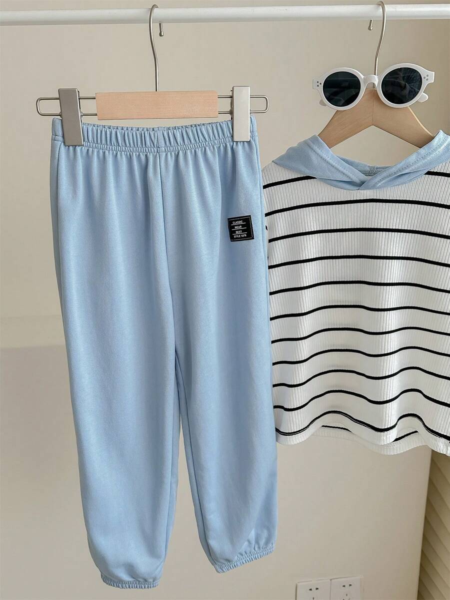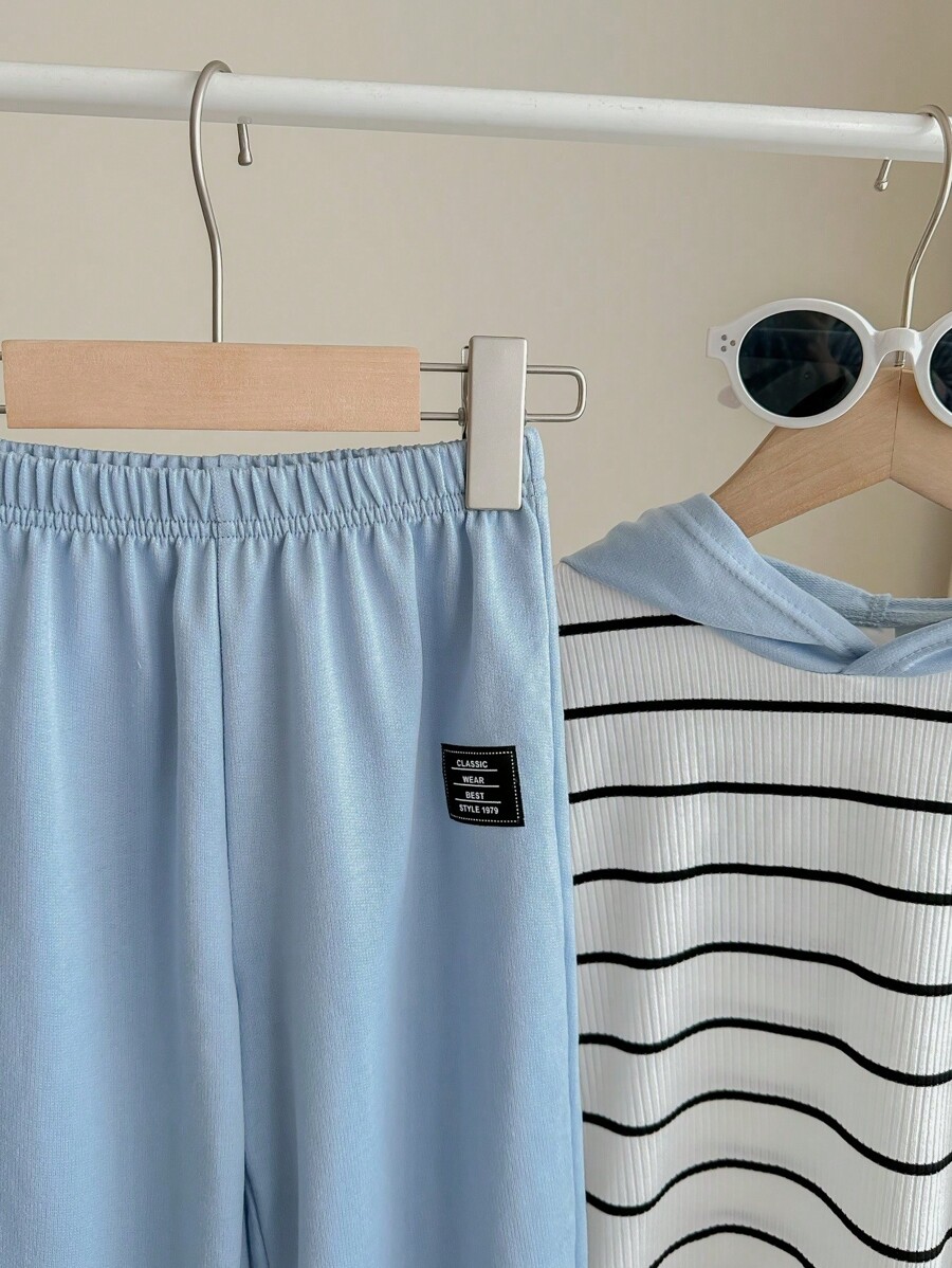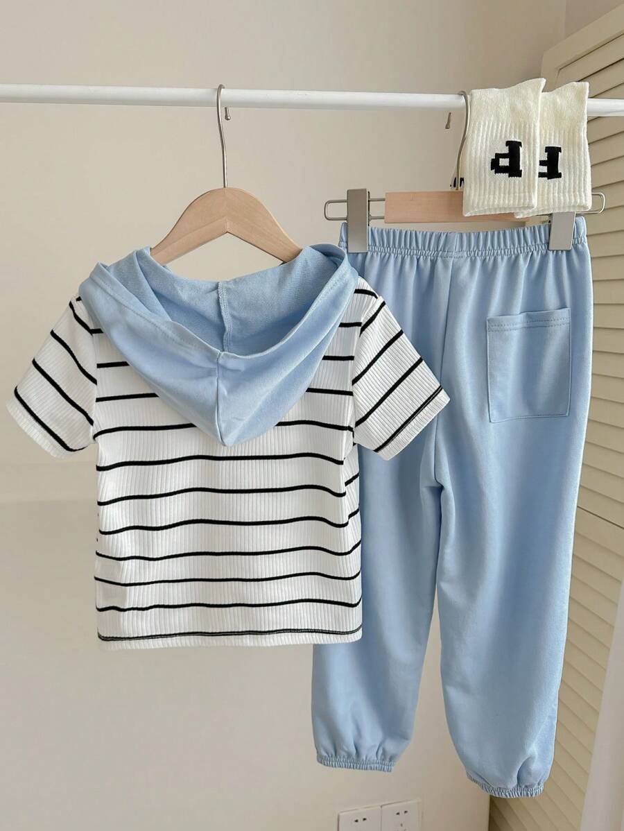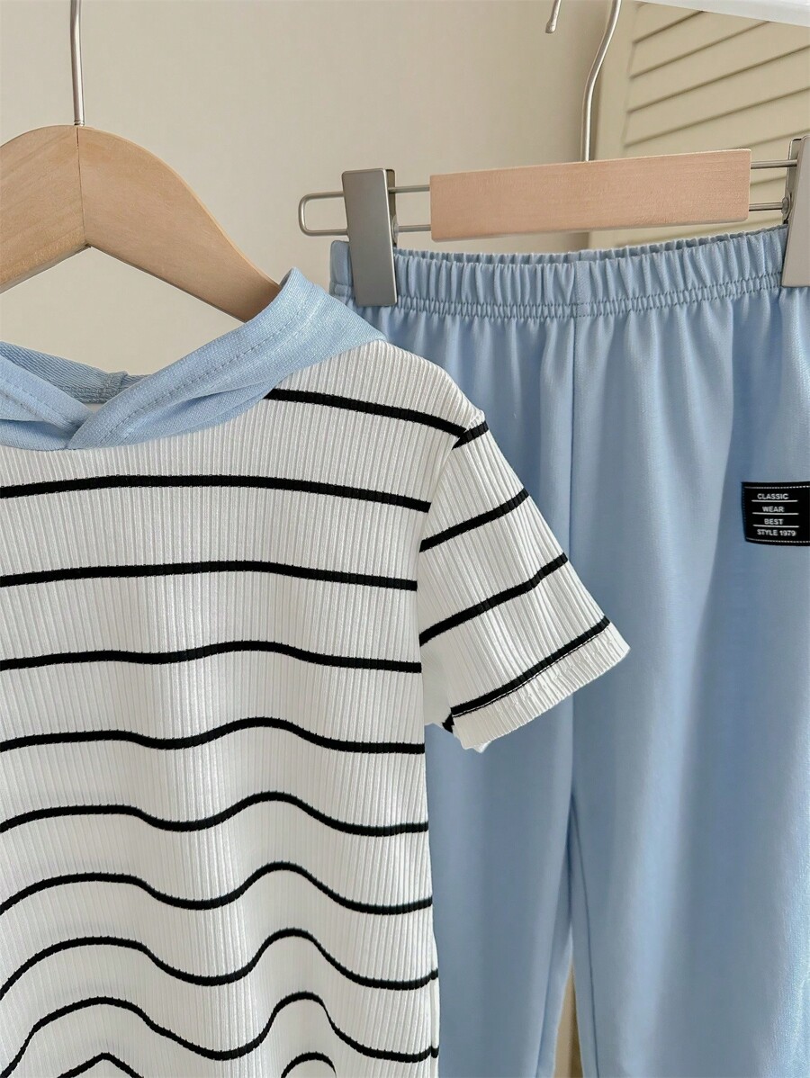 / 2pcs Young Boy Loose-Fit Casual Hooded Striped Short Sleeve T-Shirt And Pants Set