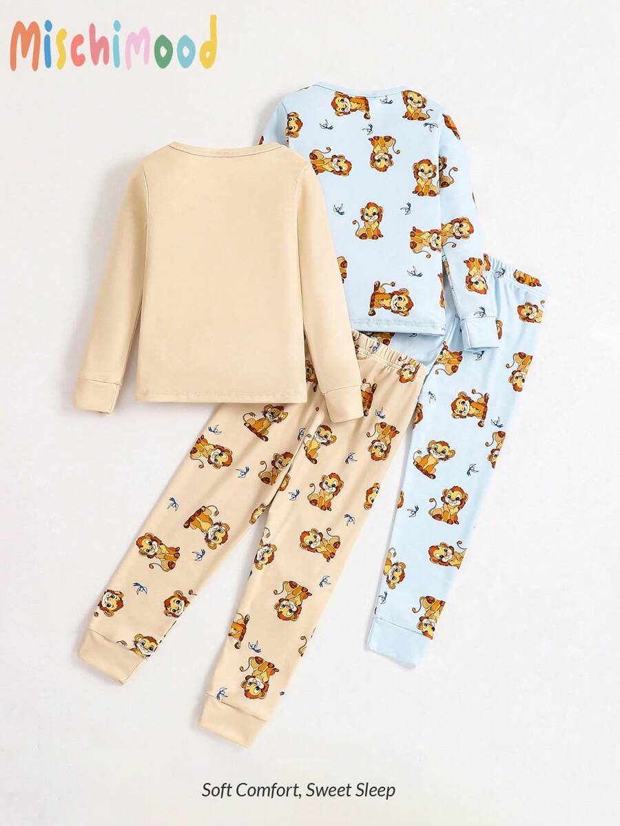 2pcs Young Boy Monkey Print Snug Fit Long Sleeve Top And Long Pants Sleepwear Set