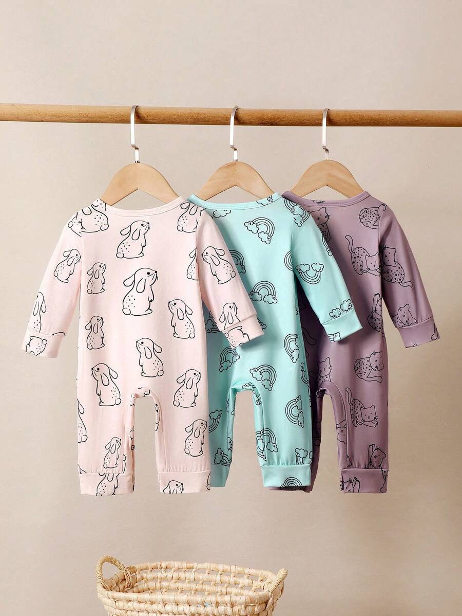 3pcs Baby Girls’ Cute Animal Printed Long Sleeve Jumpsuit Set