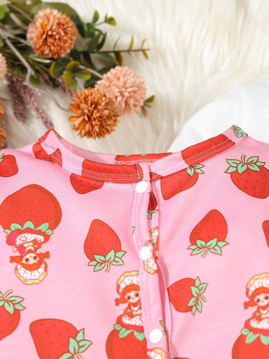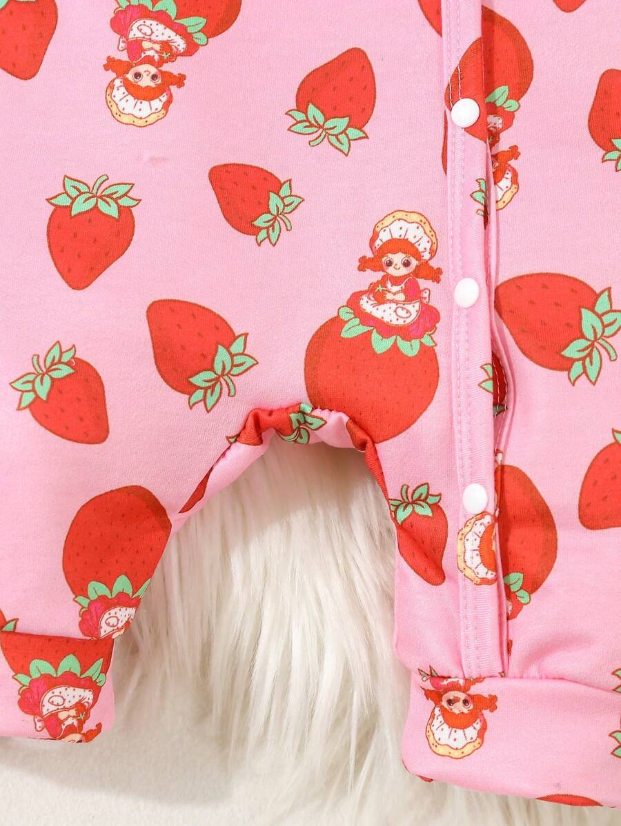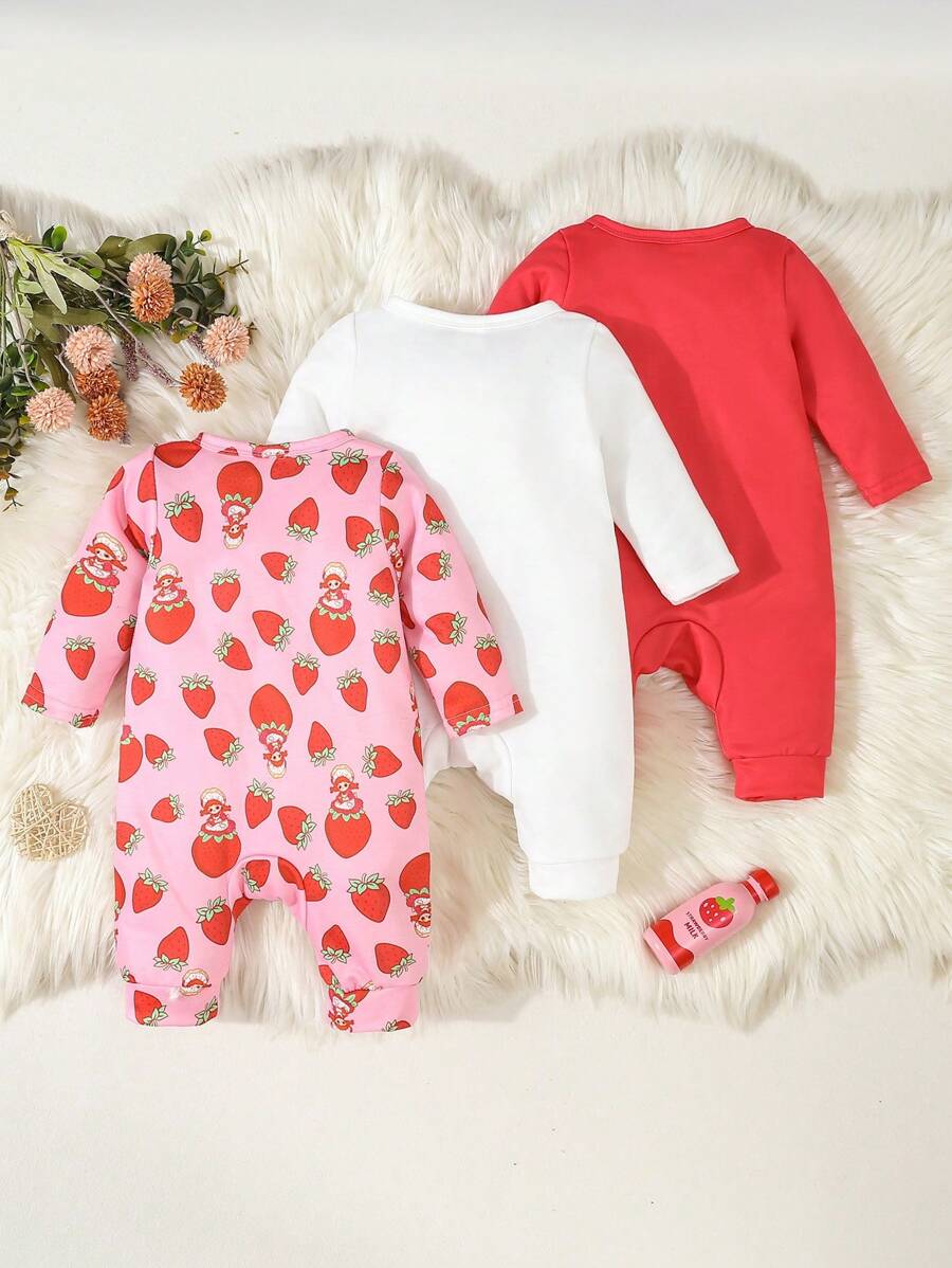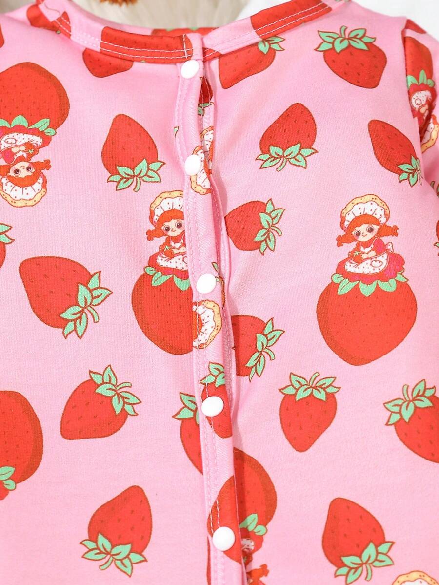 3pcs Cute Baby Girl Comfortable Pink Strawberry Print Jumpsuit Set
