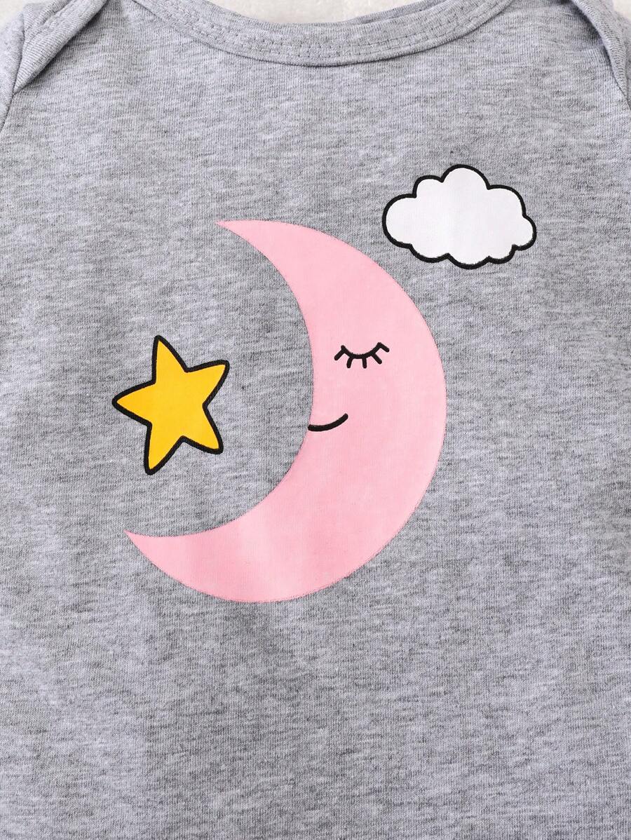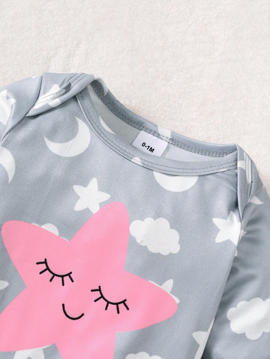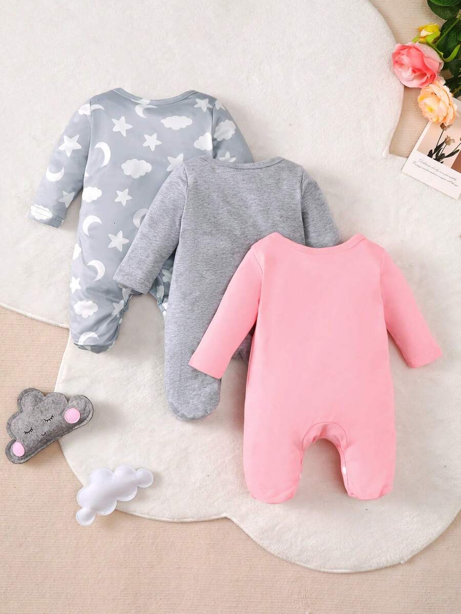 3pcs Newborn Baby Girls’ Casual Crew Neck Long Sleeve Star, Moon And Cloud Print Romper Set