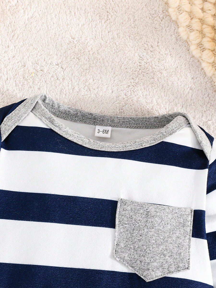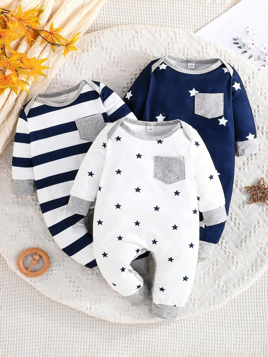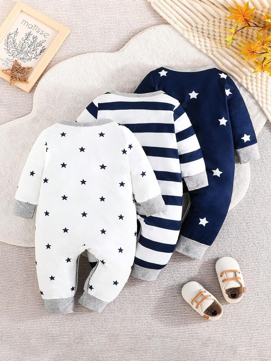 3pcs/Set Baby Boys Casual & Comfy Striped & Star Pattern Long Sleeve Romper Jumpsuit, Spring & Autumn quantity