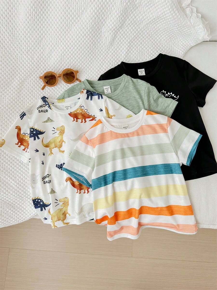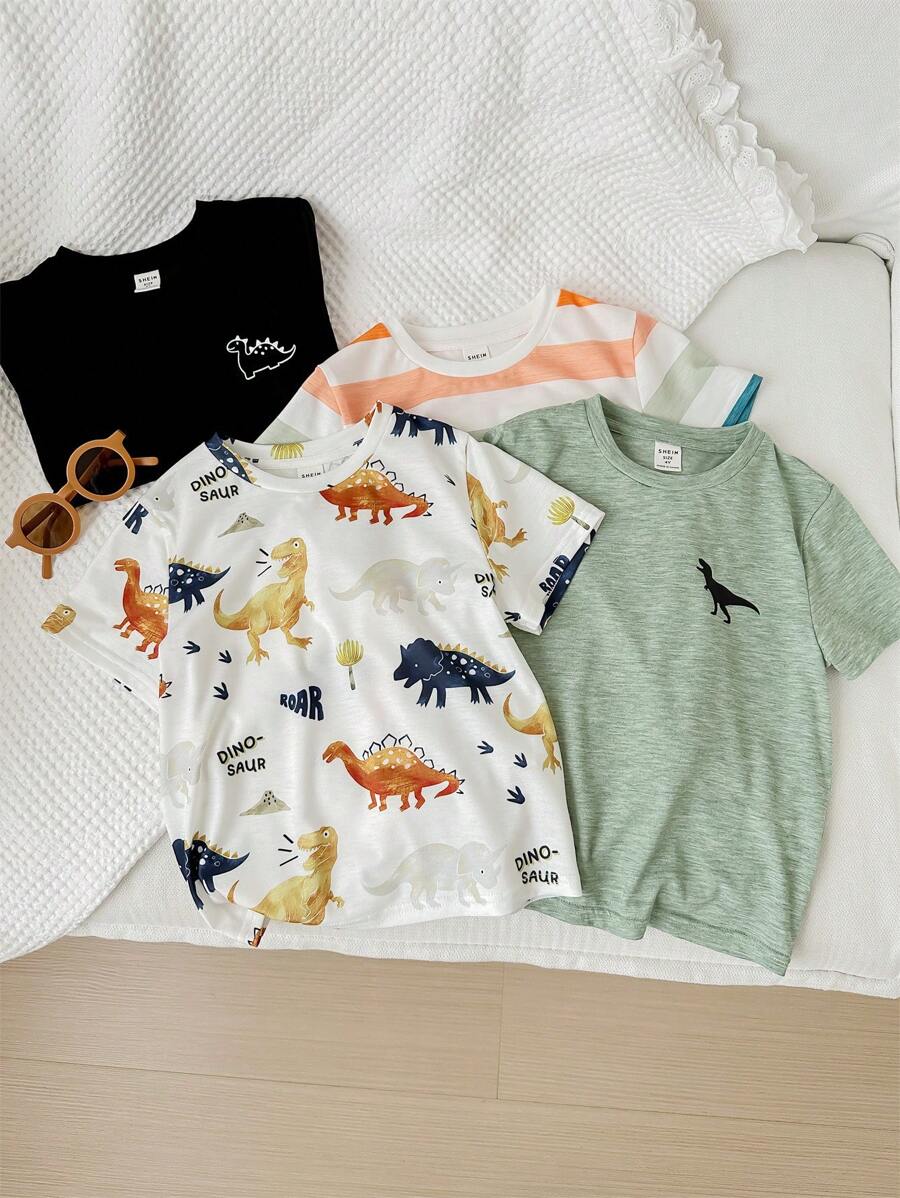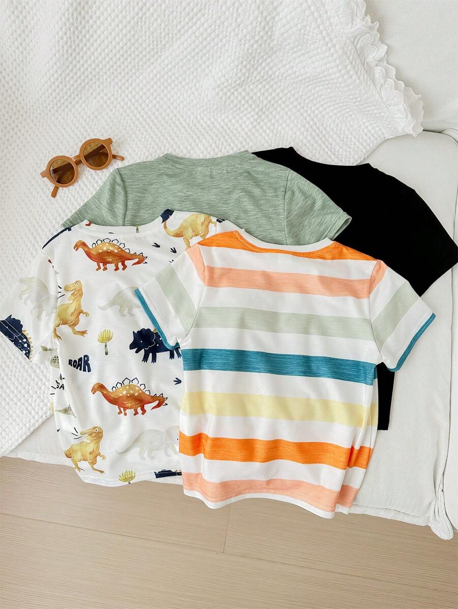 / 3pcs/Set Young Boy Cartoon Printed Contrast Color Short Sleeve T-Shirt With Round Neck