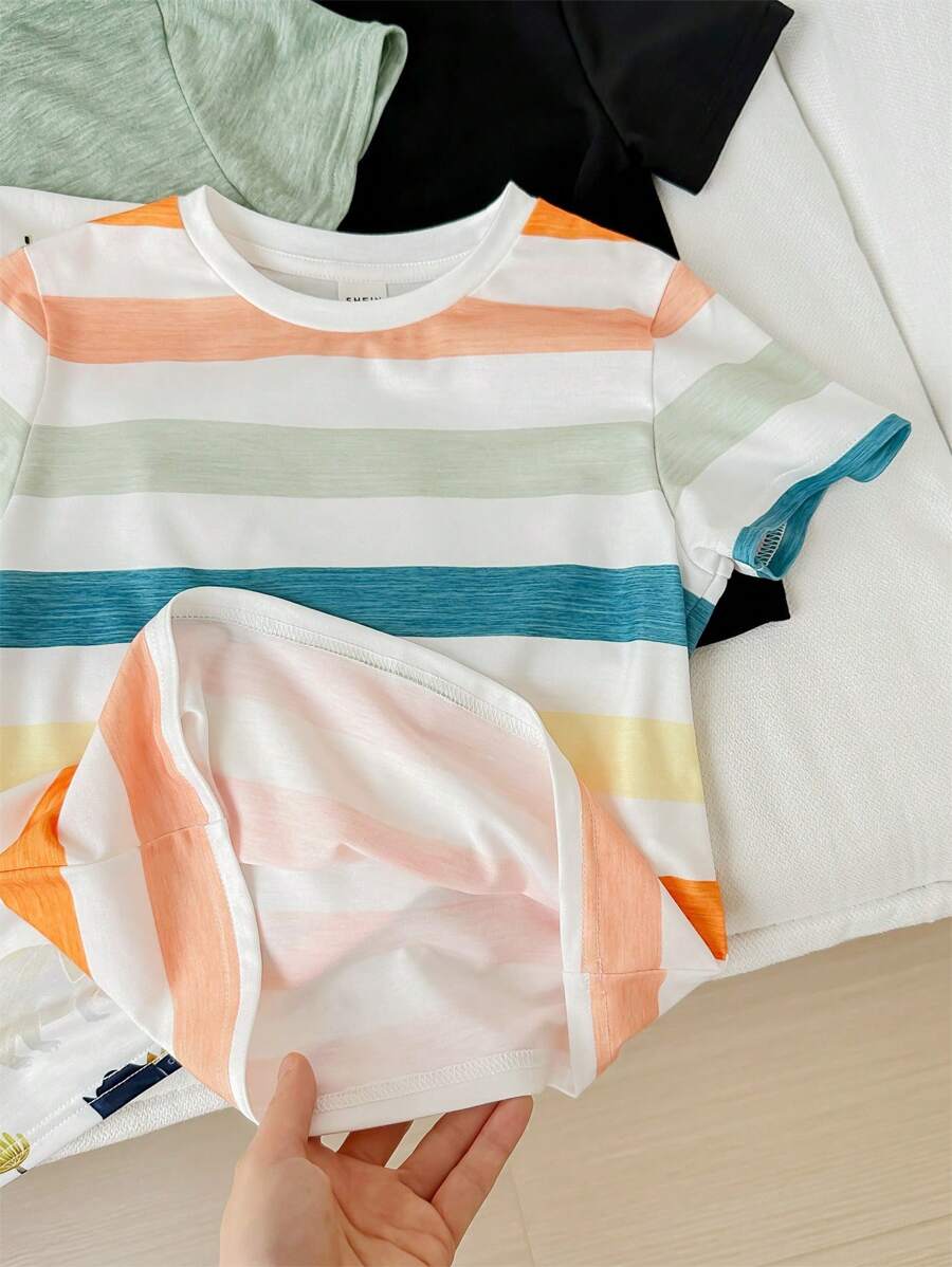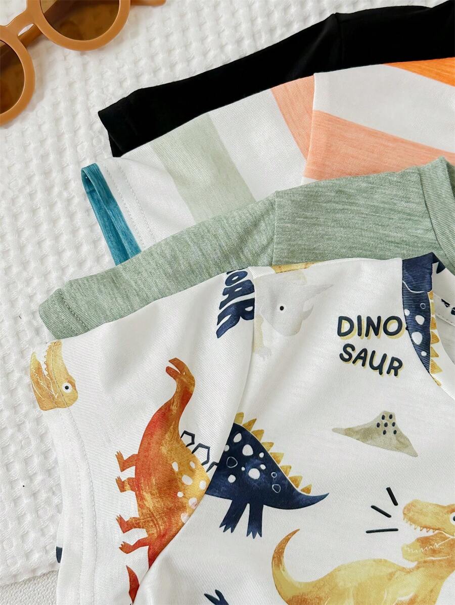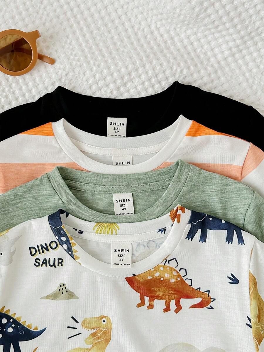 / 3pcs/Set Young Boy Cartoon Printed Contrast Color Short Sleeve T-Shirt With Round Neck