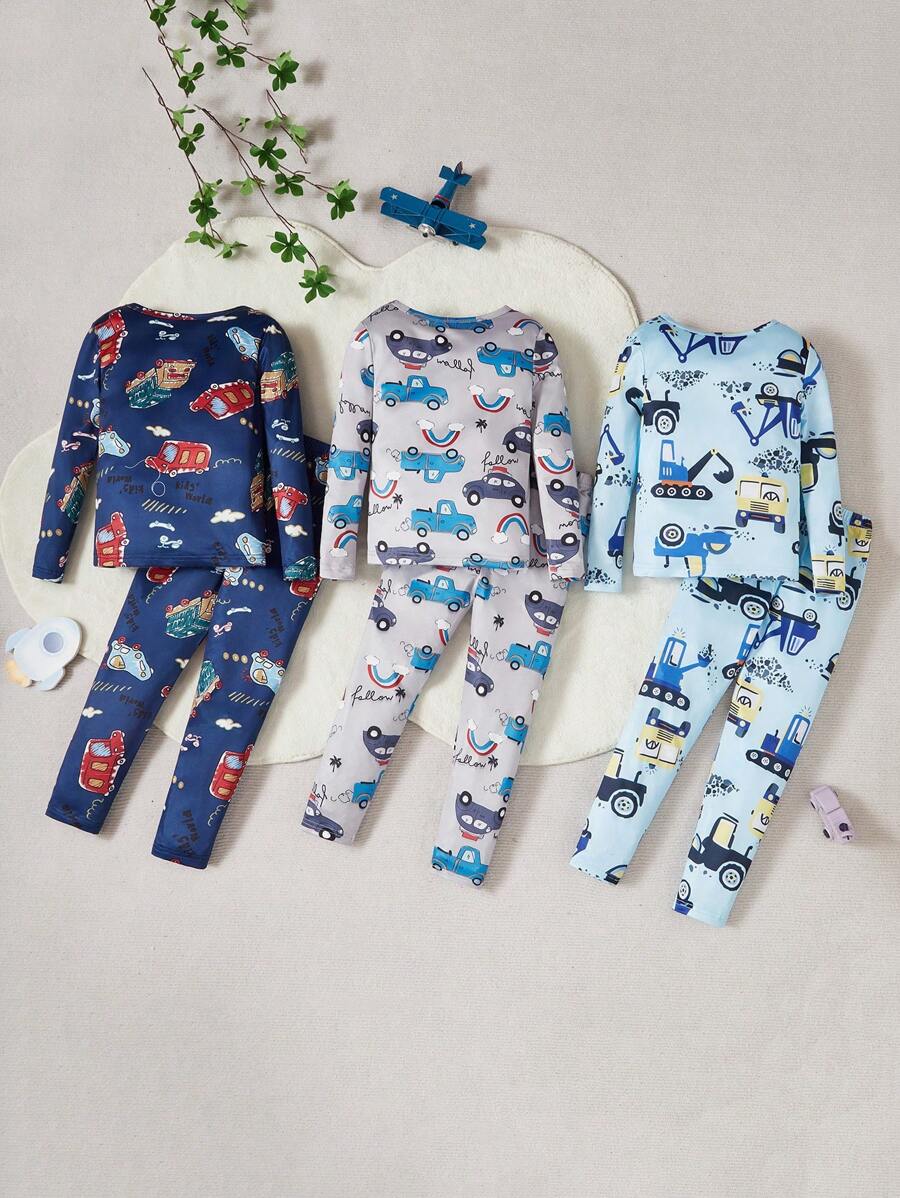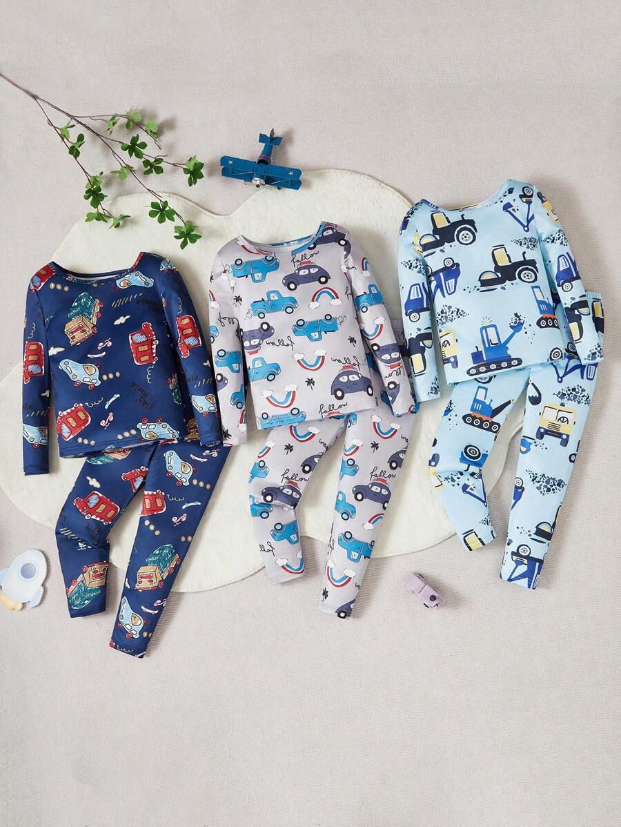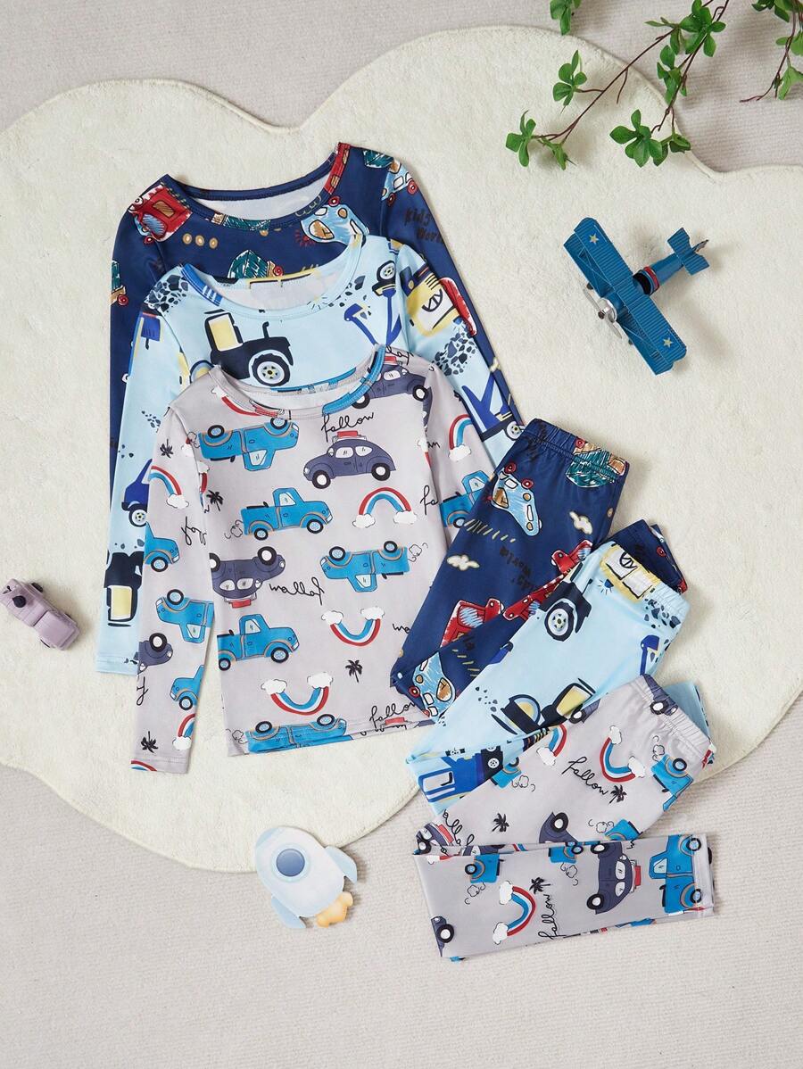 / 3pcs/Set Young Boy Vehicle Print Snug Fit Long Sleeve Pajama Sets