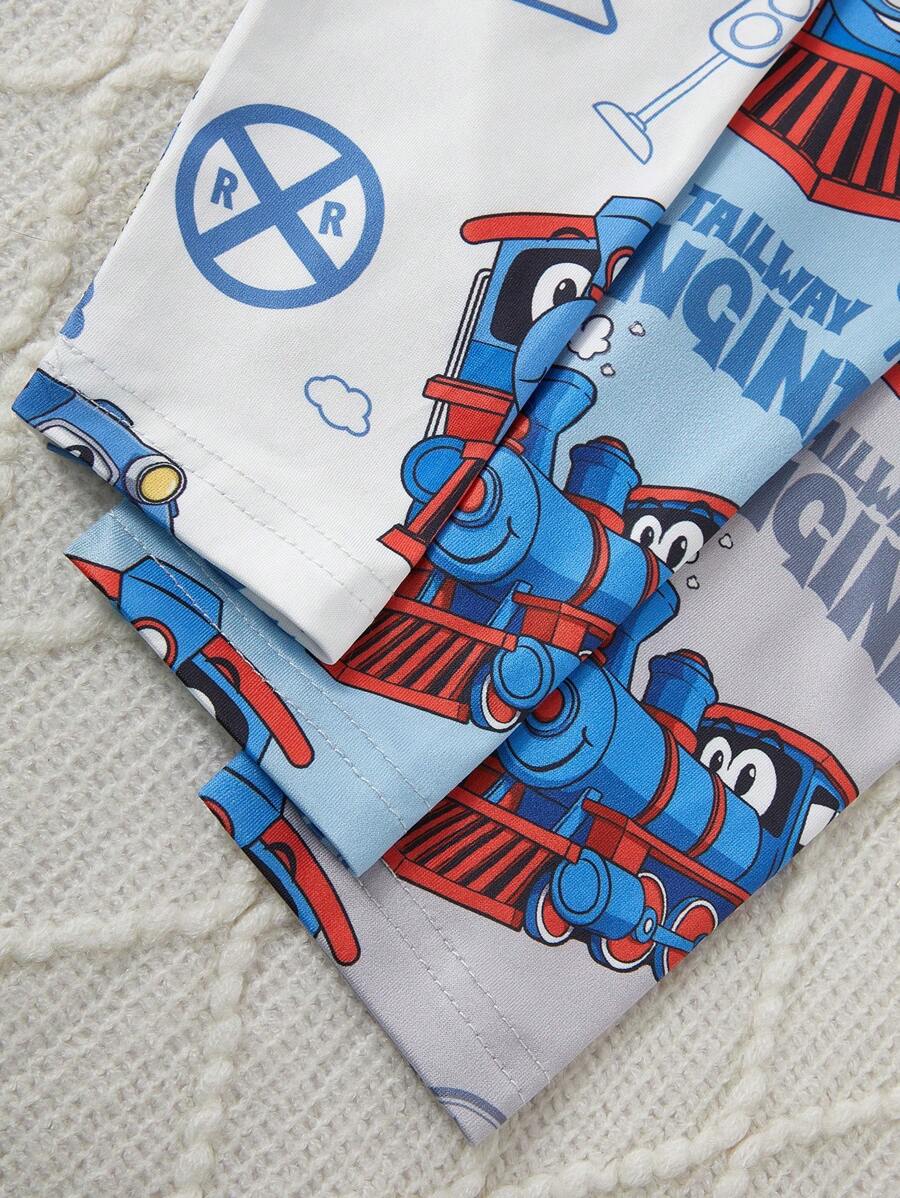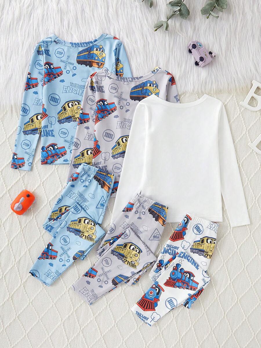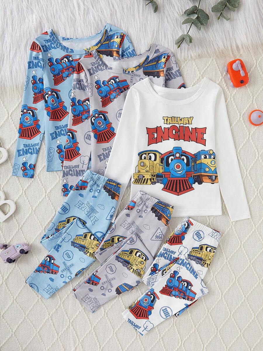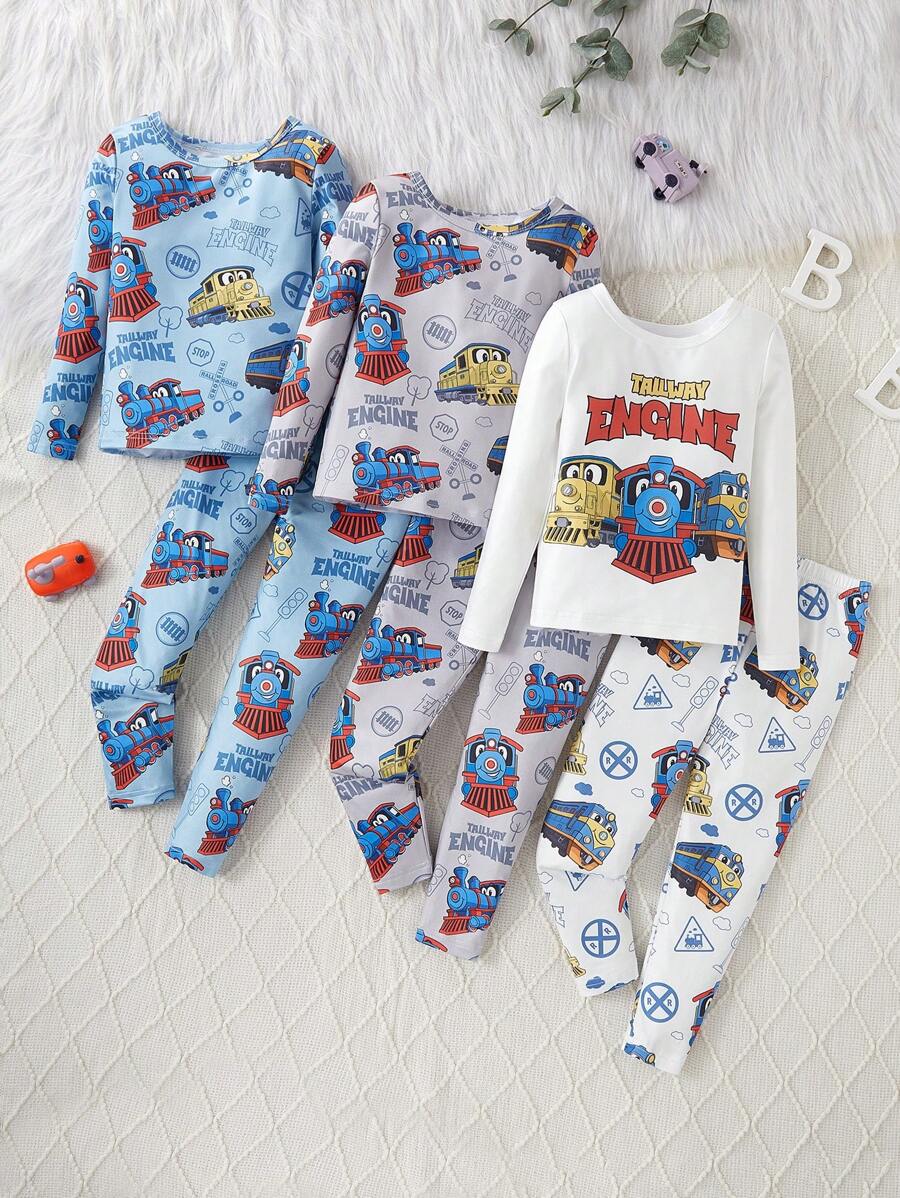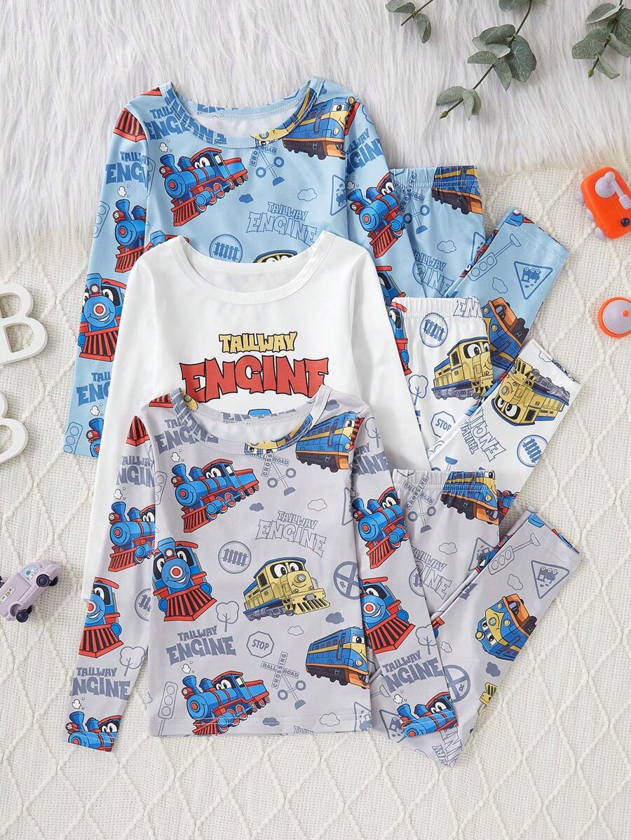 / 3pcs/Set Young Boys Car Allover Print Simple All Over Print Long Pants And Long Sleeve Snug Fit Pajama Sets