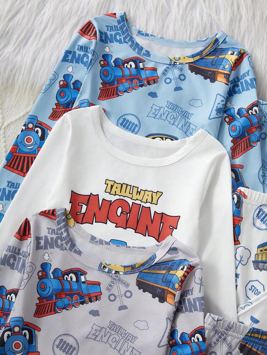 3pcs/Set Young Boys Car Allover Print Simple All Over Print Long Pants And Long Sleeve Snug Fit Pajama Sets