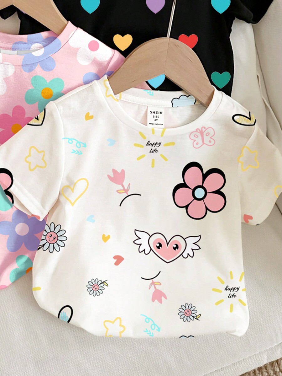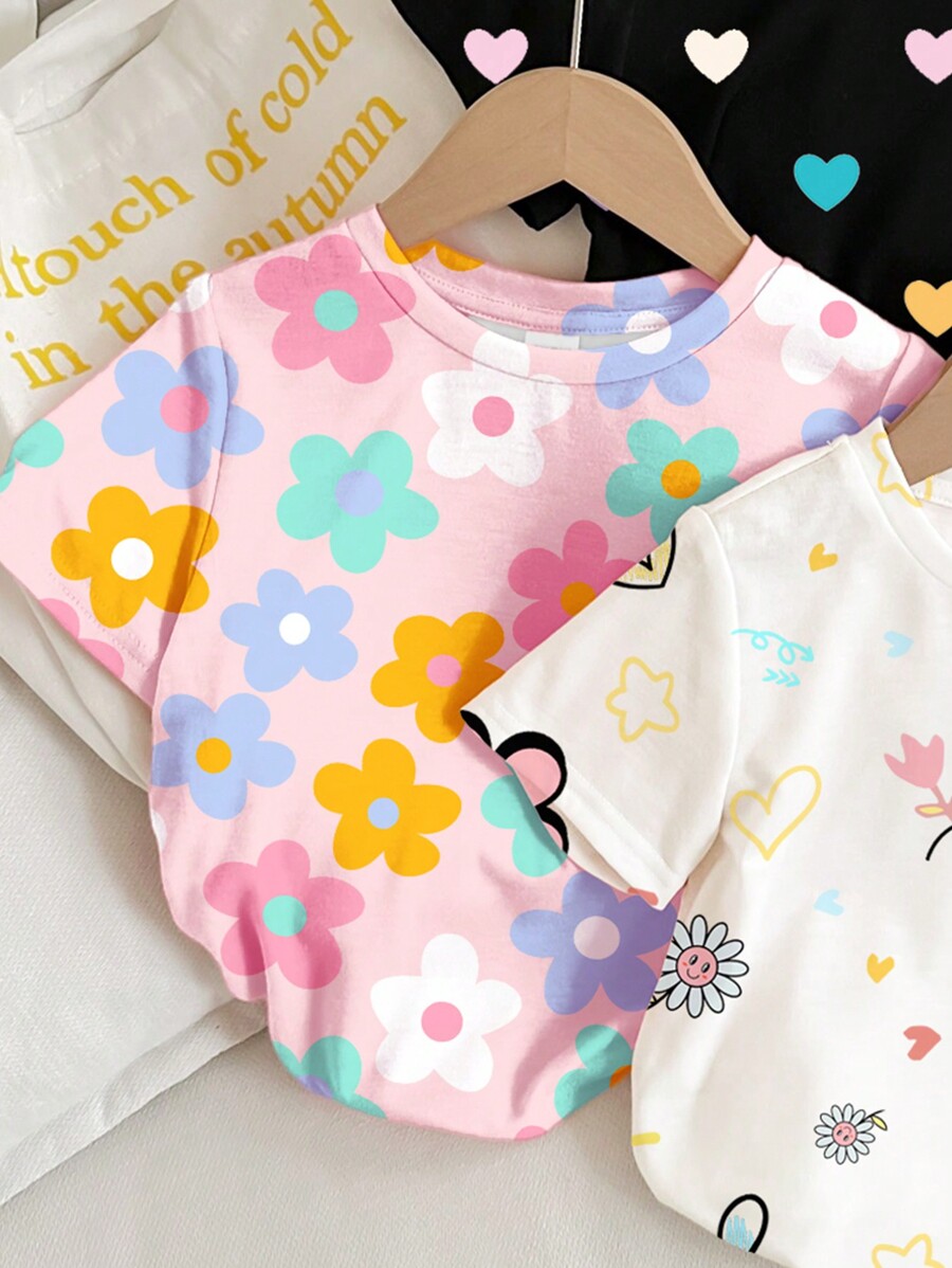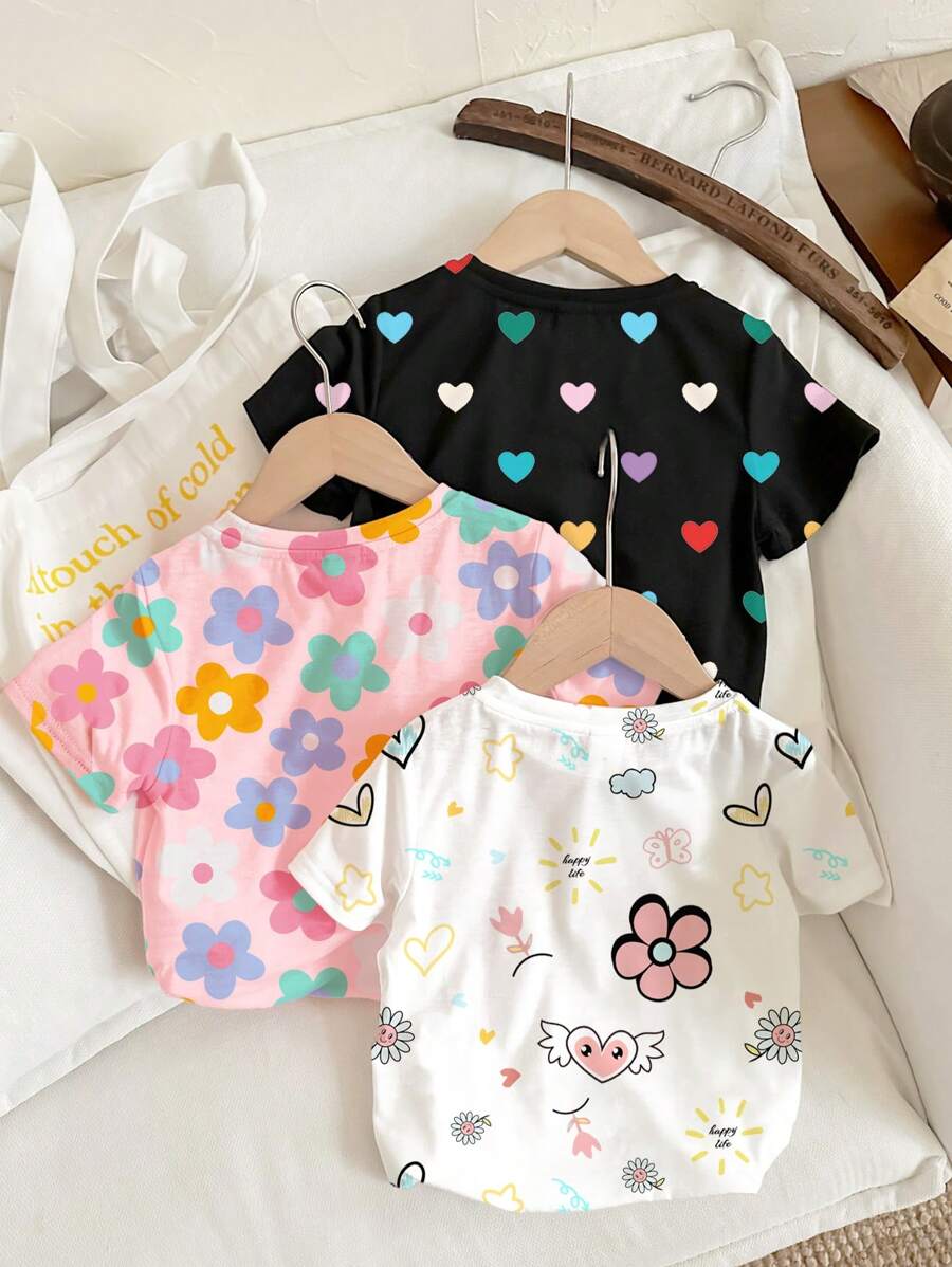 / 3pcs Set Young Girl Casual Floral, Heart & Polka Dot Printed Round Neck Short Sleeve T-Shirt, Suitable For Spring And Summer