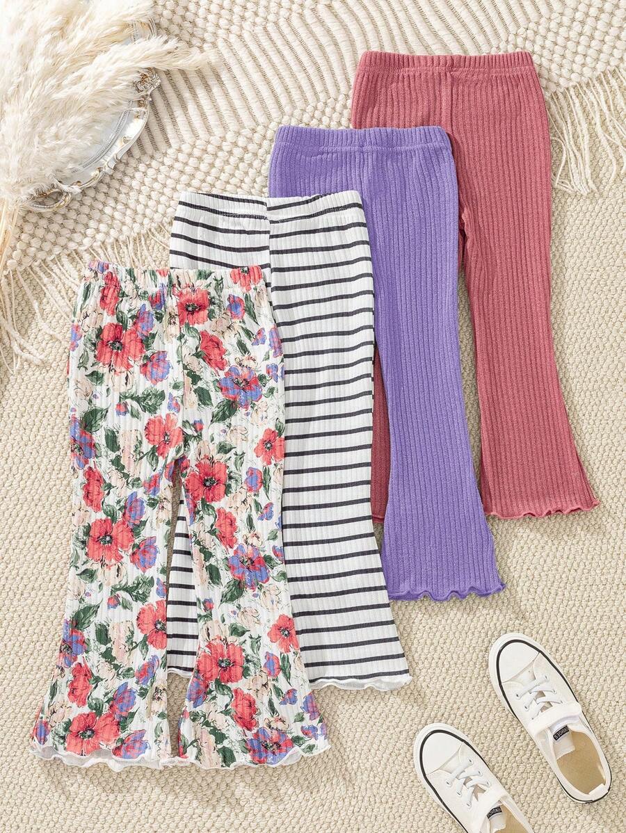4pcs Young Girl Casual Versatile Floral & Ribbed Print Plus Solid Color Flared Pants