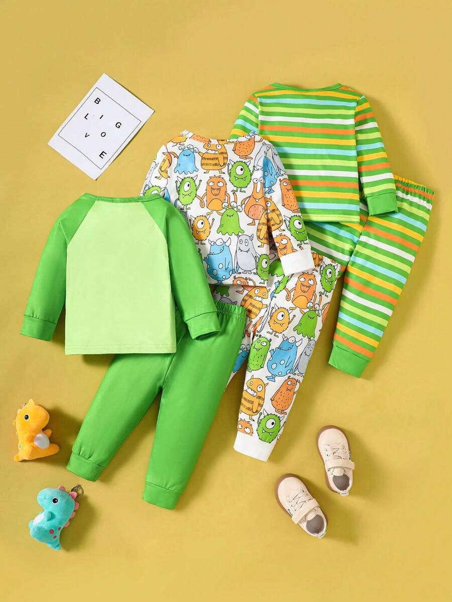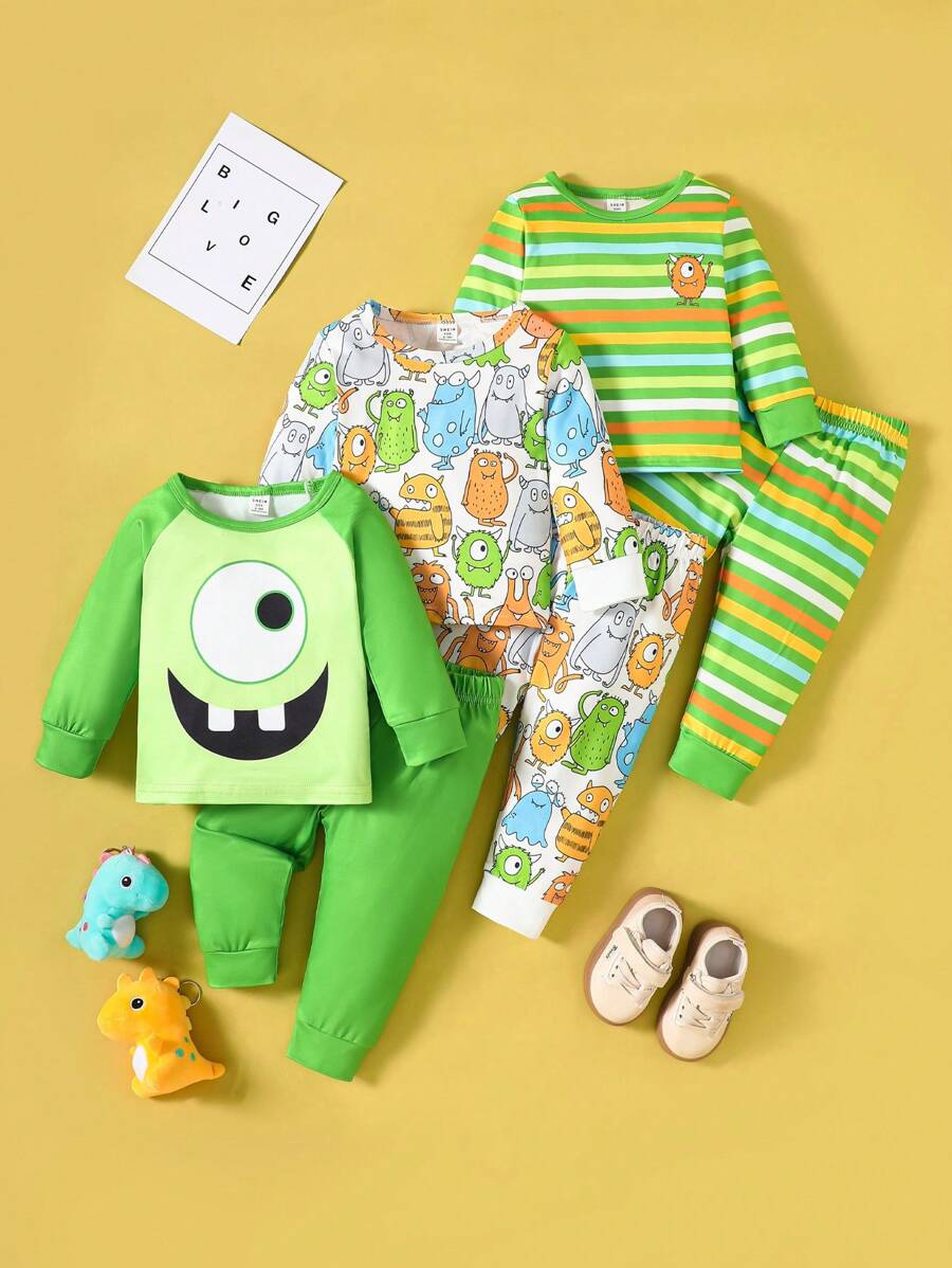 6pcs/Set Baby Boys Funny Monster Graphic & Striped Print Long Sleeve T-Shirt & Pants Set, Cute Casual Outfit For Family Gathering, Photo Shoot, Outing quantity