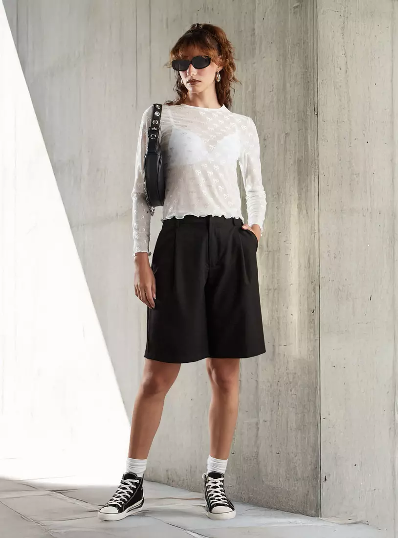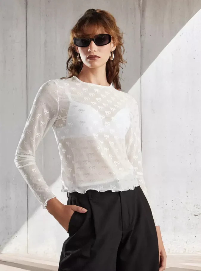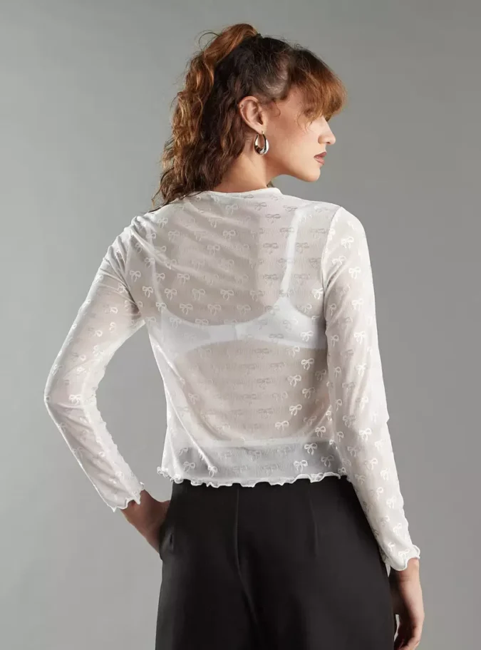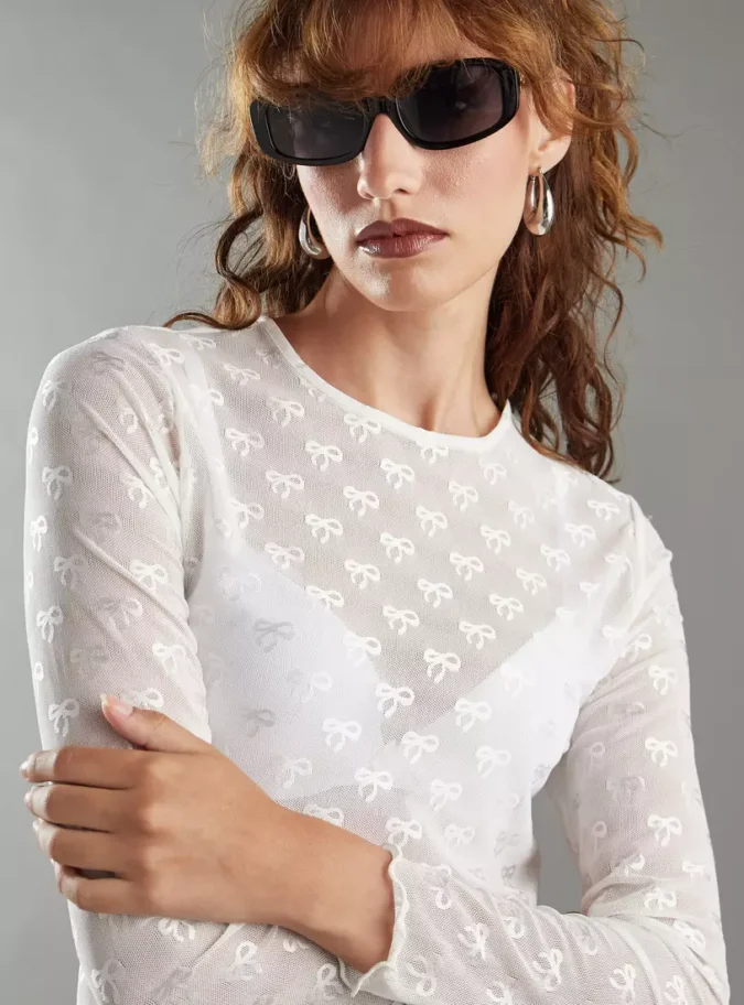 All-Over Bow Embroidered Mesh Top