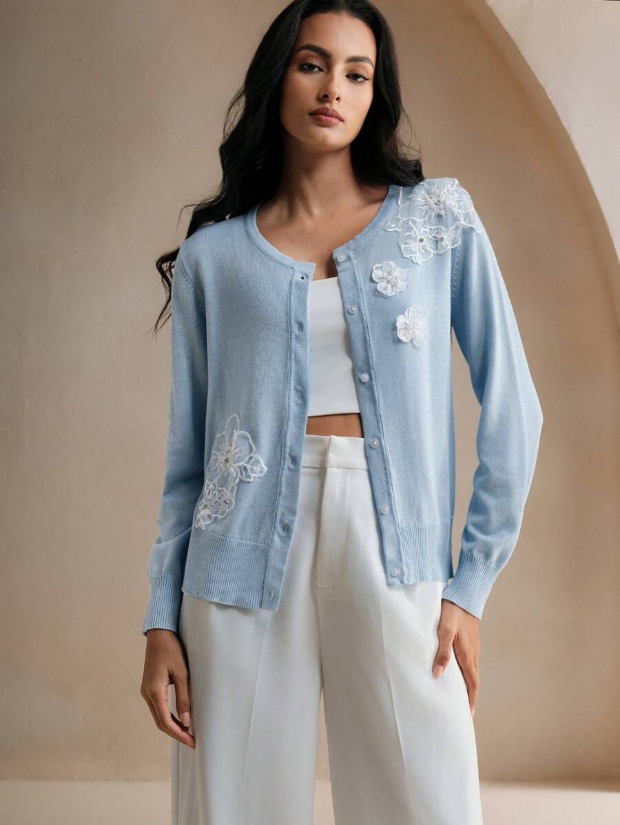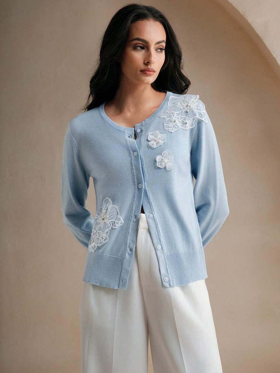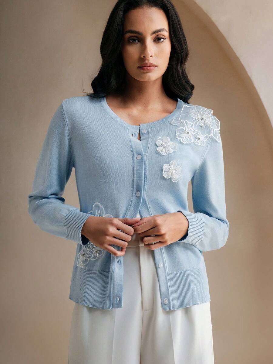 Anewsta Blue Floral 3D Pearl & Sequin Embroidered
