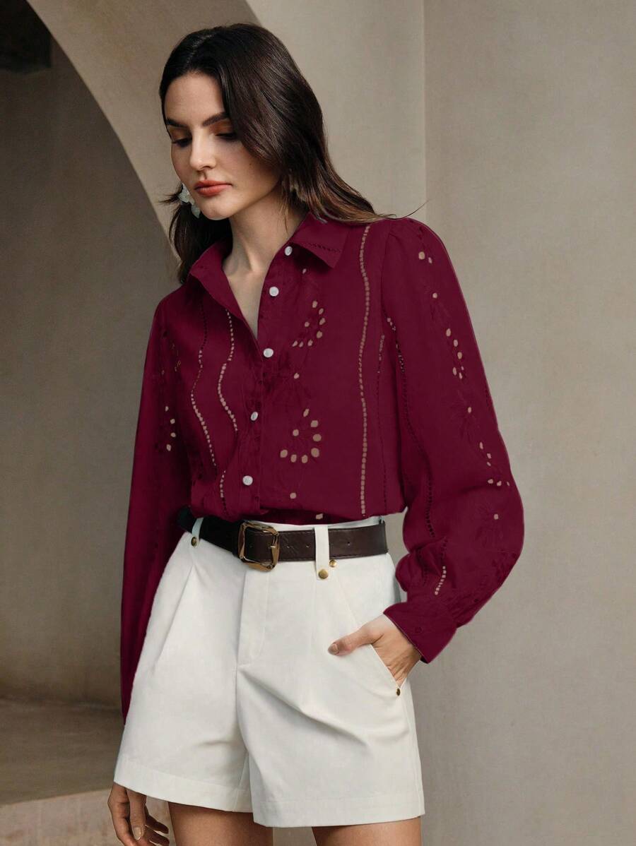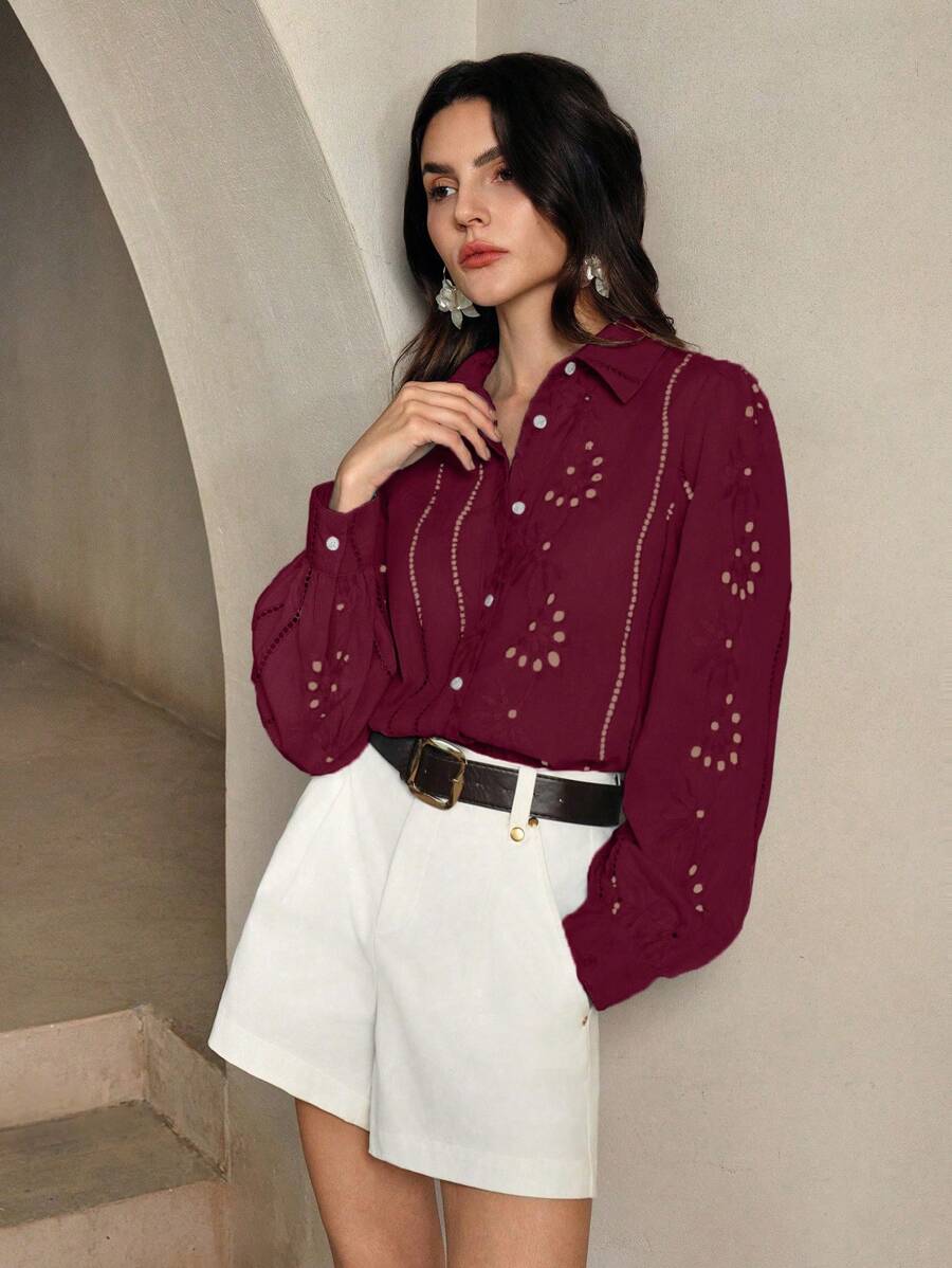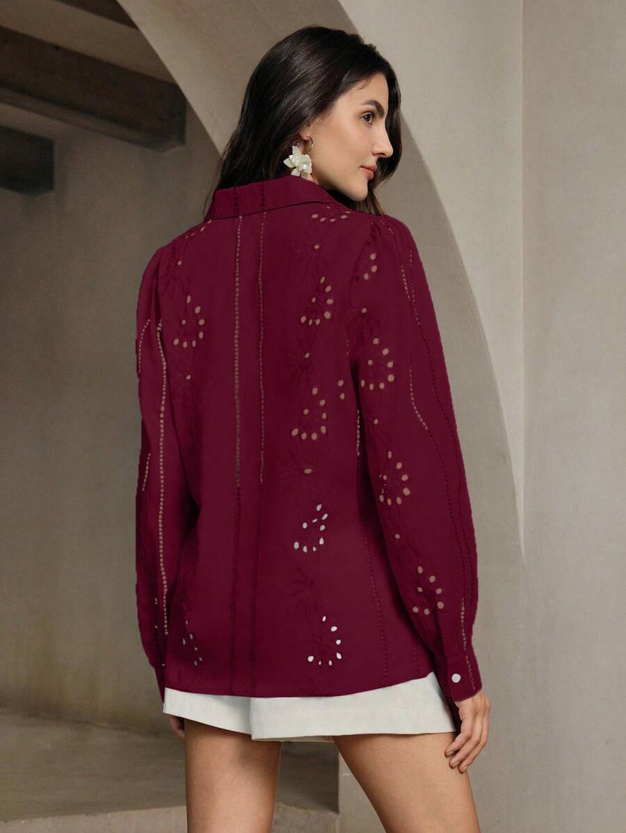 / Anewsta Christmas Hollow Embroidered Floral Casual Collared Long Sleeve Blouse Women Shirt