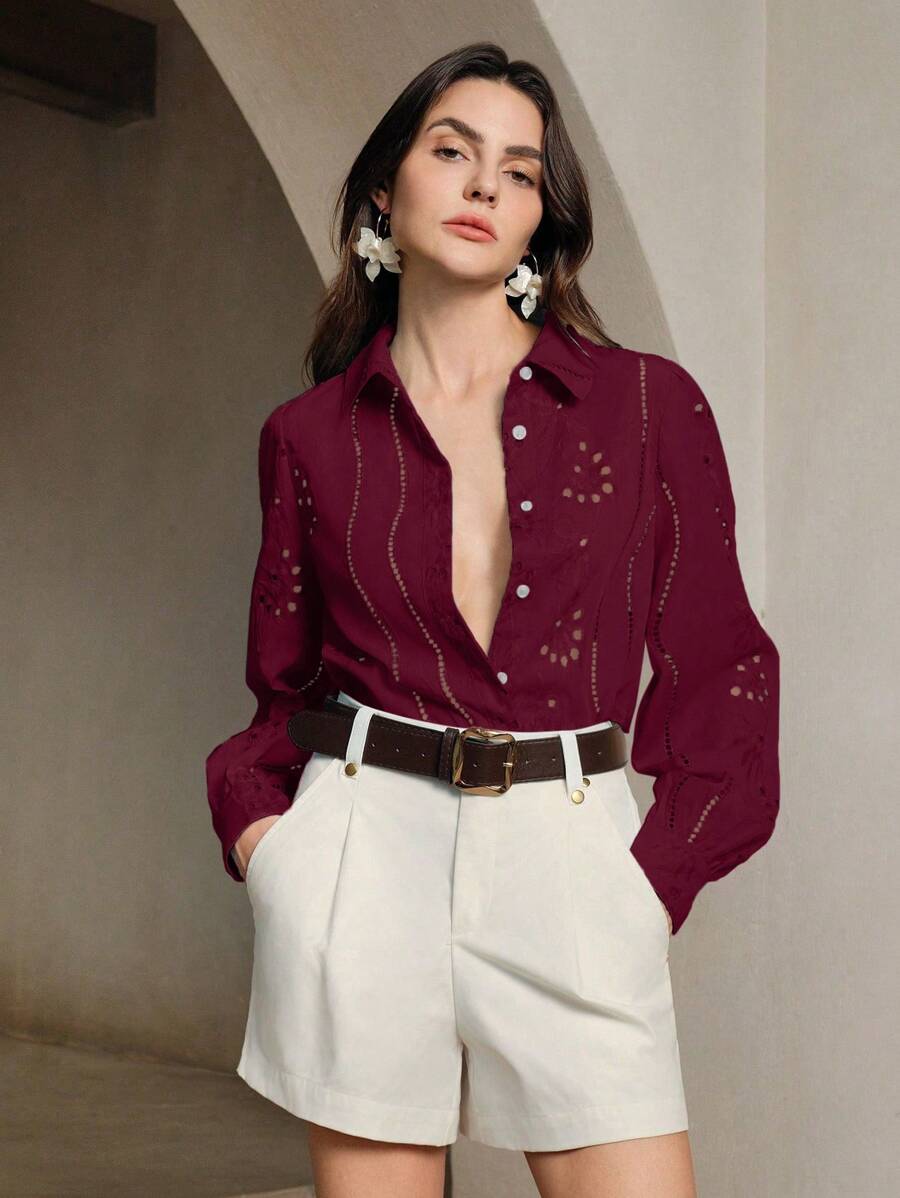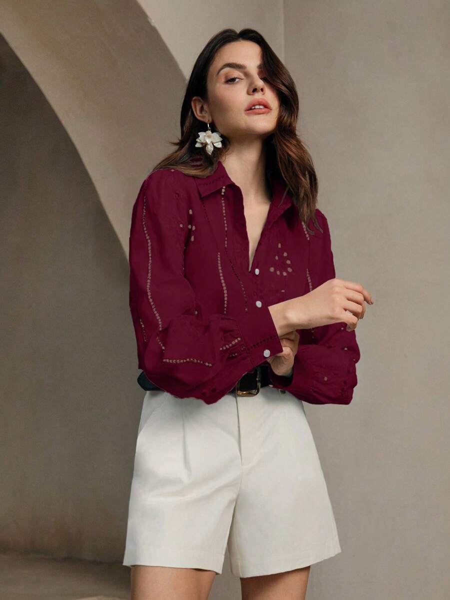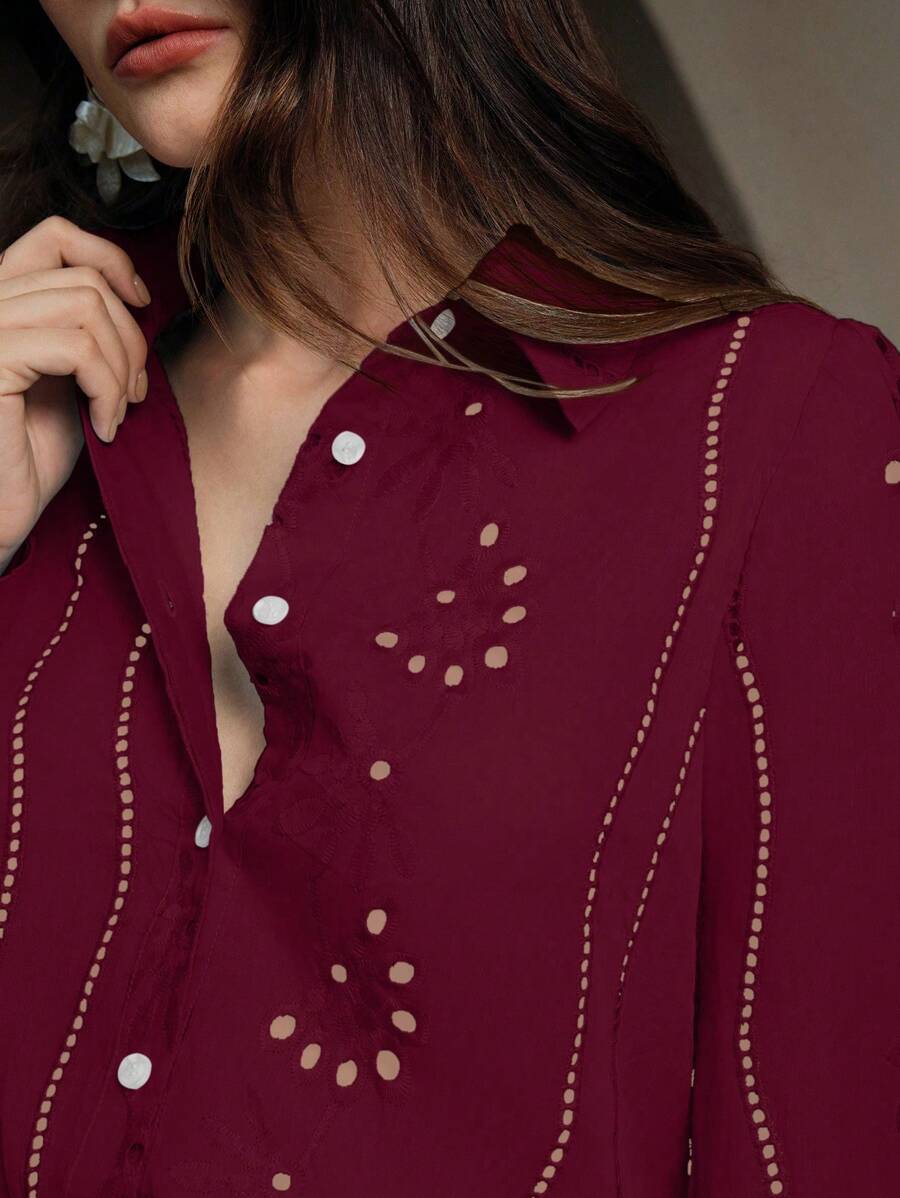/ Anewsta Christmas Hollow Embroidered Floral Casual Collared Long Sleeve Blouse Women Shirt