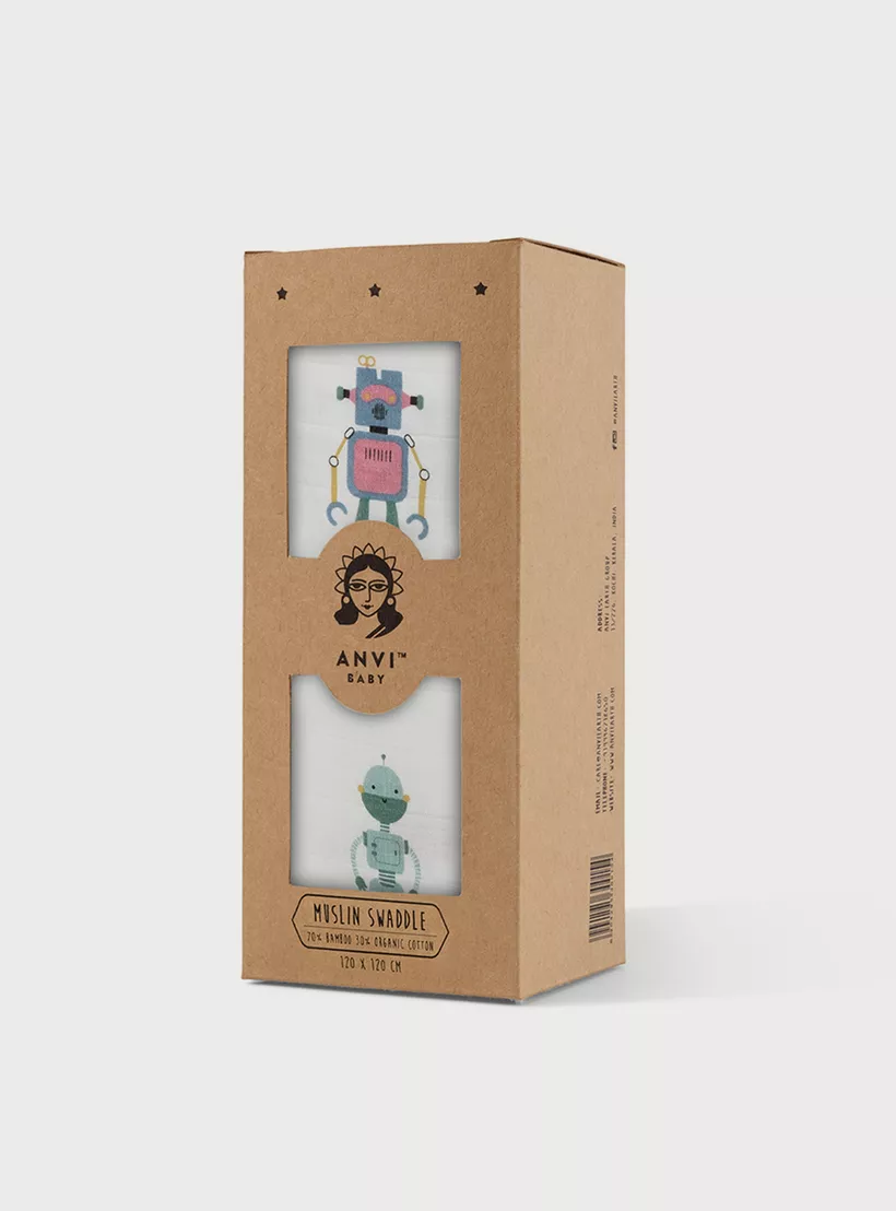 Anvi Baby Organic Bamboo Muslin Swaddle Wrap, Robo Land is a luxurious and soft wrap made from a combination of Anvi Baby Organic cotton and rayon. It is naturally hypoallergenic and snug, and is more water absorbent and breathable than regular cotton. This wrap is generously sized and can be used as a swaddle, a blanket for the stroller, or a cover for the changing table. Anvi Baby Organic and natural products are inspired by the mystical beauty of the goddess of the forest and are created with ancient wisdom and modern techniques for the discerning.