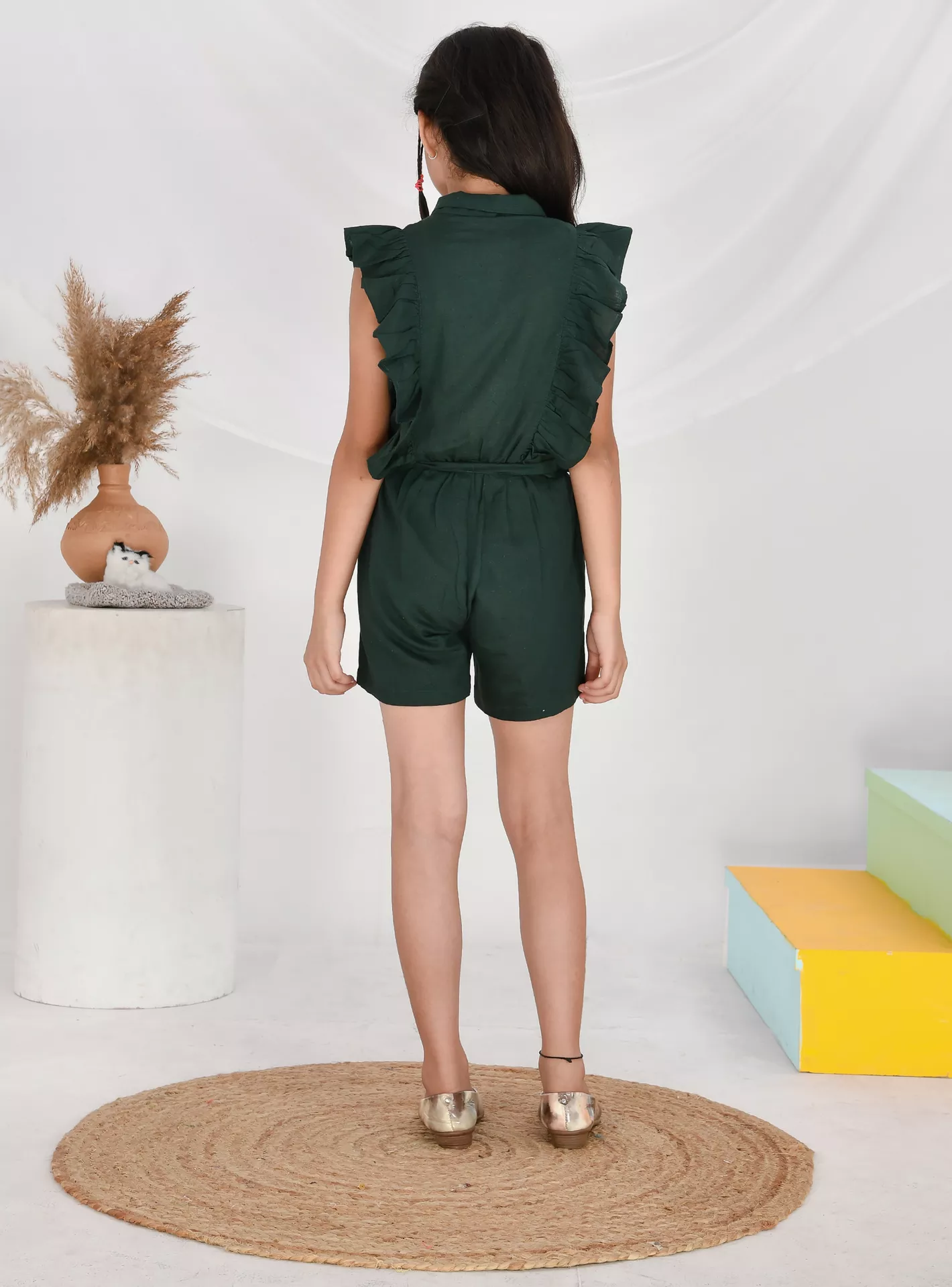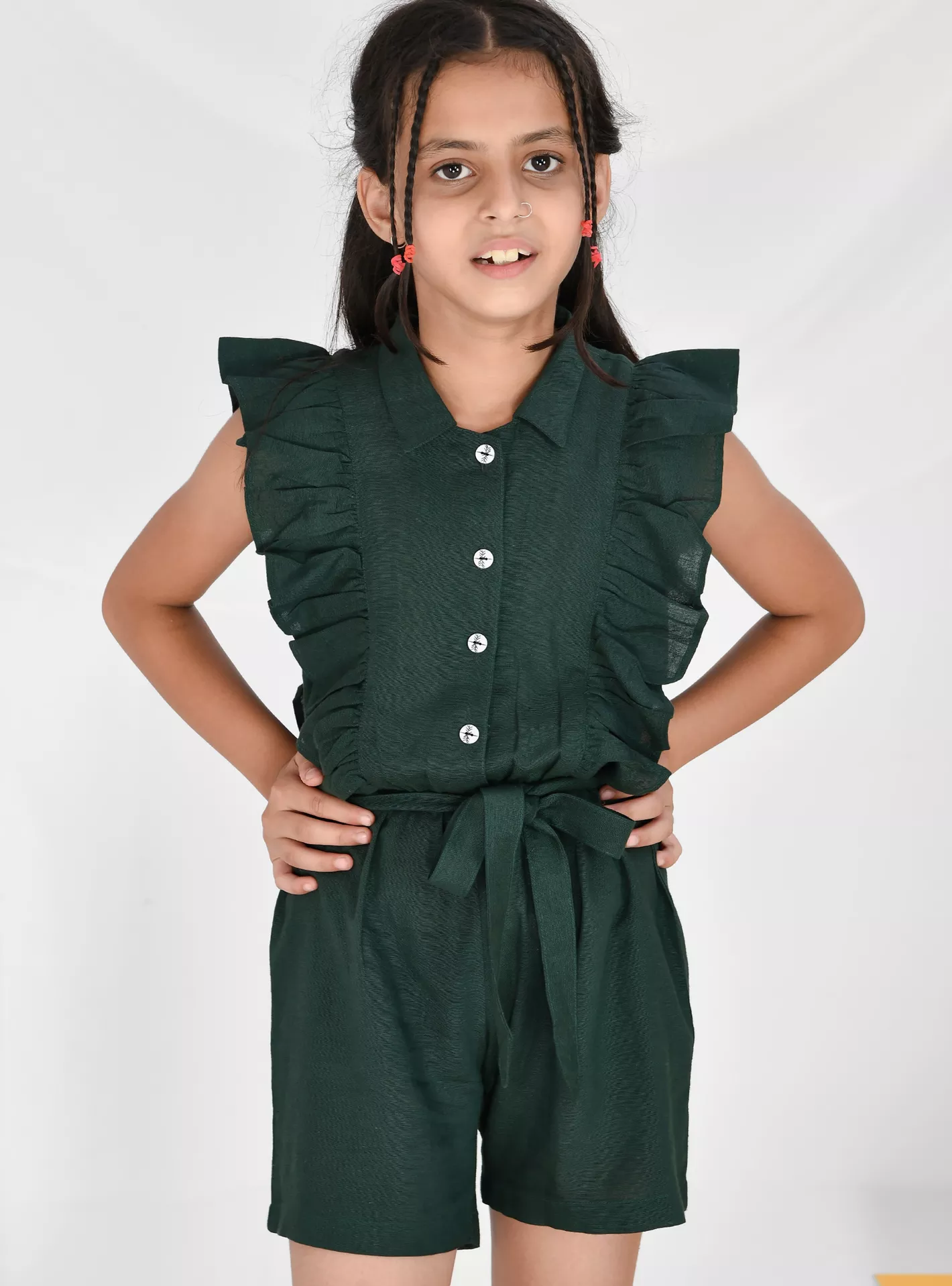 The Babyqlo Solid Jumpsuit is a girls’ one-piece outfit combining simplicity and comfort in a stylish way. It typically features a solid (plain) pattern without heavy prints, providing a versatile look that can be dressed up or down. The jumpsuit is made from a blend of rayon and cotton, giving it a soft, breathable feel that’s suitable for all-day wear.