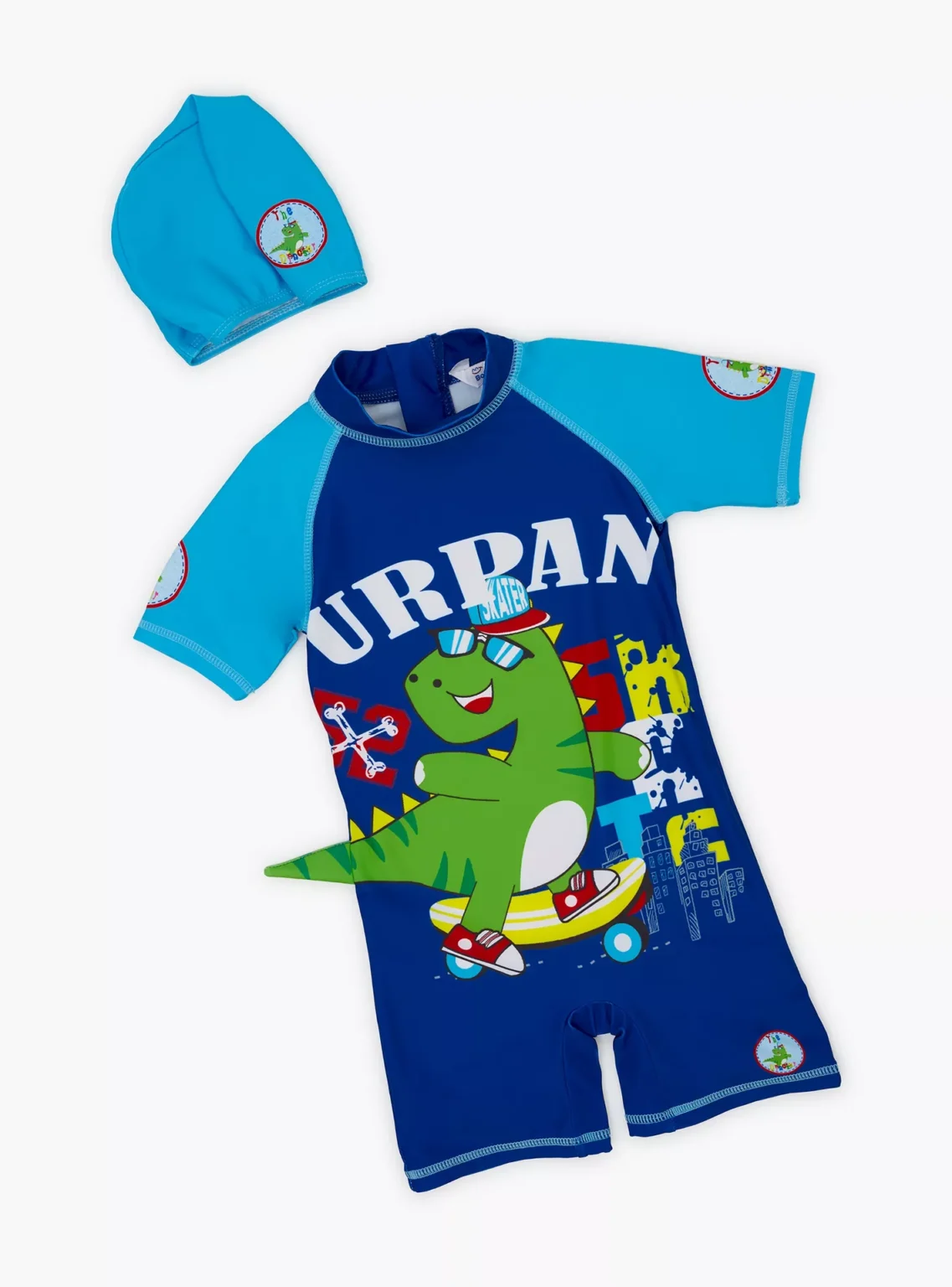 Babyqlo Urban Dino Printed Shorts Sleeves Swimwear Bodysuit with Cap