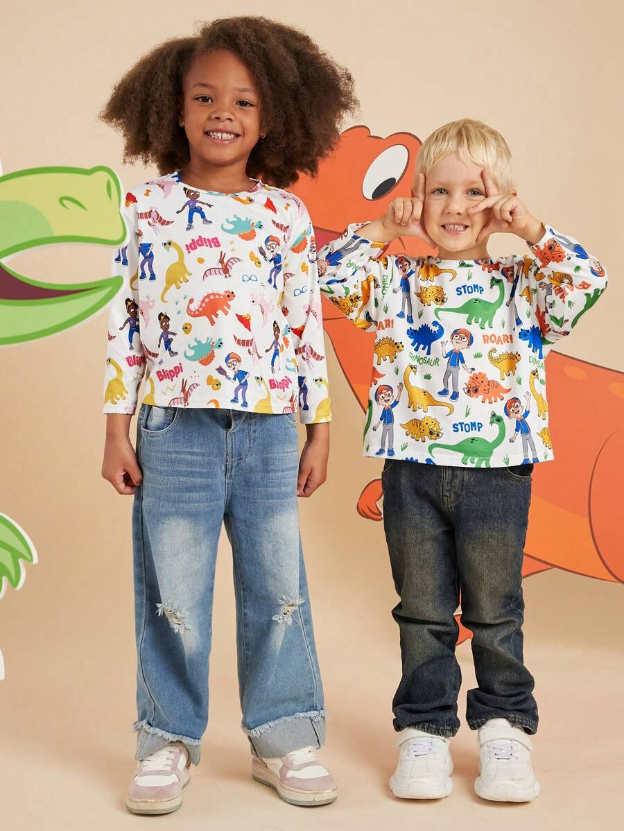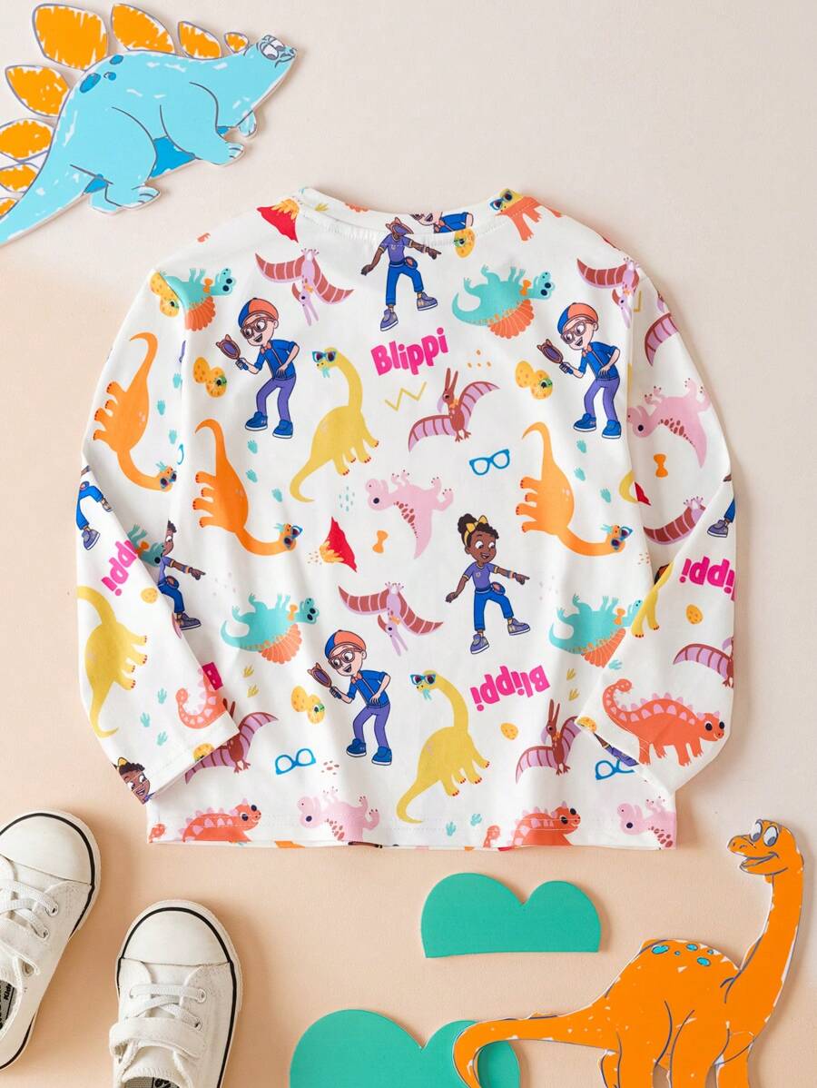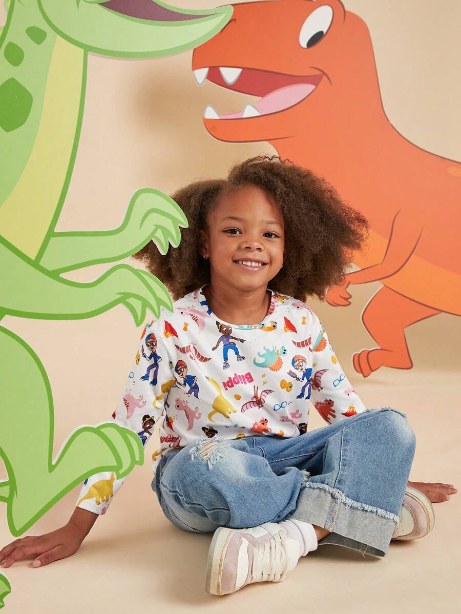 Blippi X SHEIN Young Girl Cartoon Dinosaur Print Cute Casual Long Sleeve T-Shirt