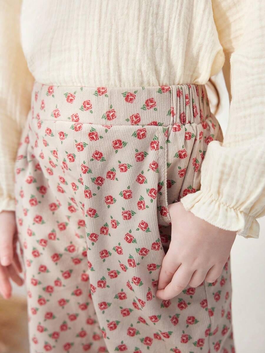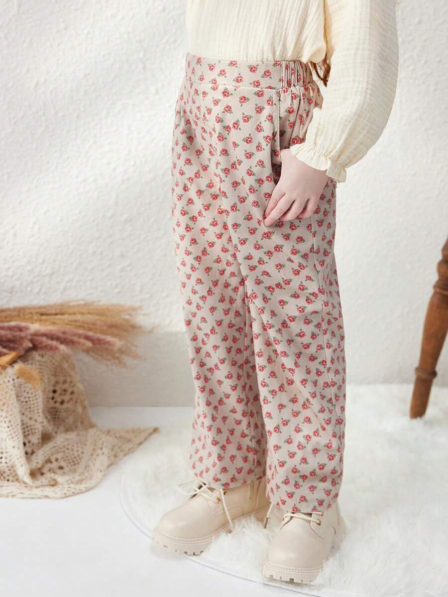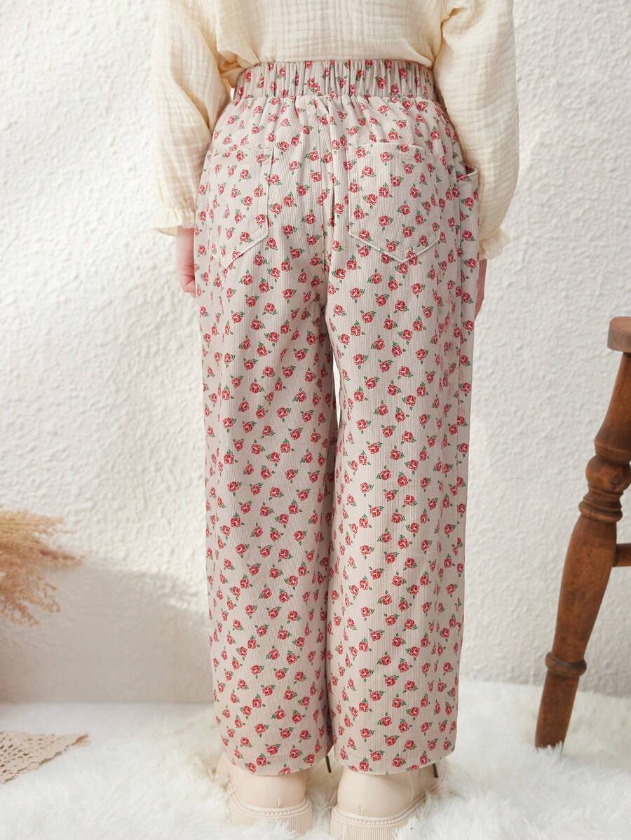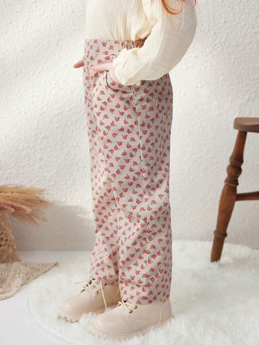 / Blossori Young Boys French Elegant Khaki Ditsy Floral Slim Fit Elastic Waist Pants, Autumn/Winter
