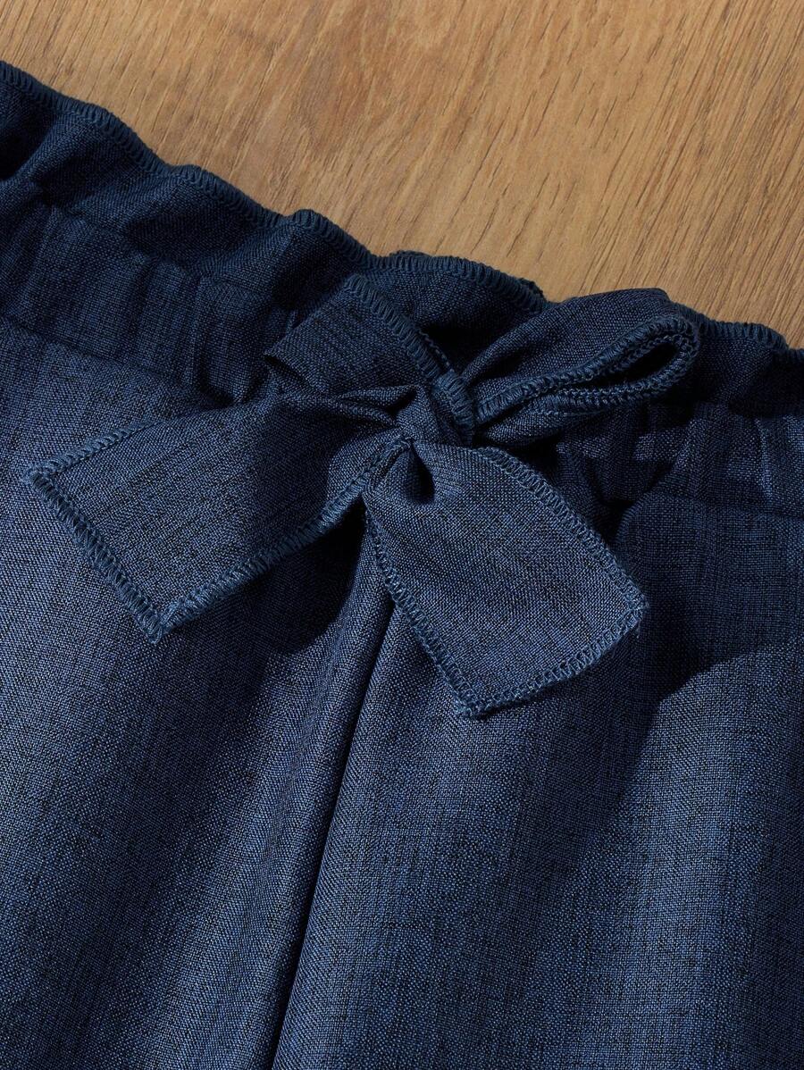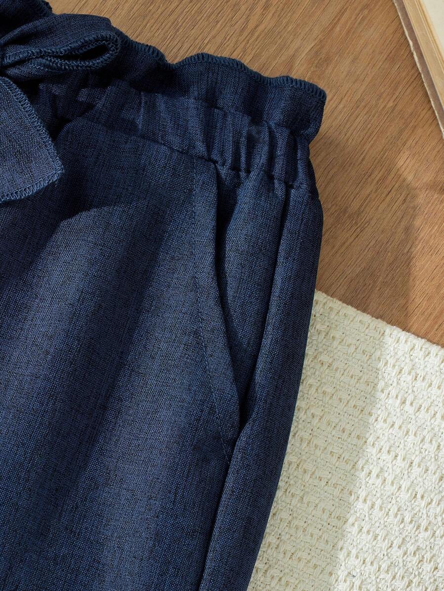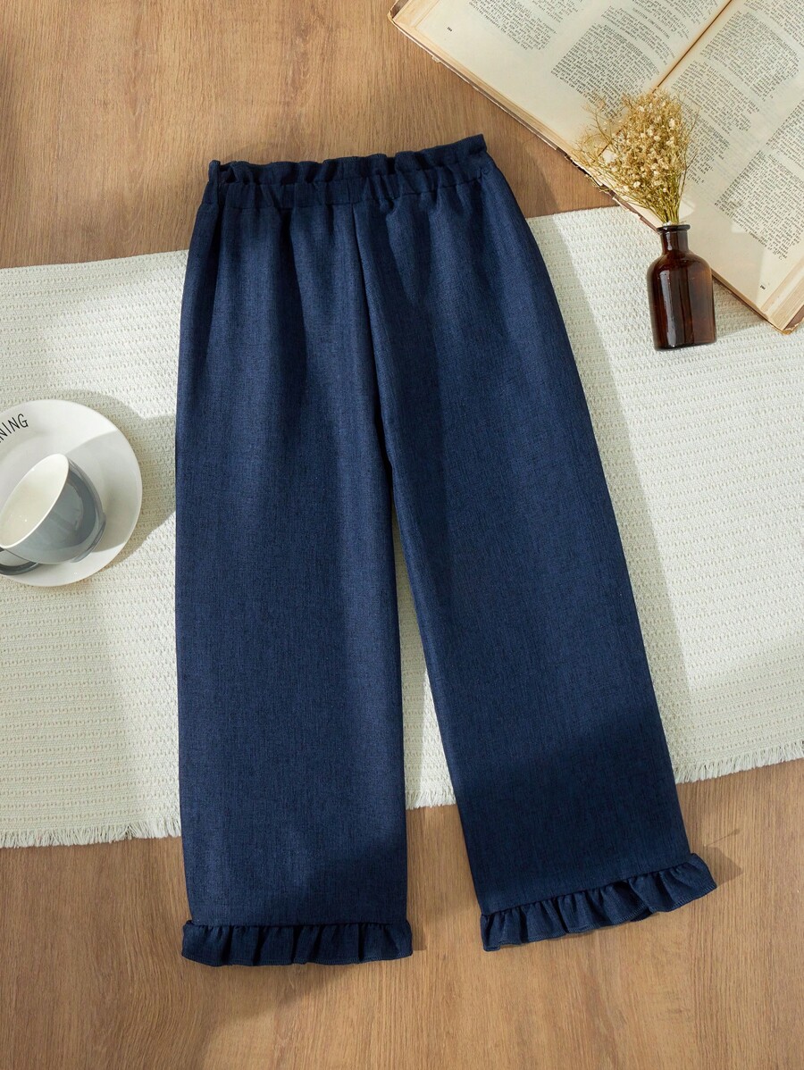 Blossori Young Girls French Elegant Navy Blue Woven Loose Elastic Waist Pants, Autumn/Winter