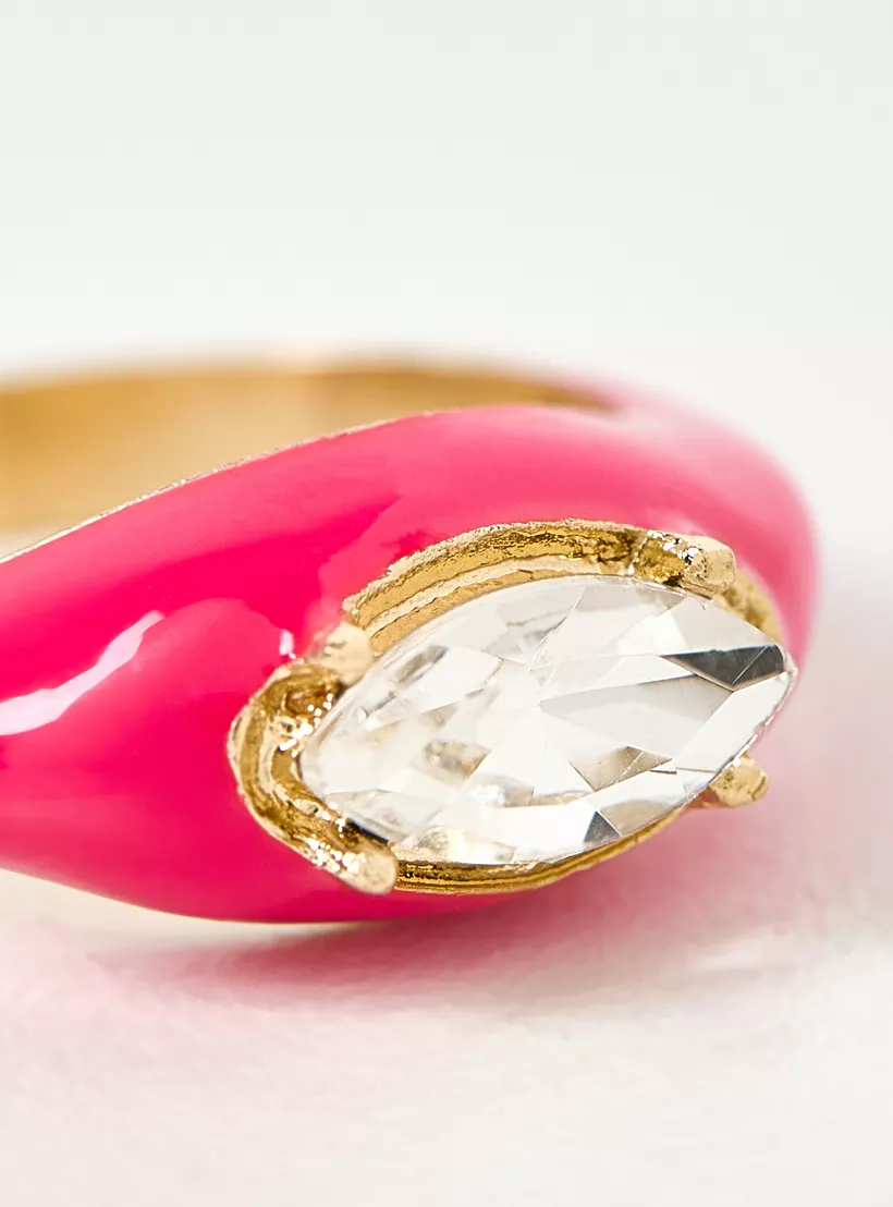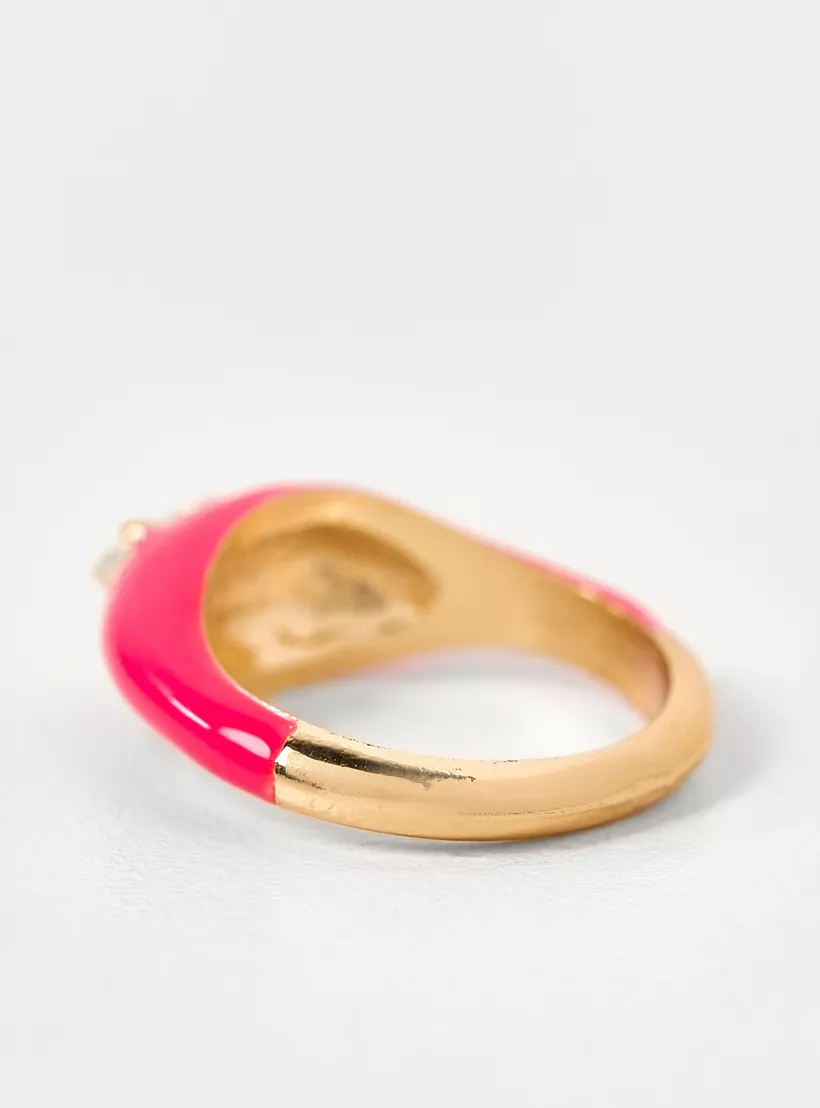 Sparkling Embellishments: The ring is accented with small, set stones—typically clear or colored rhinestones or cubic zirconia—to provide sparkle and contrast against the matte or glossy enamel.