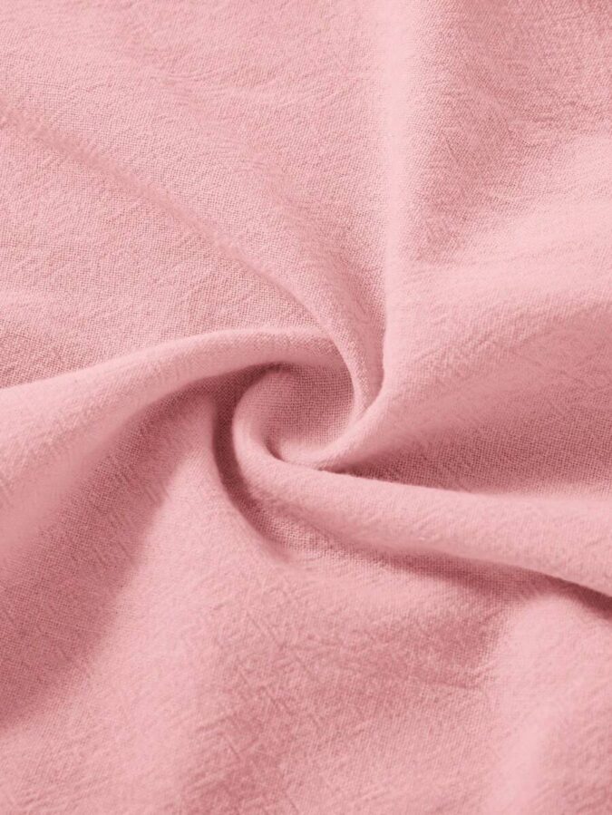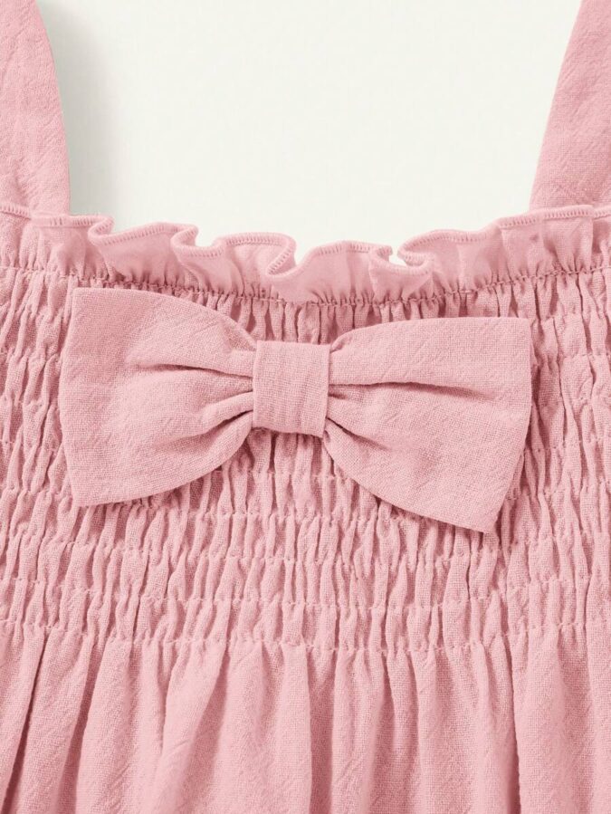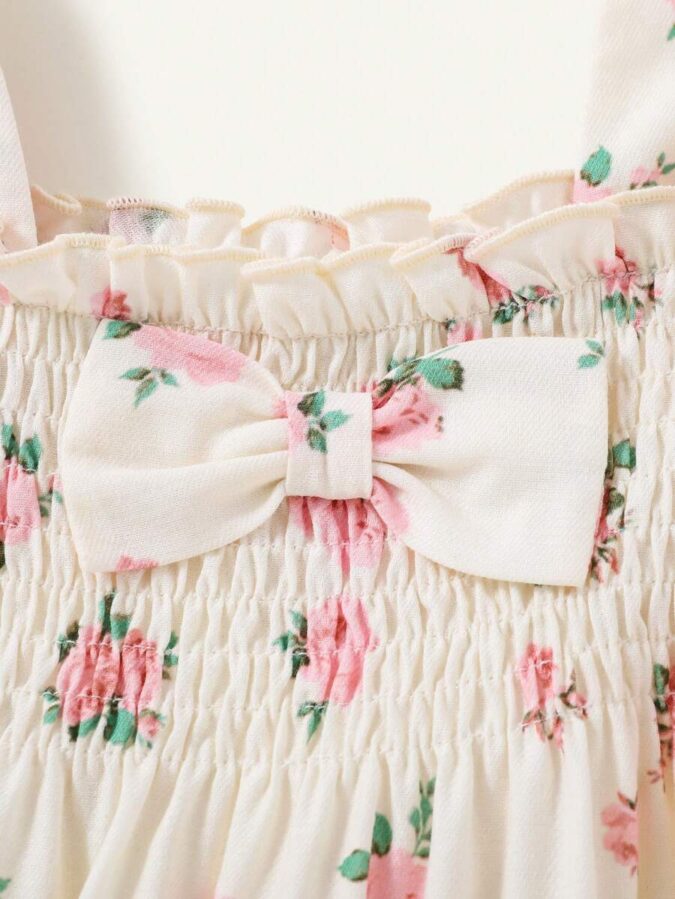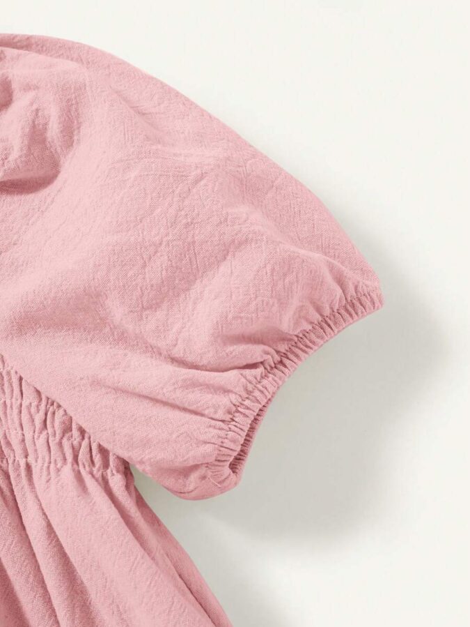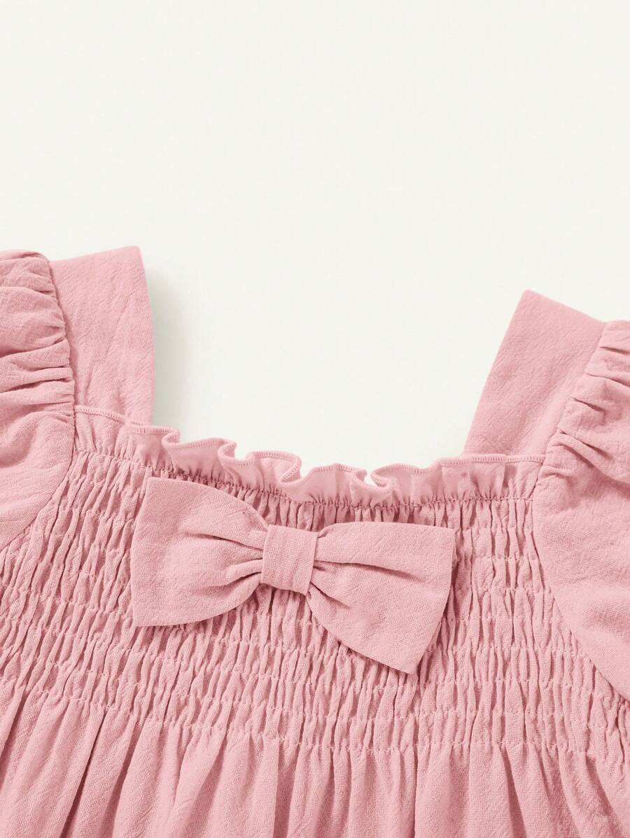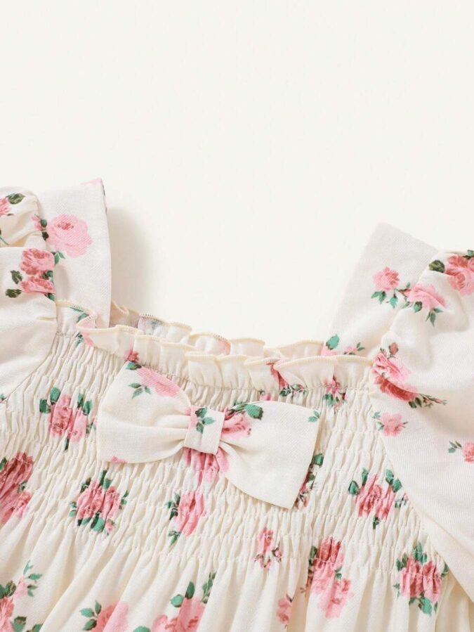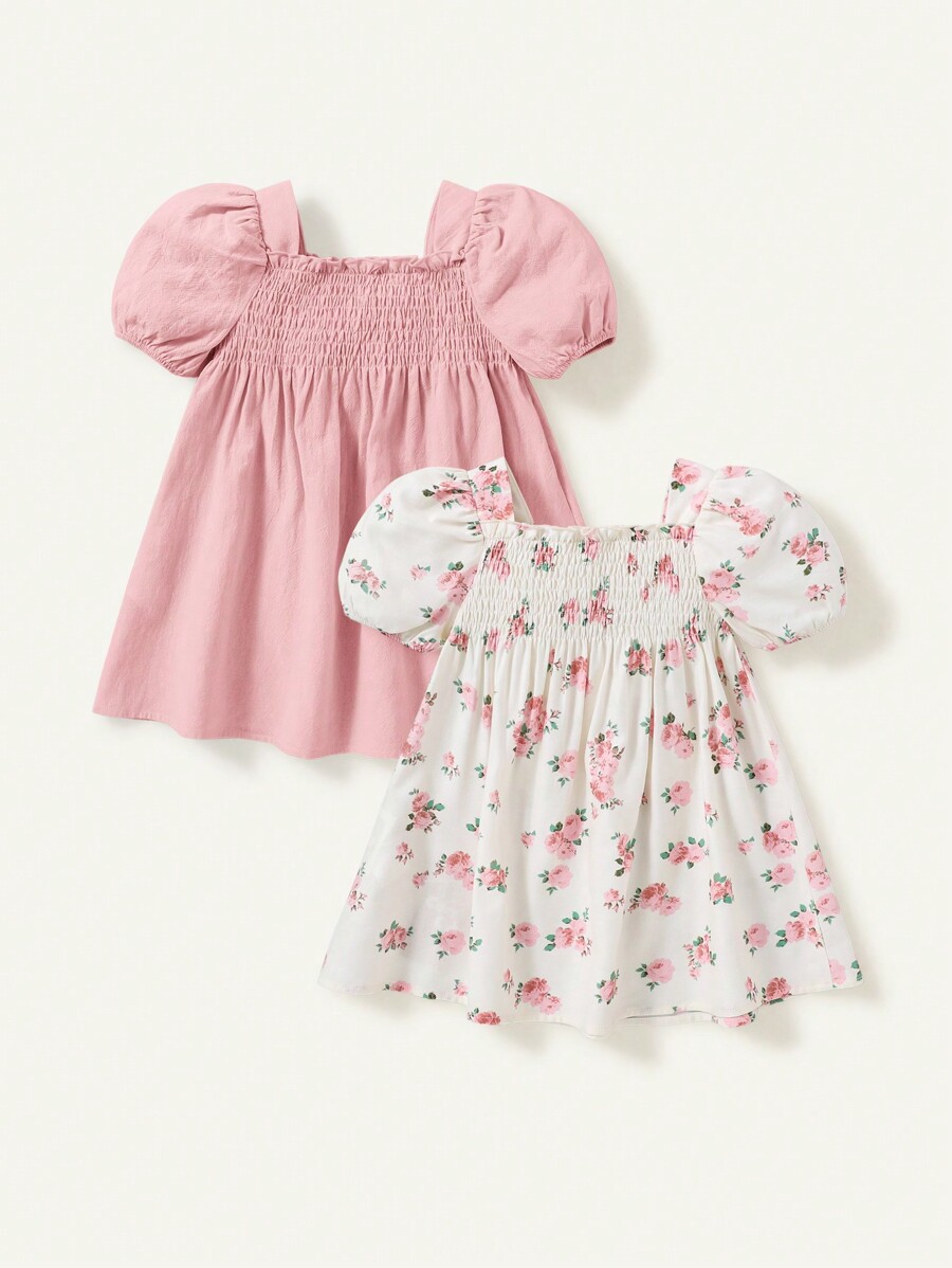 / Cozy Pixies Baby Girl Solid Color With Floral Pattern Bubble Sleeves Dress With Bow Decoration, Square Neck And Gathered Waist, 2pcs/Set