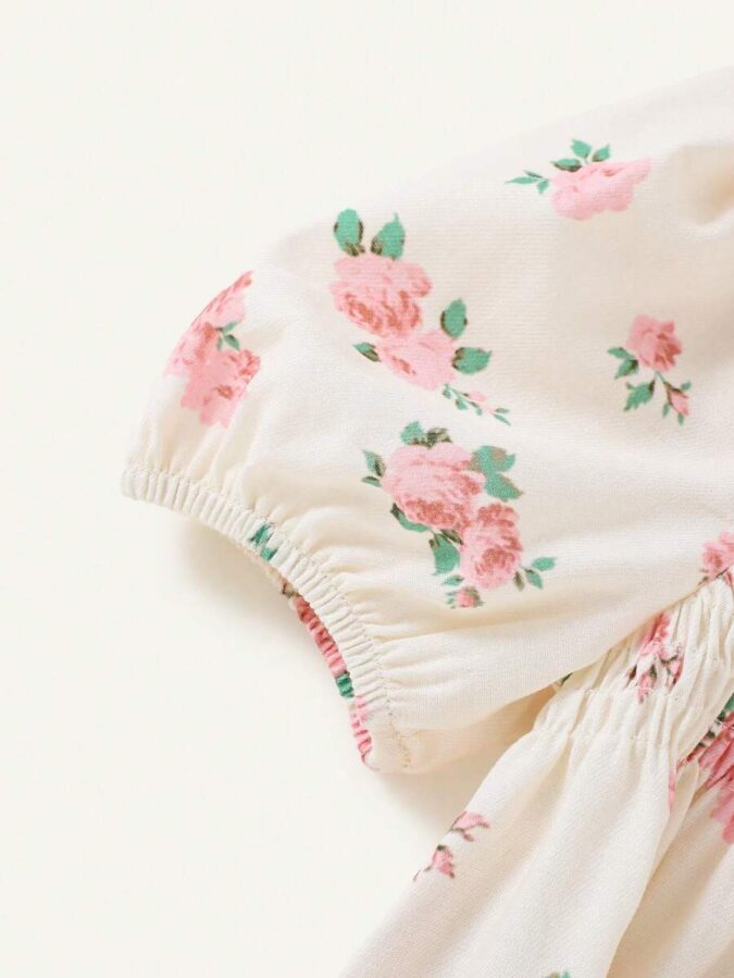 Cozy Pixies Baby Girl Solid Color With Floral Pattern Bubble Sleeves Dress With Bow Decoration, Square Neck And Gathered Waist, 2pcs/Set quantity