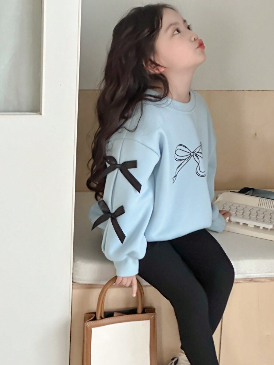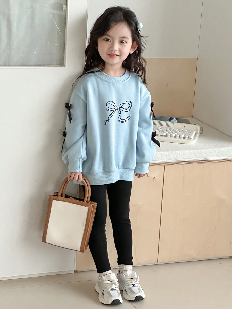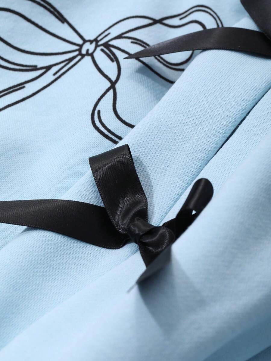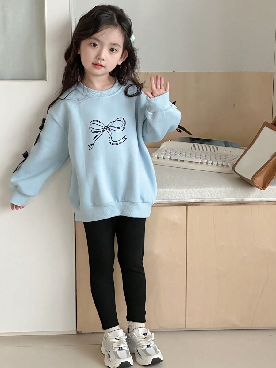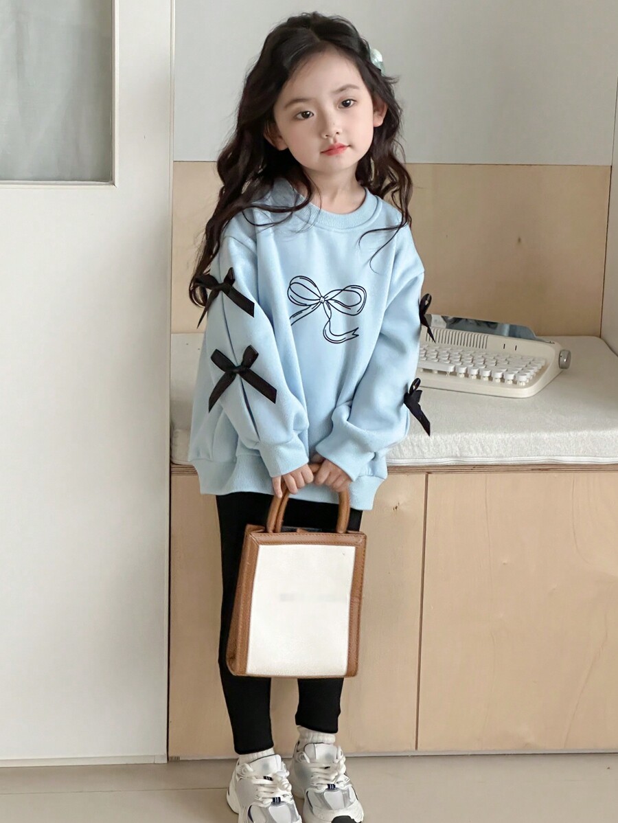 DAZY 2pcs Young Girl Round Neck Knit Bow & Printed Two-Piece Set, Fall