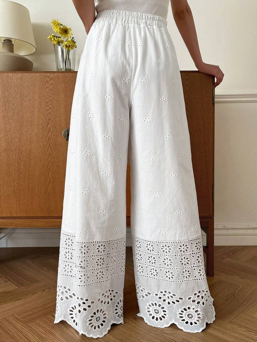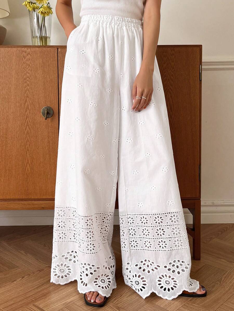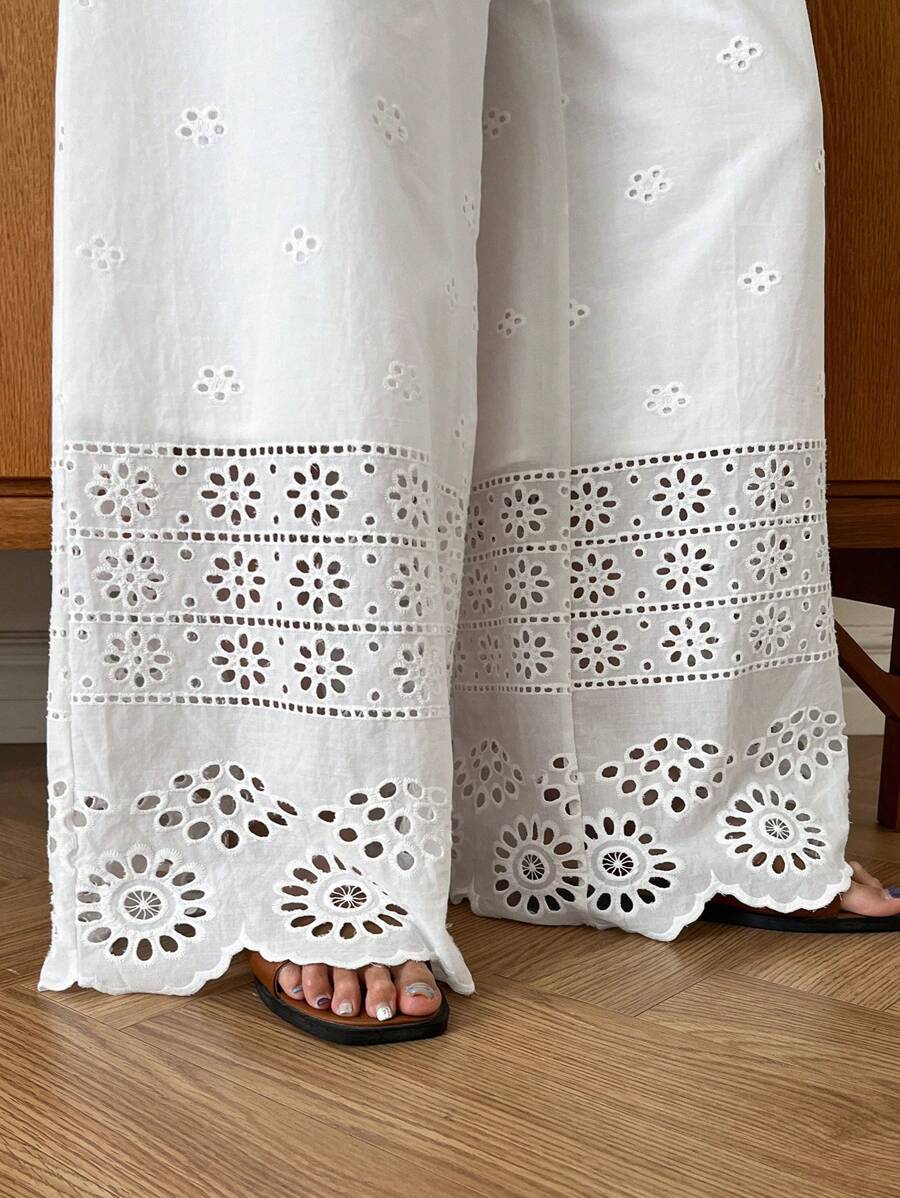 / DAZY Ladies Casual Solid Color Hollow Embroidery Wide Leg Pants