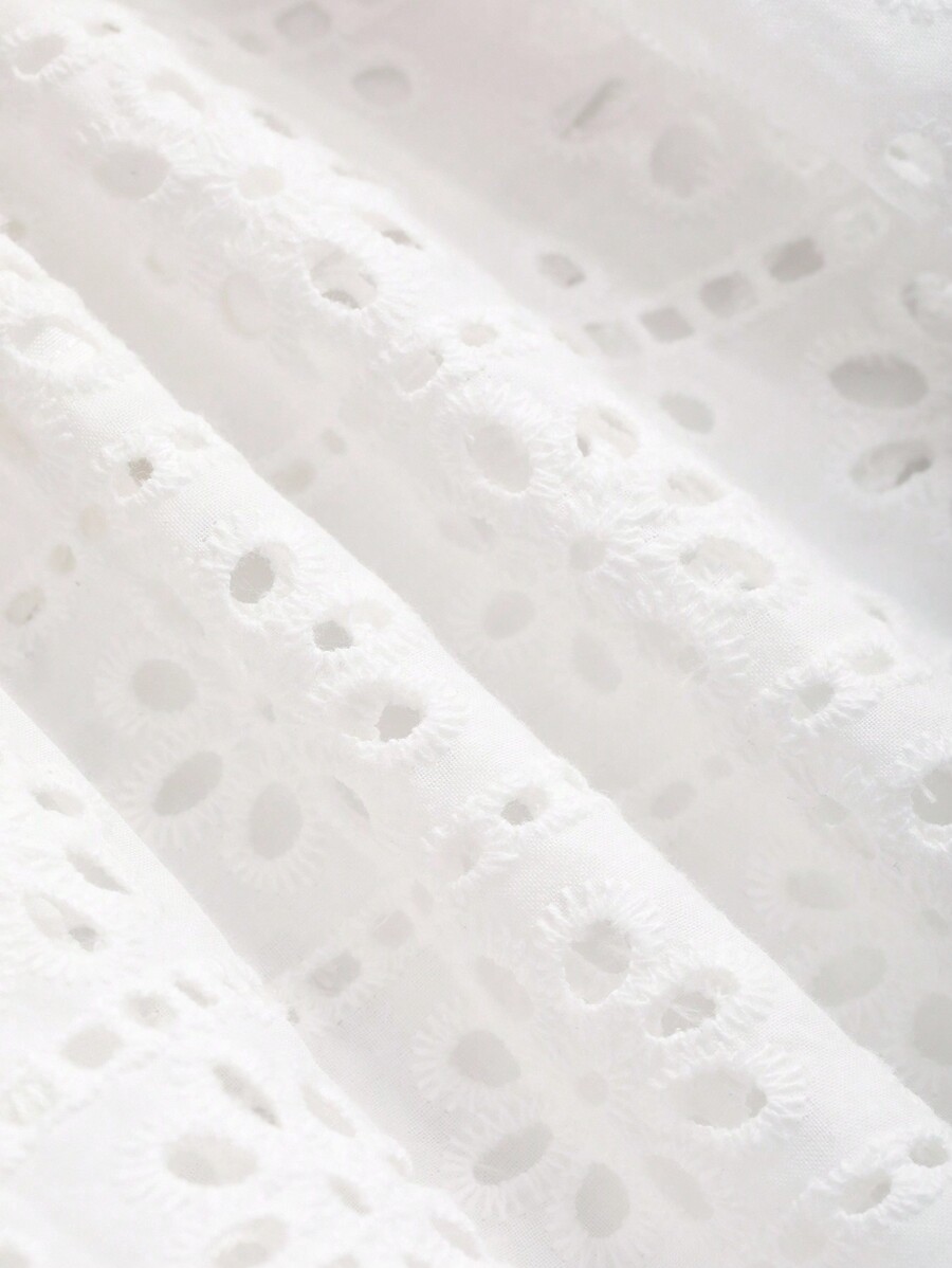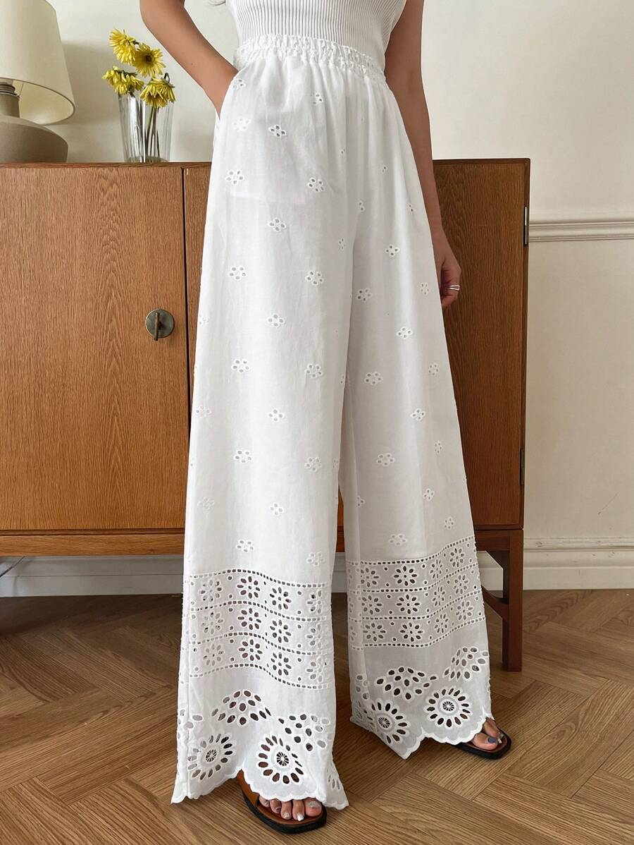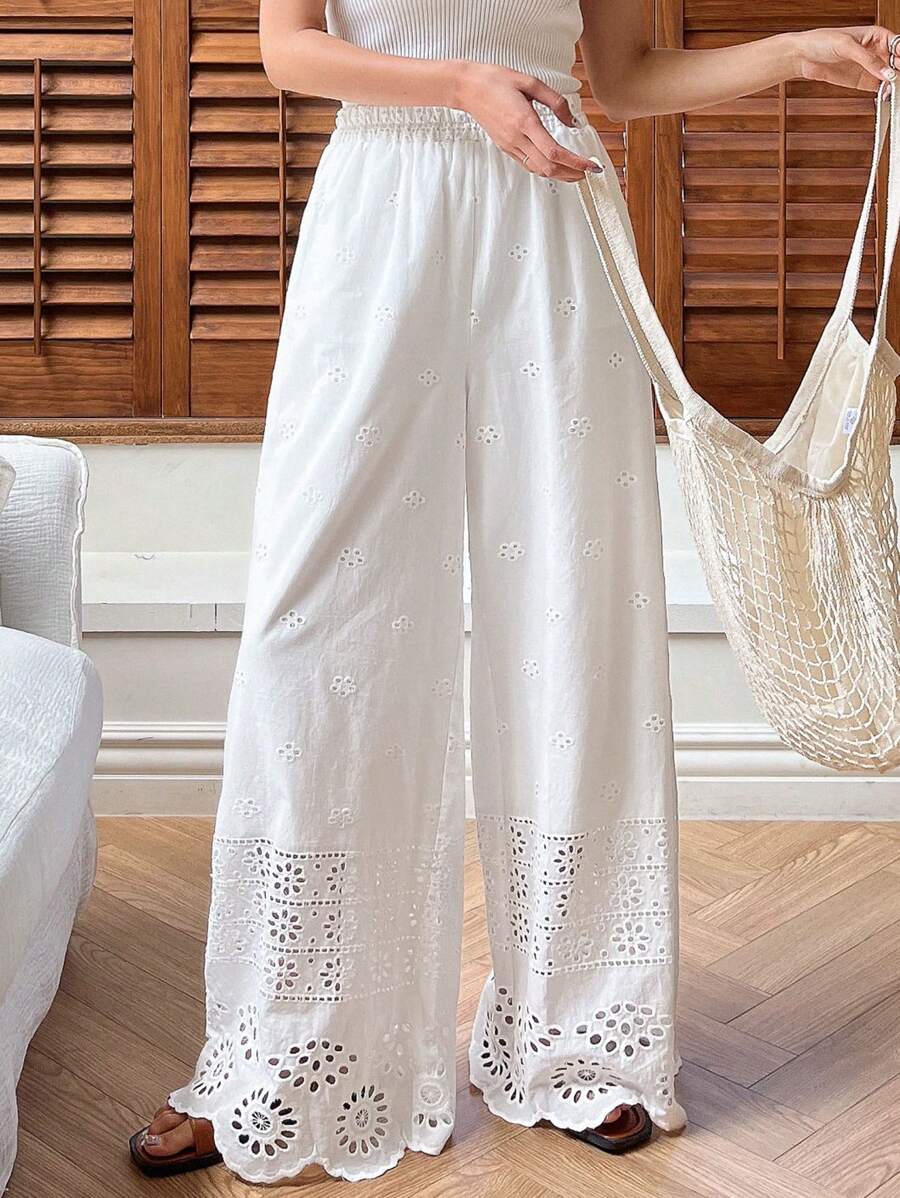 / DAZY Ladies Casual Solid Color Hollow Embroidery Wide Leg Pants