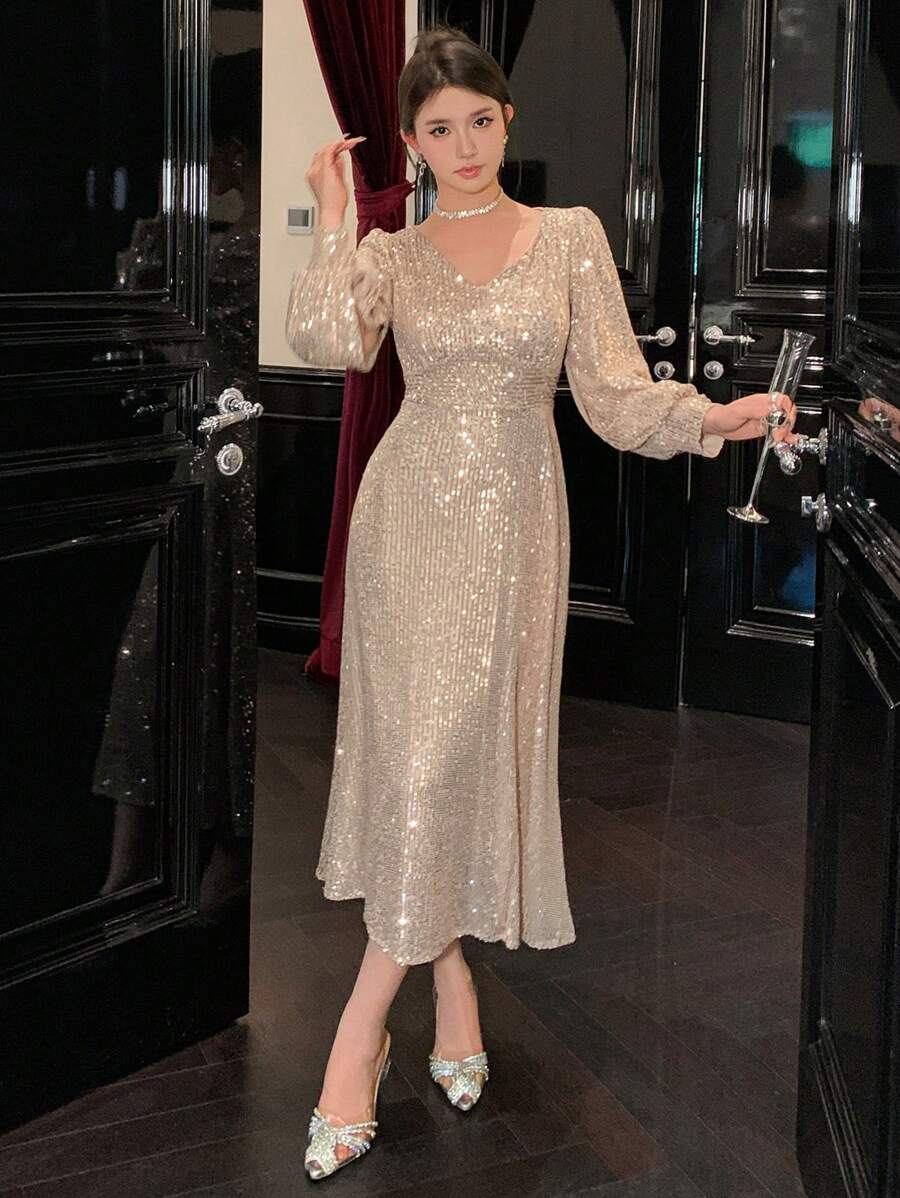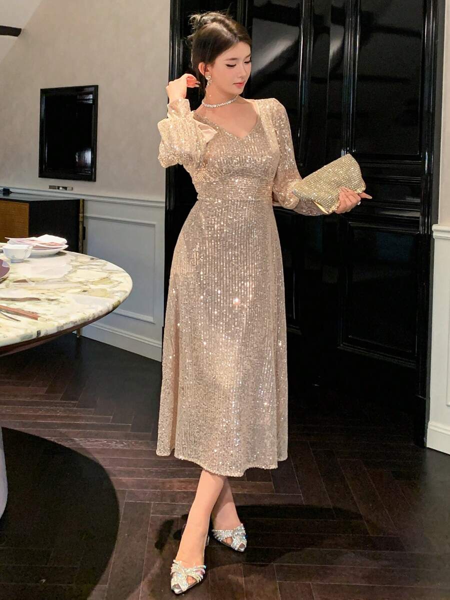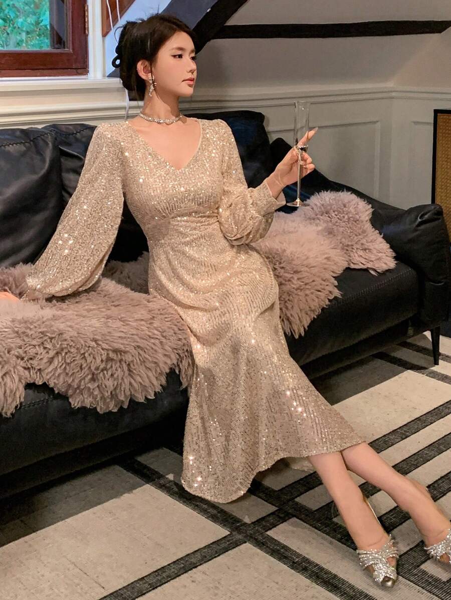 / DAZY Solid Color V-Neck Sequin Long Sleeve Mid-Length Women Dress ,New Year Eve