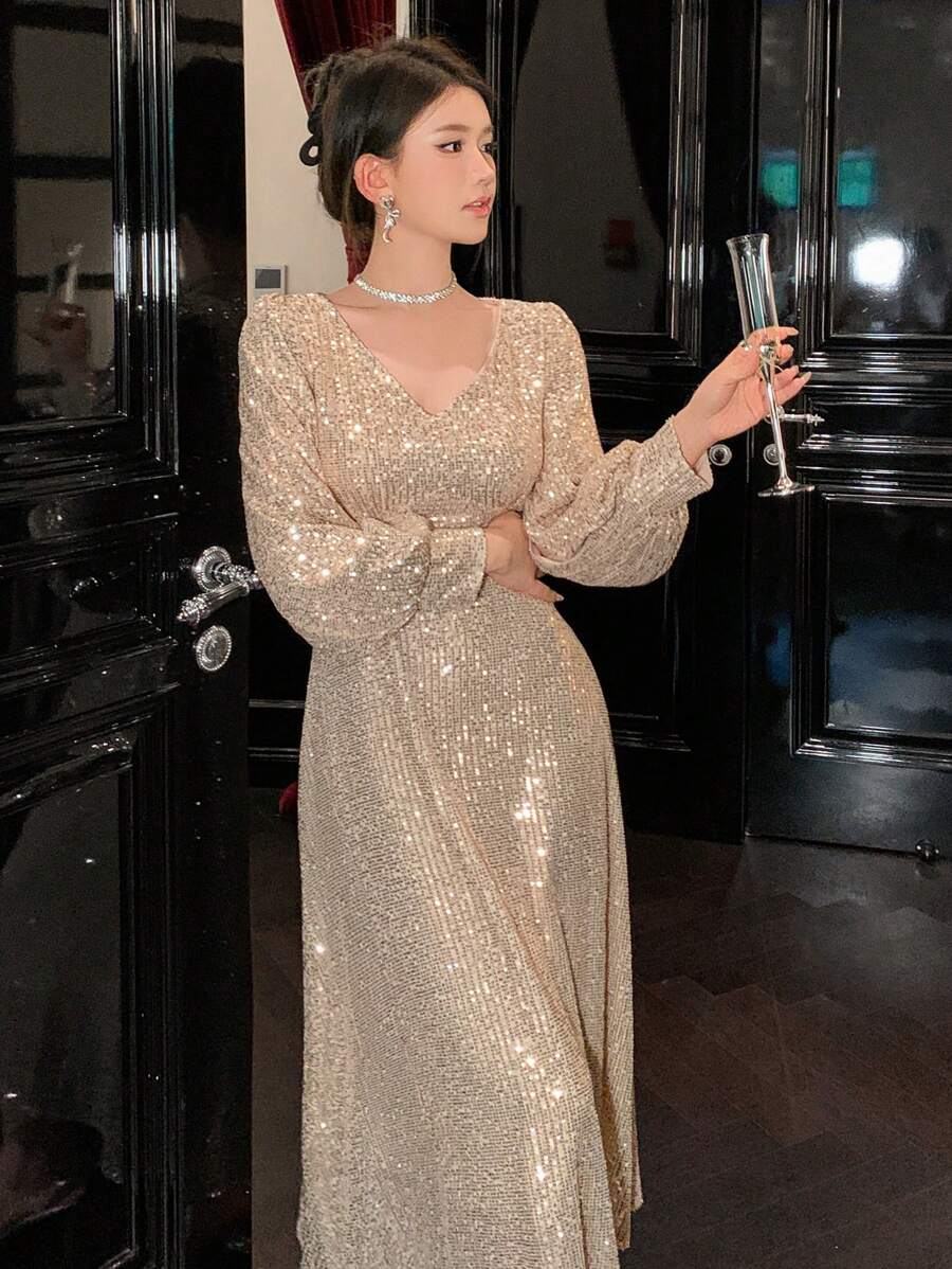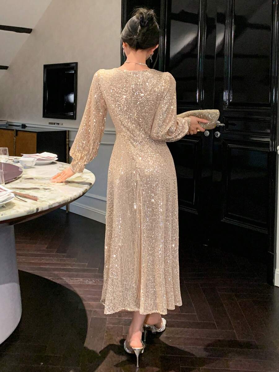 DAZY Solid Color V-Neck Sequin Long Sleeve Mid-Length Women Dress ,New Year Eve
