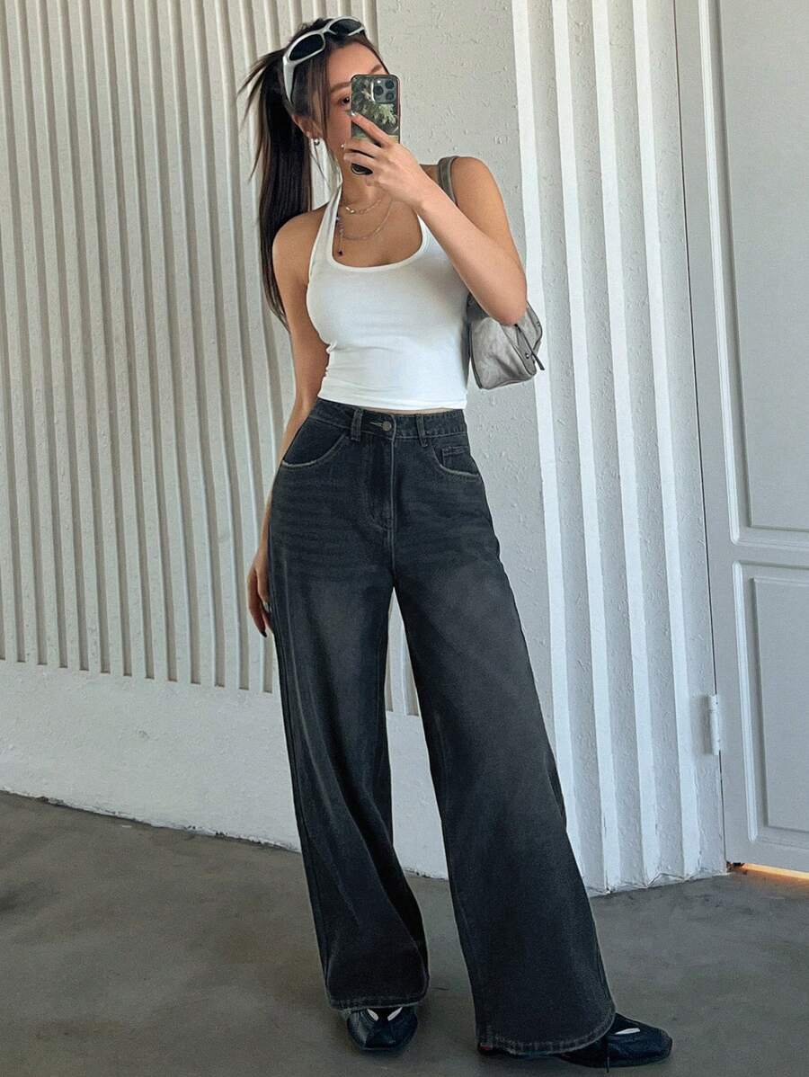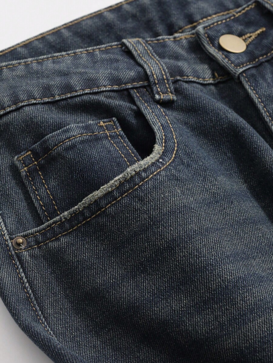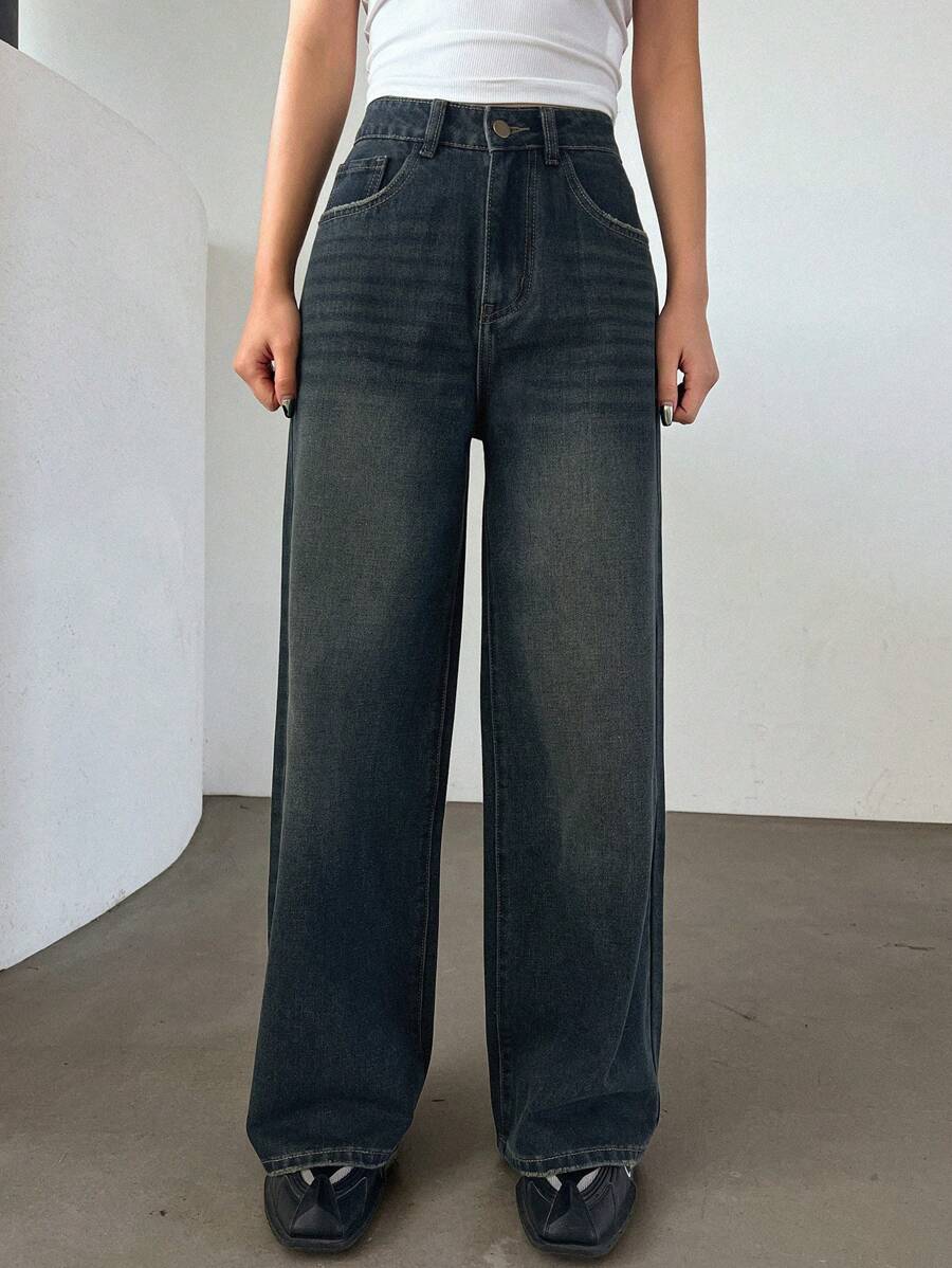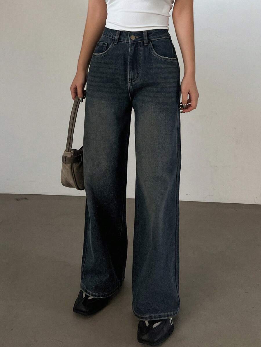 DAZY Women’s Vintage Distressed Washed Cat Whisker Fading Full-Length Wide Leg Jeans