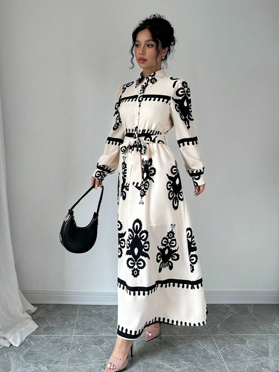Elenzga Women’s Stylish Commuter Long Sleeve Turn-Down Collar Printed Shirt Dress