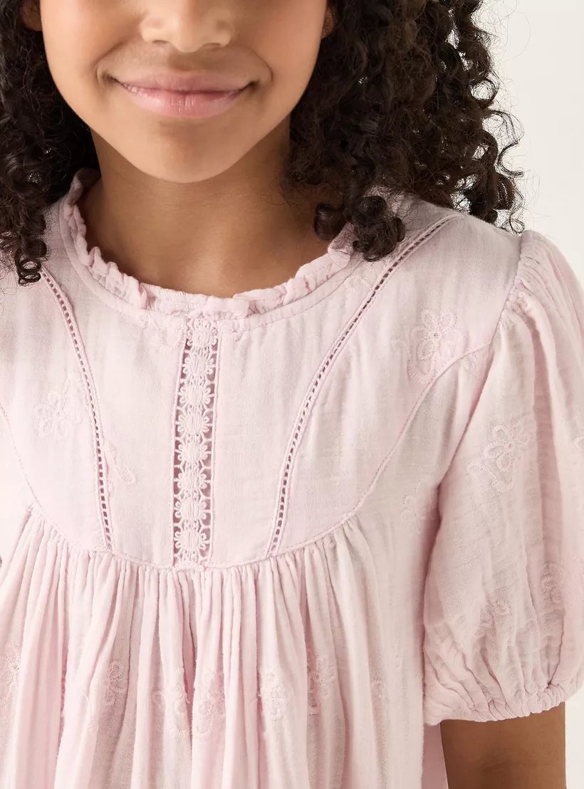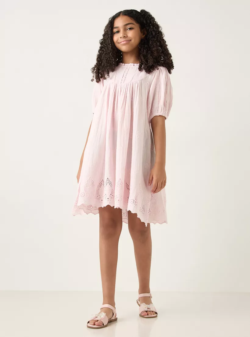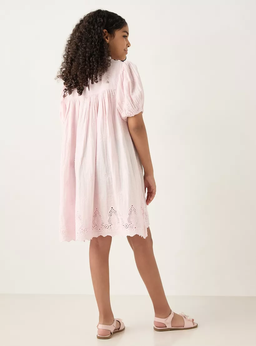 Eligo All-Over Floral Embroidered A-Line Dress with Schiffli Hem and Short Sleeves