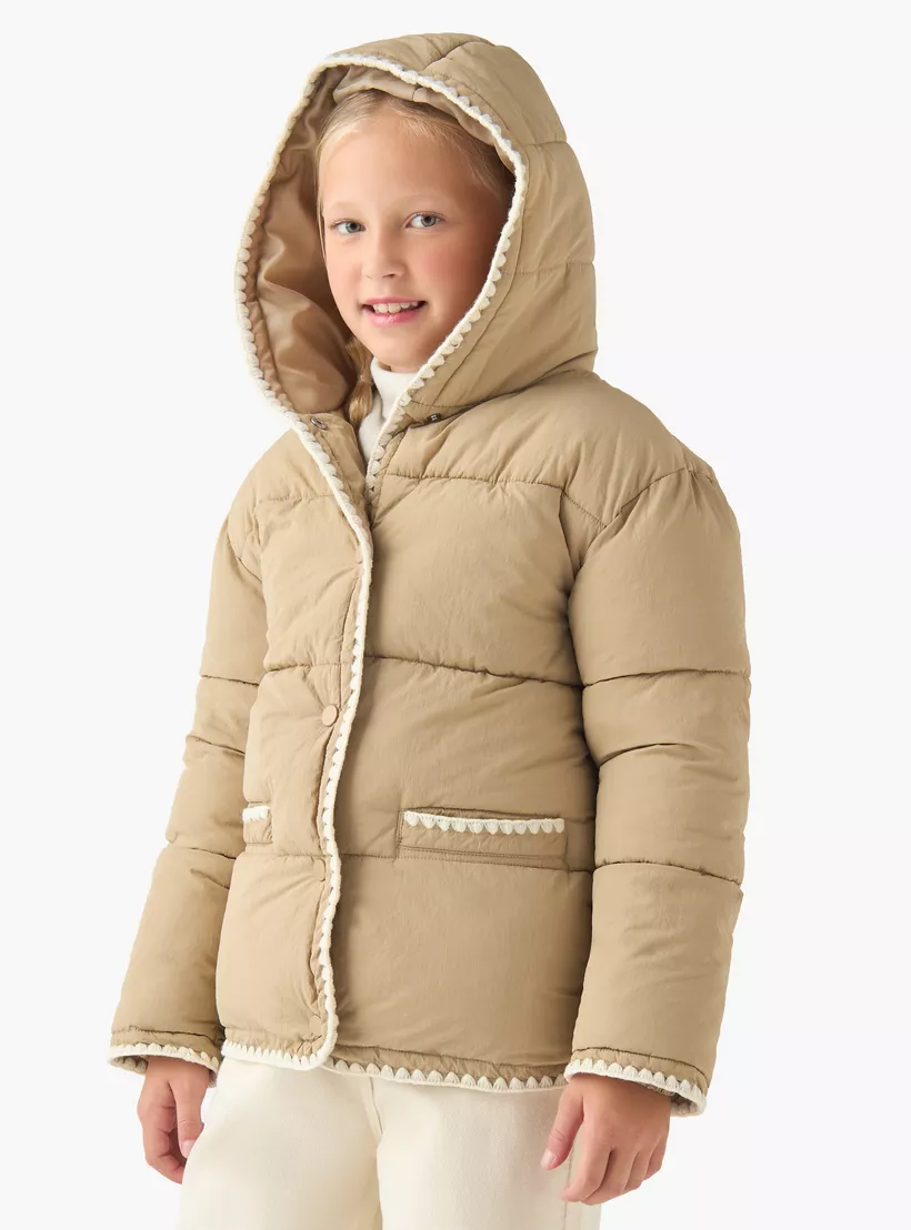 Eligo Scalloped Trim Puffer Heavy Jacket with Hood and Button Closure