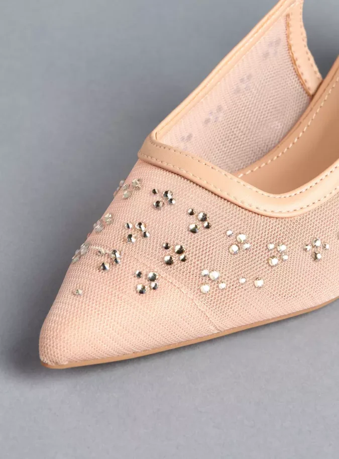 Embellishment Detail: Decorative elements (rhinestones, crystals, metallic studs, beads) across the upper and/or strap to catch the light and draw attention. (For instance: an option described as “Gold Embellished Evening Heels … featuring a secure ankle strap with buckle closure, and a comfortable low kitten heel.”)