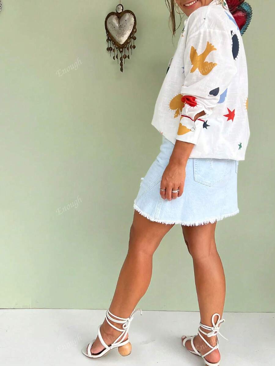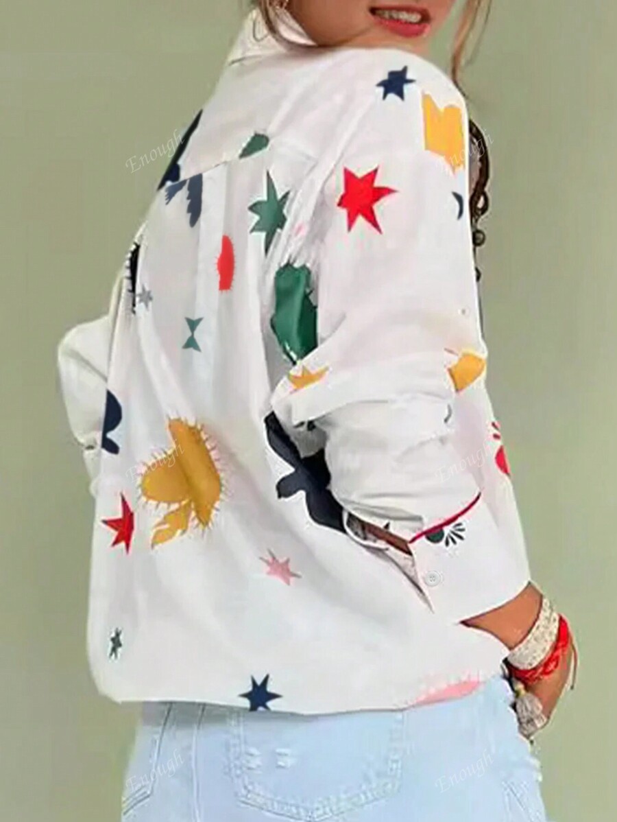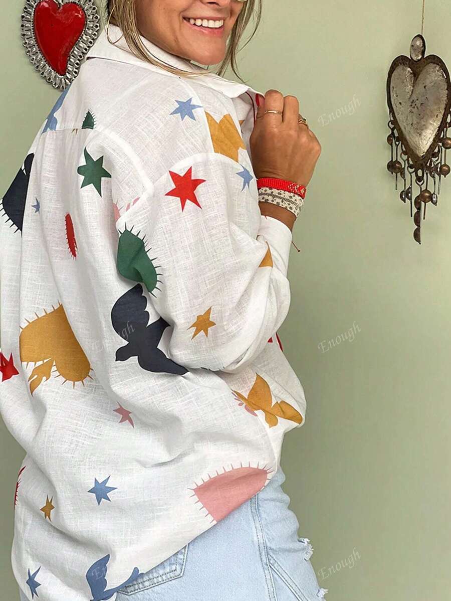 Fashion Oversized Textured Fabric Stand-Up Collar Love Hearts Stars Birds Prints Red Trimmed Women’s Shirt,Long Sleeve Tops
