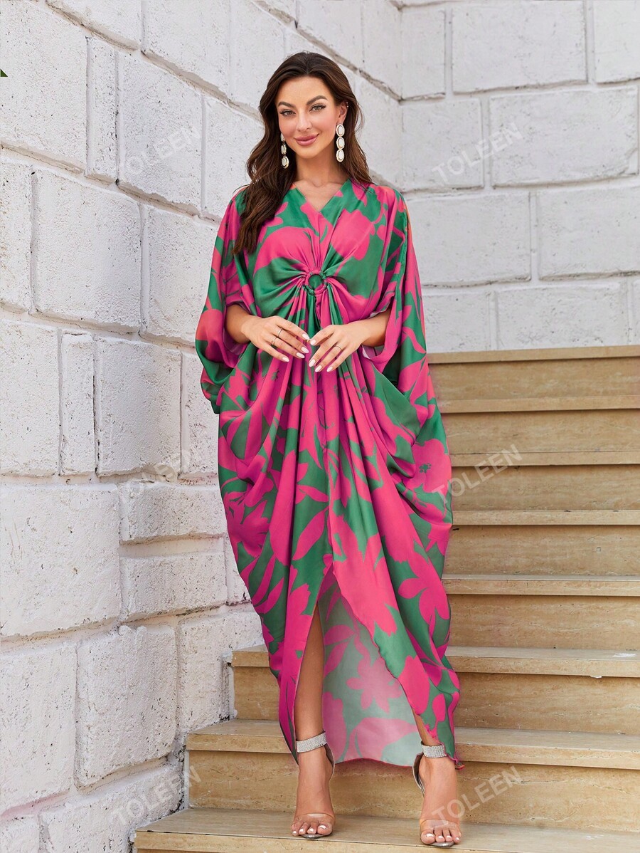 Floral Print Batwing Sleeve O-Ring Detail Asymmetrical Hem Modest Long Sleeve Dress