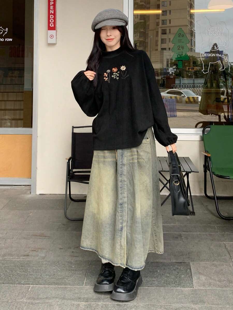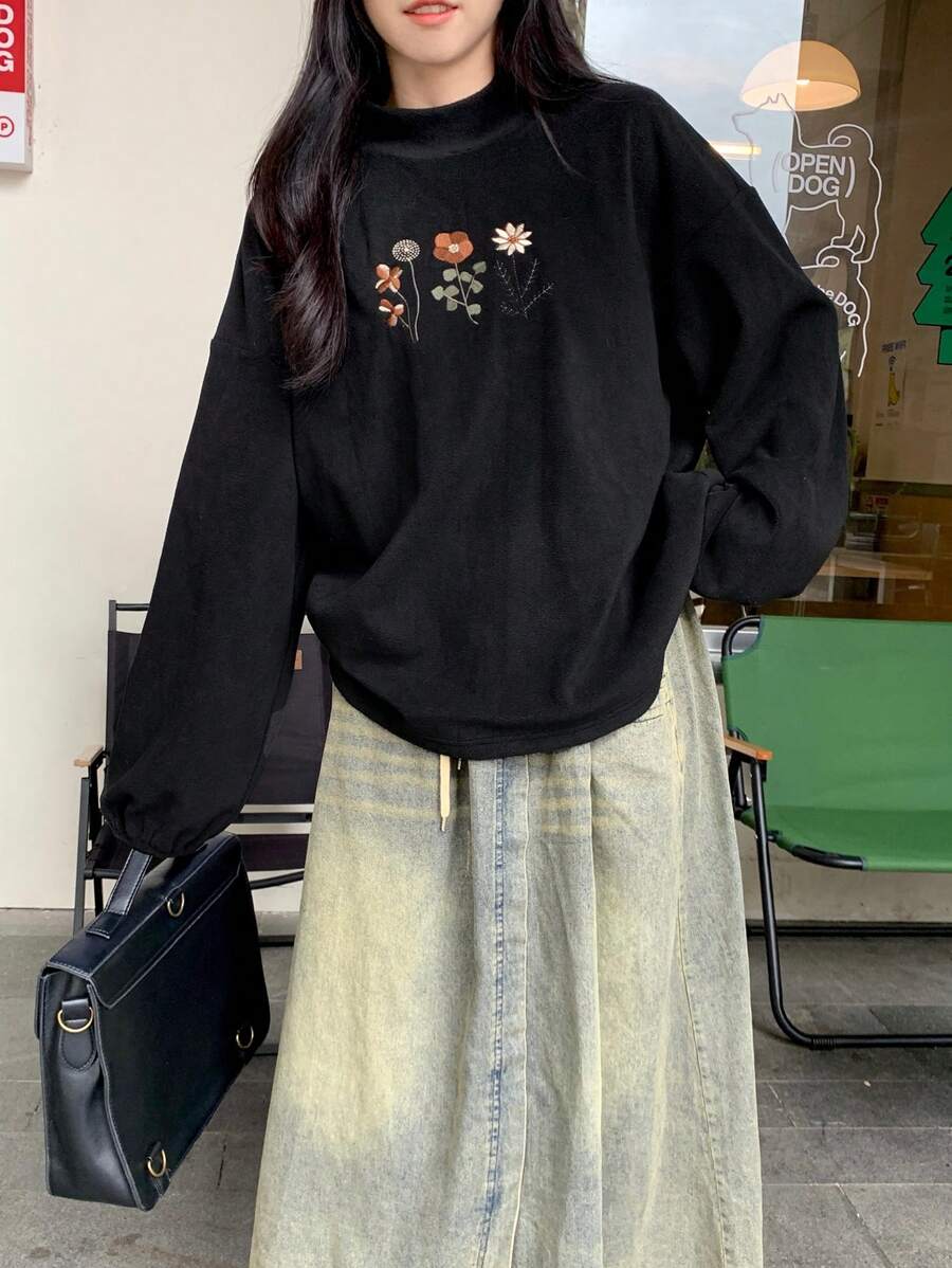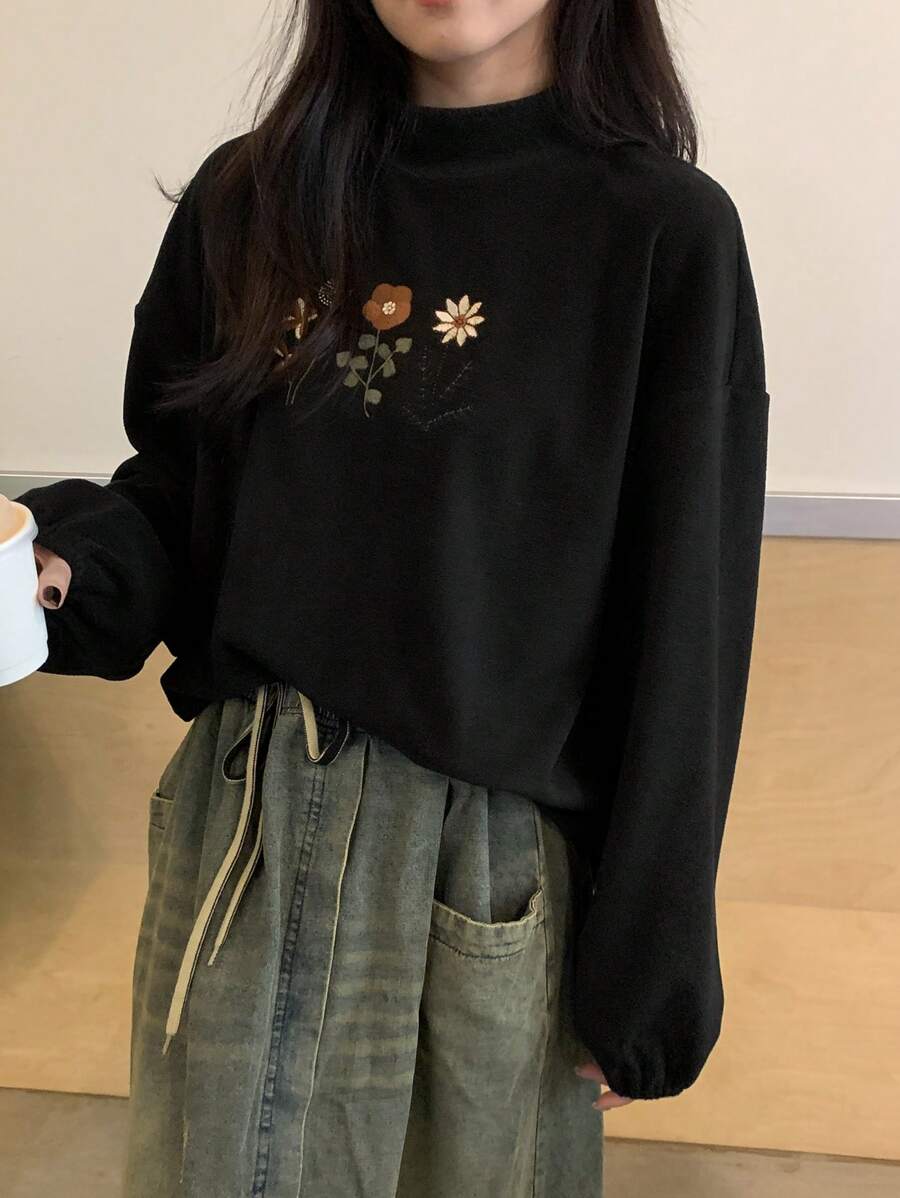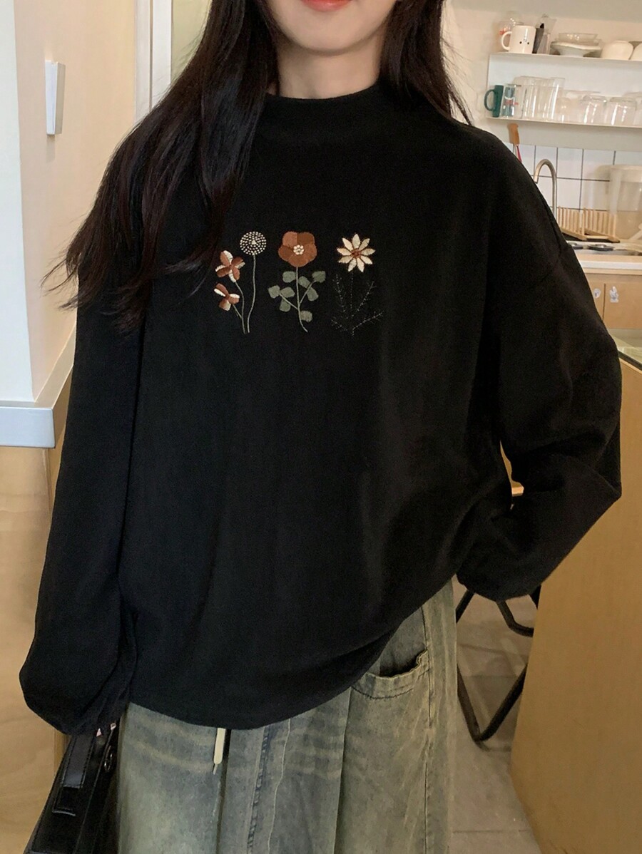 FRIFUL Women Floral Embroidery Round Neck Drop Shoulder Long Sleeve Casual T-Shirt, Autumn