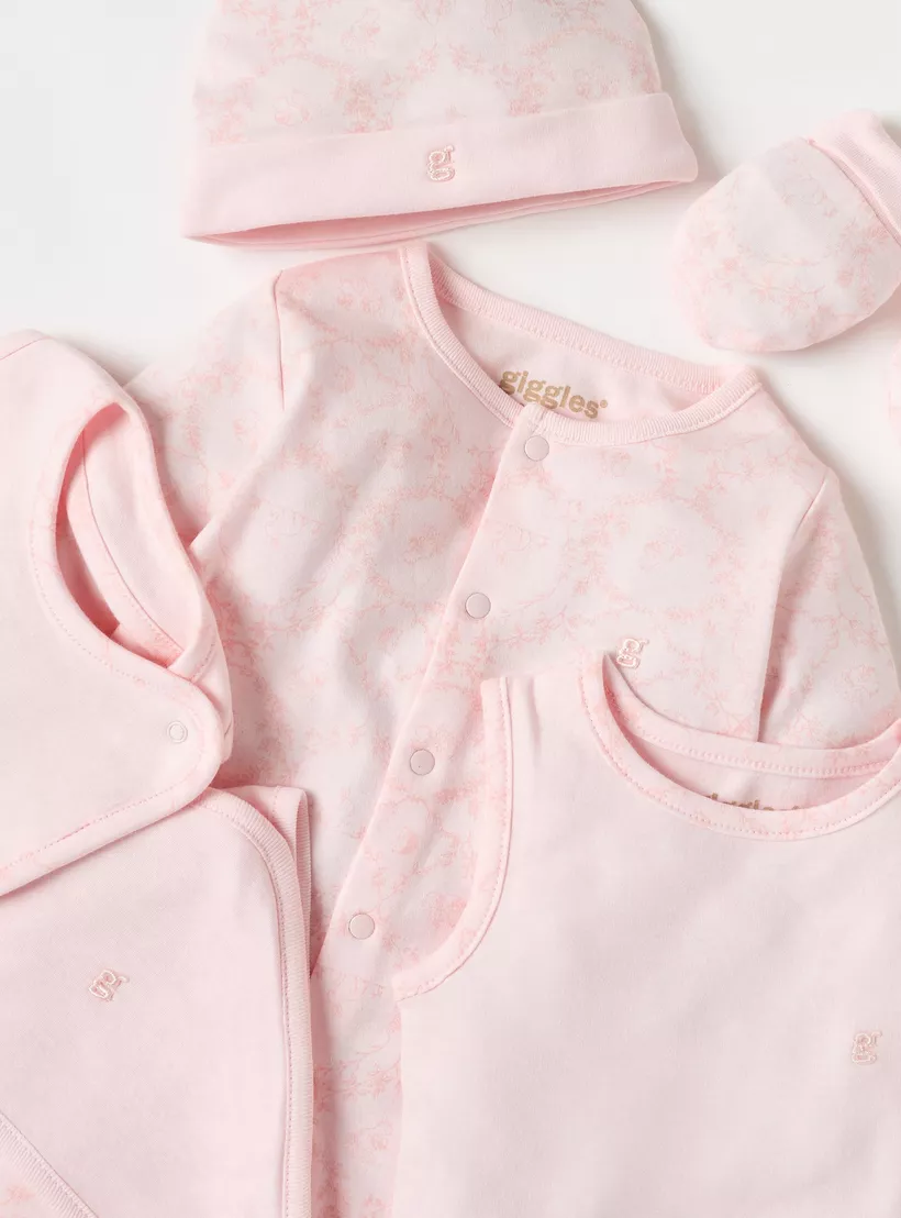 This adorable gift set is perfect for any baby girl. The set includes six pieces, all made from soft and comfortable cotton. The set includes a variety of pieces, including bodysuit, cap and a bib. The set is perfect for everyday wear or for special occasions.
